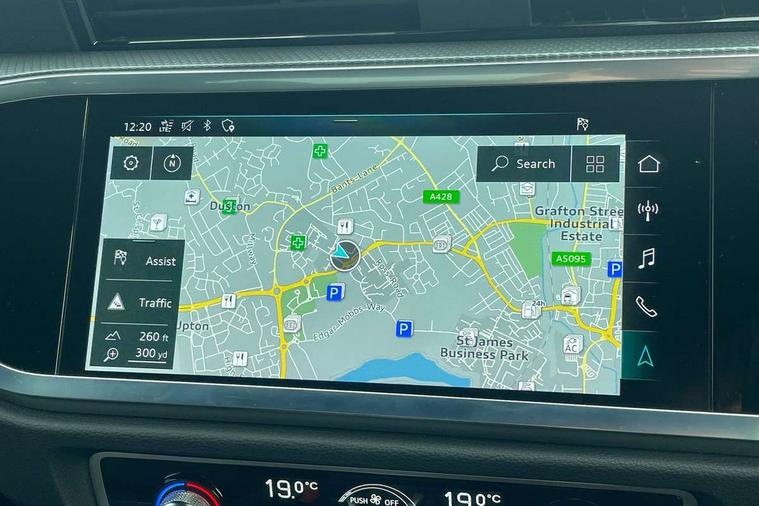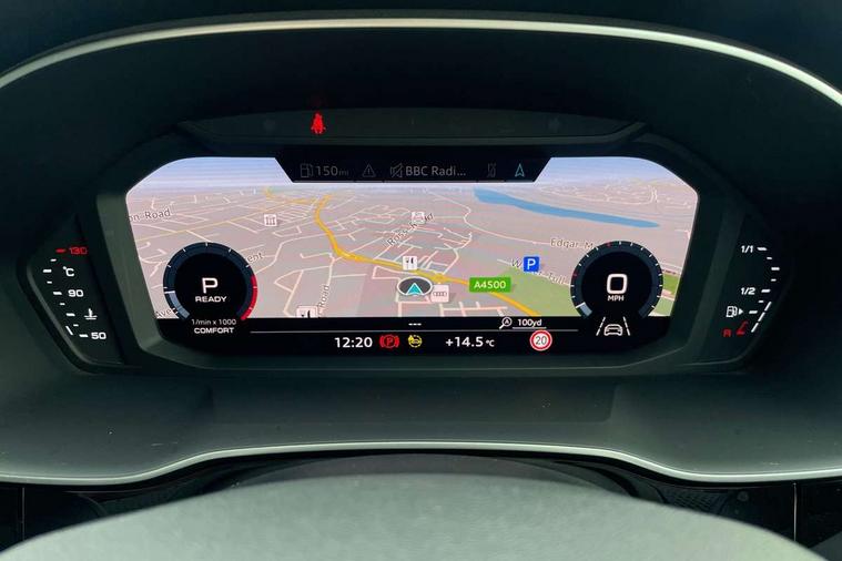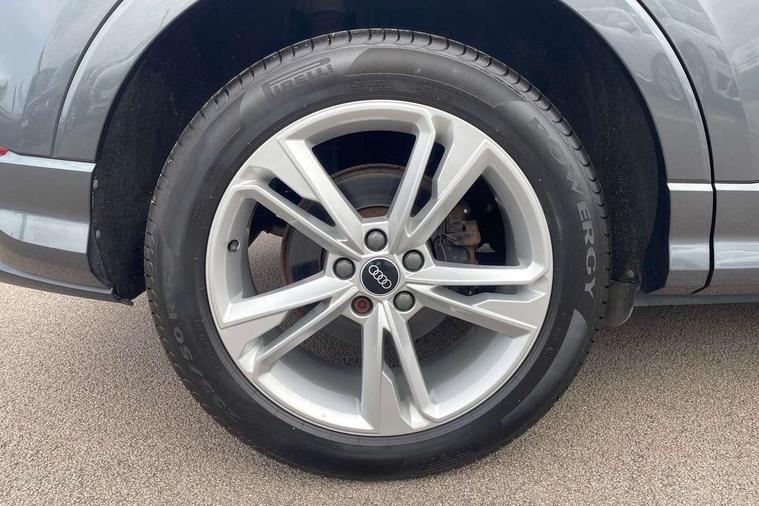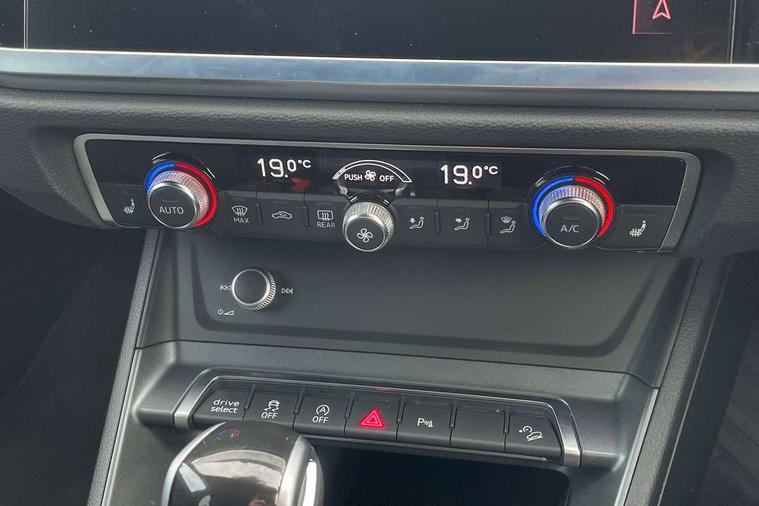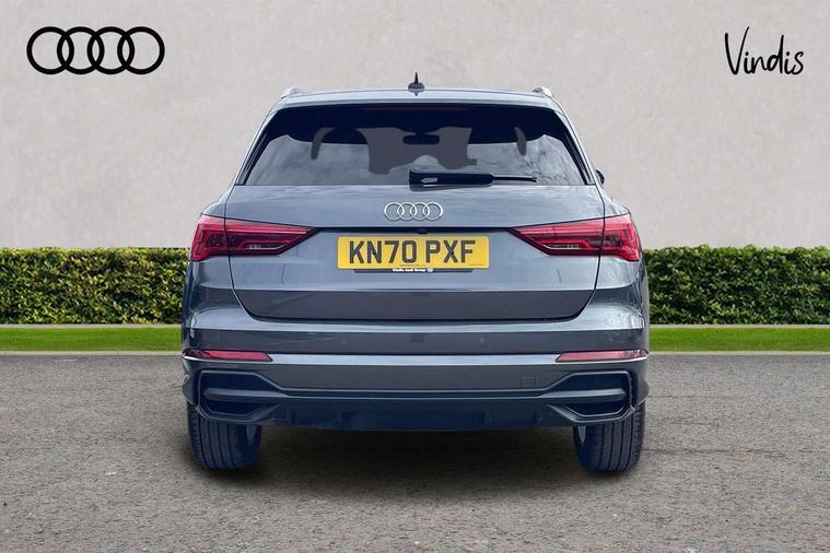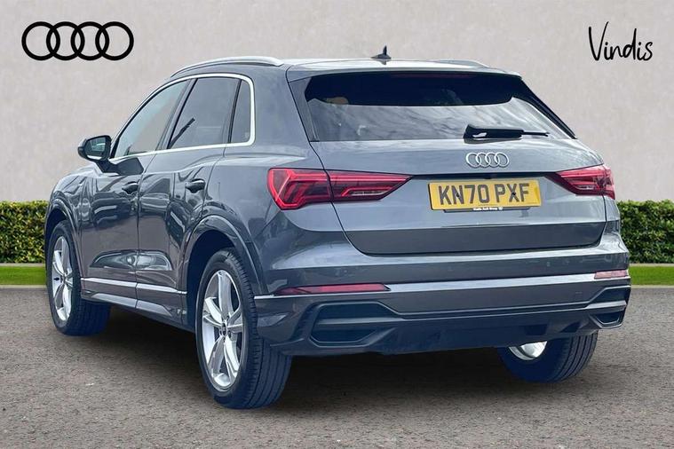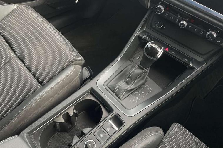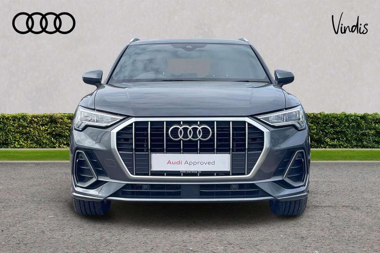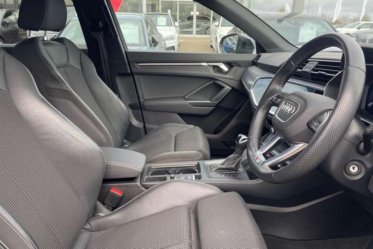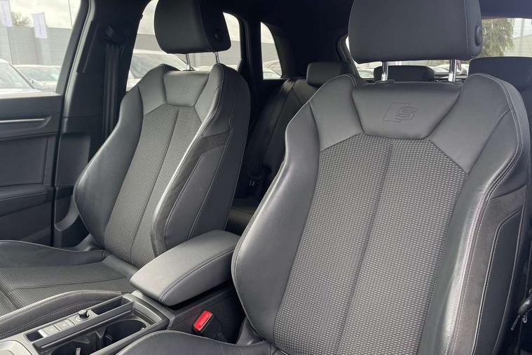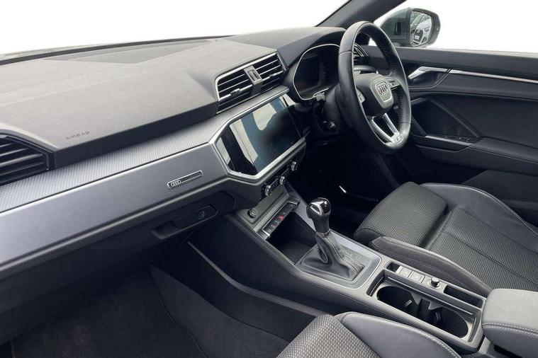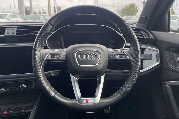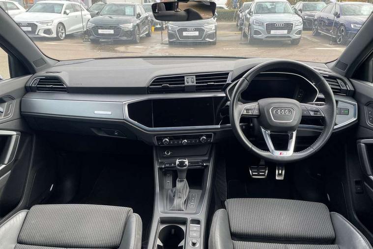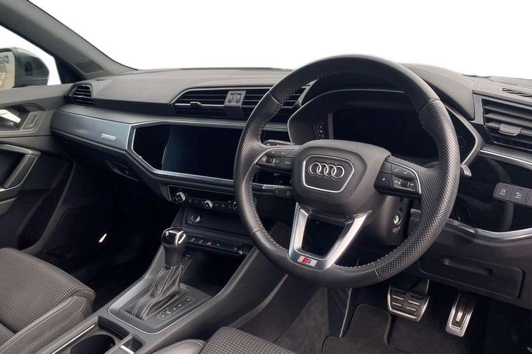 Audi connect safety and service (e-call), Audi drive select, Audi lane departure warning, Audi side assist, Audi Virtual Cockpit - 10.25" display, Bluetooth interface, Camera based traffic sign recognition, MMI Navigation Plus with high resolution 10.1 inch touchscreen colour display, Power operated tailgate, Progressive steering, Service interval indicator, Smartphone interface includes wireless Apple carplay/Android Auto, Start stop system with recuperation, Voice control system with natural language interaction, 48V Mild hybrid technology, Sports suspension, 1 x USB type C and 1 USB type A charging points, 6 passive loudspeakers, DAB digital radio module, Acoustic windscreen, Aluminium roof rails, Aluminium window trim, Auto dimming frameless rear view mirror, Body coloured bumpers, Electrically folding, adjustable and heated door mirrors with integrated LED side indicators and kerb view function for passenger side, Front and rear electric windows, Front fog lights, Front side air inlets in matt platinum grey, Front spoiler blade in matt platinum grey, Grille vertical bars in aluminium silver/Matt, High gloss black finish B and C pillars, LED headlights with LED daytime running lights and dynamic rear indicator, LED rear lights, Privacy glass dark tinted rear and rear-side windows (from B-pillar backwards), Rain and light sensors, Rear diffuser strip in matt titanium black, S line badges on front wings, S Line front and rear bumpers, Side skirt insert in matt Platinium grey, Silver chrome grille surround, Titanium black radiator grille, 12V socket in rear centre console, 40:20:40 folding with manual adjustment for 60:40 forwards/backwards position and backrest angle, Adjustable rear seat bench/backrest with centre armrest and cupholder, Black cloth headlining, Dual zone electronic climate control, Front and rear black floor mats with contrast stitching in rock grey, Front and rear headrests, Front and rear roof module including reading lights, Front centre armrest, Glove compartment lighting, Height and reach adjustable steering wheel, Illuminated door sill trims with S logo, ISOFIX child seat mounting for front passenger with airbag deactivation and outer rear seat including top tether attachment point for outer rear seats, Luggage compartment light, Manual front seats with height adjustment, Perforated leather gearknob, Stainless steel luggage compartment sill finisher, Stainless steel pedals, Non smoking pack - Q3, 3x3 point rear seatbelts, 6 airbags - Driver, front passenger, curtain and side windows, Audi pre-sense front with pedestrain and cyclist recognition, Electrically operated child locks on rear doors, Electromechanical parking brake, Electronic stabilisation control including ABS, ASR and EDL, Hill descent control, Hill hold assist, Pre sense basic, Seatbelt monitoring, Tyre pressure warning, Warning triangle and first aid kit, Anti theft alarm, Anti theft wheel bolts, Remote central locking, Dark matt brushed aluminium inlay, Detail dashboard around MMI touch colour display in glass look, black with surround in aluminium look, Leatherette door armrest, Tool kit, Tyre repair kit,