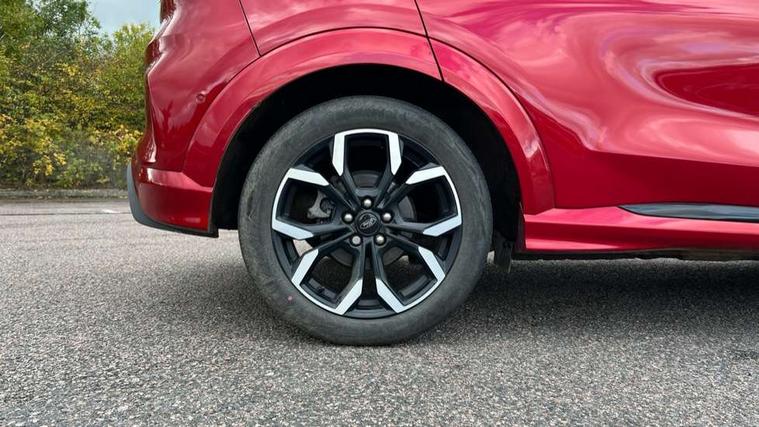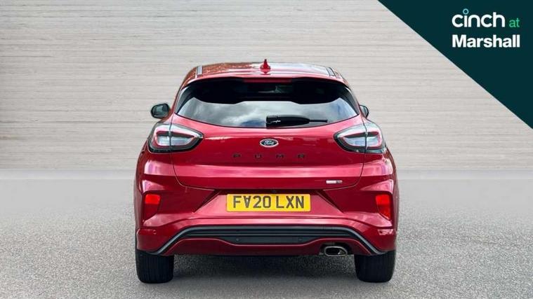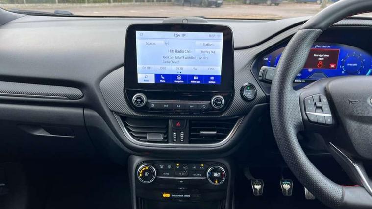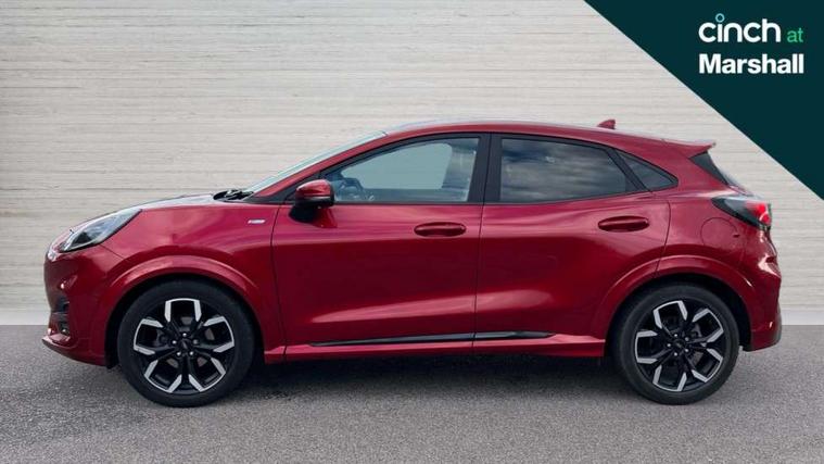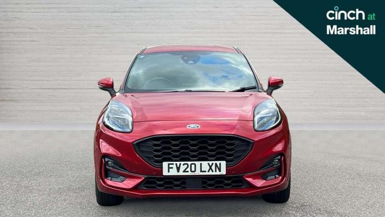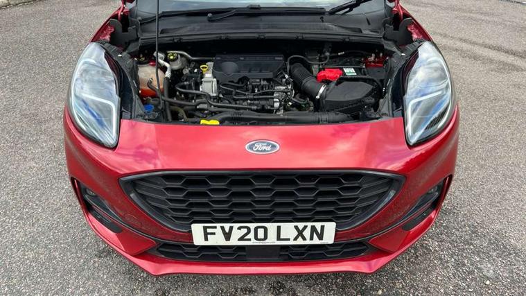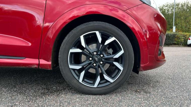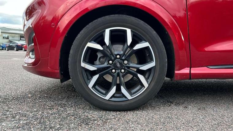 Ford easy fuel, Full digital 12.3" instrument cluster, Lane keeping aid with lane departure warning, Power assist steering, Power liftgate hands free including keyless start + entry, motion sensing key fob, Rear parking sensor, Selectable drive modes(Normal, sport, Eco, trail, slippery), Wireless charging pad, Automatic headlights with rain sensing wipers and auto high beam, Body coloured door mirrors, Fixed LED headlamps, Front fog lights with cornering lights and LED rear lamps, Power foldable heated door mirrors with puddle lamps, Privacy glass to side rear windows and tailgate glass, Quickclear heated windscreen, ST-Line body kit with large rear spoiler wth sports suspension, Alloy sports pedals, Casual partial leather upholstery with salerno bolster, Centre console with armrest and stowage, Driver and passenger seat lumbar and height adjust, EATC - Electronic Auto Temperature control, Ford megabox extended bootspace, Front and rear floor mats, Front and rear head restraints, ST-Line flat bottomed sensico leather steering wheel with leather handbrake and aluminium gear knob, B&O Premium Audio system + Ford SYNC 3 navigation pack - Puma, Driver assistance pack - Puma, 3 rear seatbelts, Electronic stability control (ESC) and hill start assist, Pre-collision assist with autonomous emergency braking, pedestrian/cyclist detection & post-collision braking, Tyre pressure monitoring system (TPMS), Thatcham alarm, Carbon look interior deco spears, 18" 5 spoke matt black machined finish alloy wheels, Tyre inflation kit,
