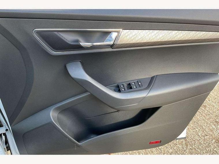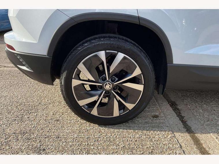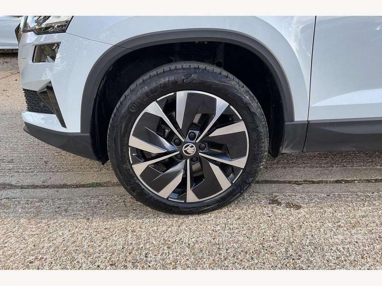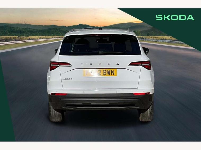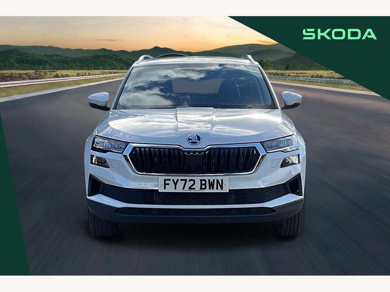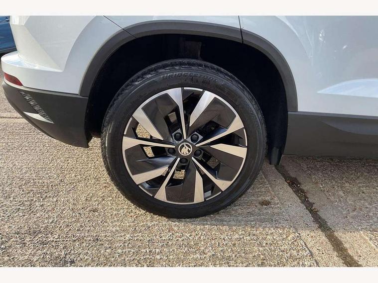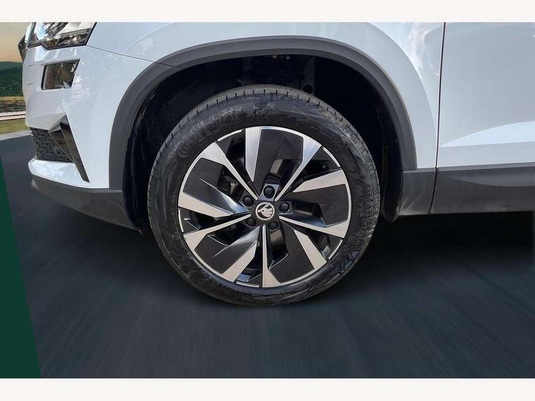 8" Digital display, Care connect, Colour multifunction trip computer, Driver fatigue sensor, Emergency services call system, Outside temperature gauge, Service interval indicator, SmartLink wireless for Apple and wired for Android, Start/stop system with regenerative braking, USB C Port x 2 in front centre console, 8 Speakers, DAB radio with Bluetooth, USB connection, Acoustic glass, Aero front windscreen wipers with intermittent function, Auto dimming rear view mirror with light and rain sensors, Automatic headlight control system, Black electric window control buttons, Body colour door mirrors and handles, Electric front and rear windows with child proof lock, Heated rear windscreen, LED daytime running lights, LED rear lights with high functionality welcome effect and dynamic indicators, Light assistant (coming/leaving home/tunnel light), Plastic scuff plates, Privacy glass, Rear side wing doors, Rear spoiler, Rear window wiper with washer system and intermittent control, Safety reflectors on front doors, 1.5 litre bottle holders in driver and front passenger door panels, 12V socket in boot, 12v socket in front centre armrest with storage compartment and rear air vents, 2 Folding hooks and nets in boot, 2 spoke leather heated multifunction steering wheel with DSG paddles, 2 x Tablet holder, 3 rear height adjustable headrests, 3 seat bench in 2nd row, 4 foldable roof handles with rear coat hooks, Black floor carpet, Chrome inner door handles, Decorative door sills with KAROQ badging, Double sided boot floor, Foldable hooks in the boot, Front head restraints, Height adjustable front three point seats belts with tensioners, Height/reach adjust steering wheel, Ice scraper, Illuminated glovebox, Illuminated luggage compartment, Isofix child seat preparation for front passenger seat, Isofix child seat preparation outer rear, Manual lumbar support for front seats, Pen holder, Pollen filter, Rear boot cover, Rear reading lights, Rubbish bin door, Safety vest holder, Single front passenger seat, Storage box in upper central dashboard closed, Sunvisors with illuminated vanity mirrors, Textile floor mats, Ticket holder, VarioFlex seats with standard rear seat release, Chrome roof rails + chrome pack - Karoq, Parking pack - Karoq, Automatic door unlocking in case of crash, Automatic fuel cut off in case of crash, Child locks on rear doors, Driver airbag, Electronic parking brake with auto hold function, Emergency rear braking signal, ESC including ABS, MSR, ASR, EDS, HBA, DSR, RBS, MKB and traction control, Front side airbags, Hill hold control, Knee airbags, Passenger airbag with switch-off function, Pedestrian monitor, Seatbelt reminder signalisation and pretensioner for all seats, Three point seatbelts rear, Two tone horn, Tyre pressure display, Tyre pressure monitor, Alarm with interior monitoring, back up horn and tilt sensor with safe function, Electronic engine immobiliser, Keyless entry and start/stop, Remote central locking with 2 remote folding keys, Chrome framed air vents, Anti-theft wheel bolts protection, Storage on wheel cover, Tool kit,