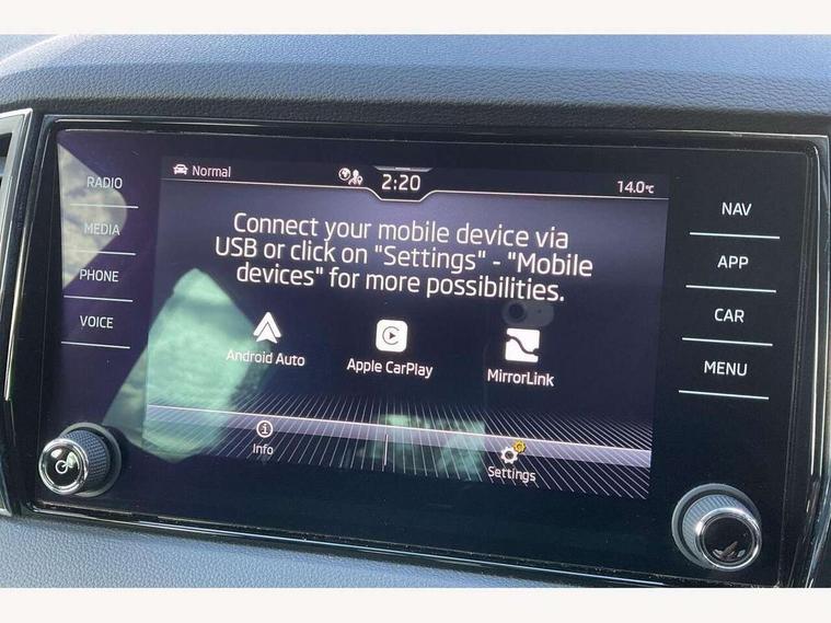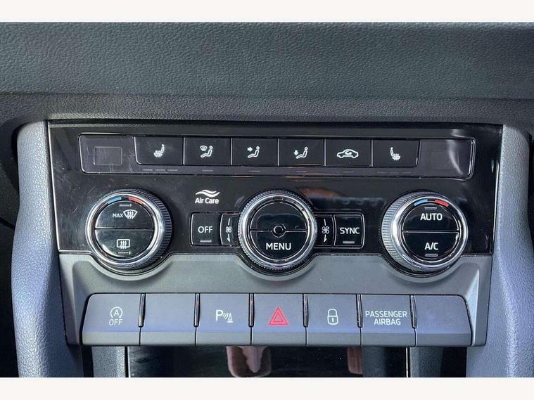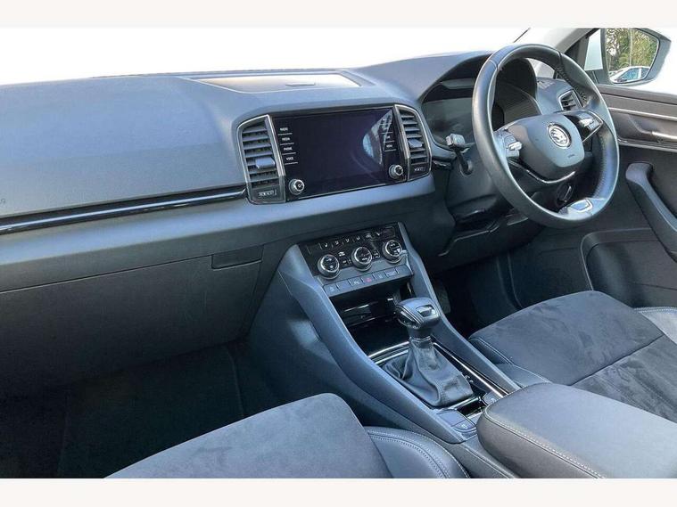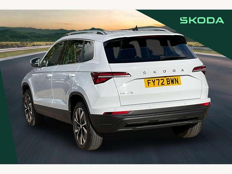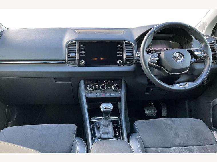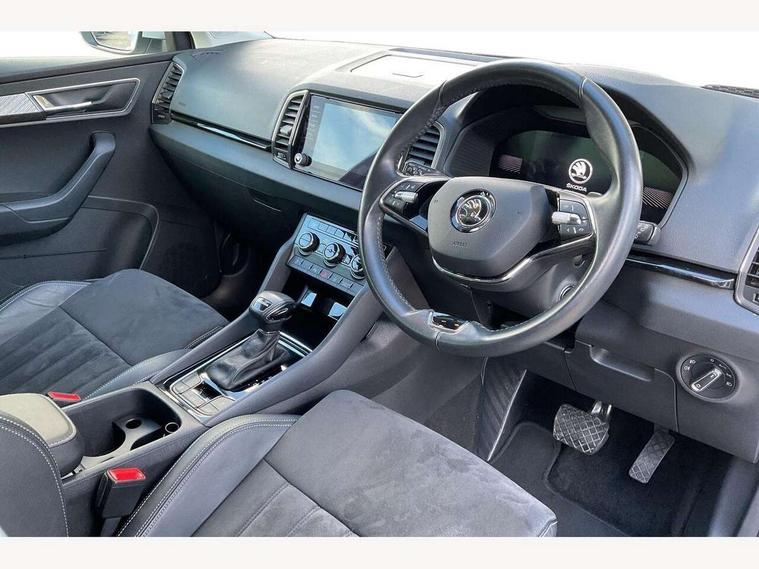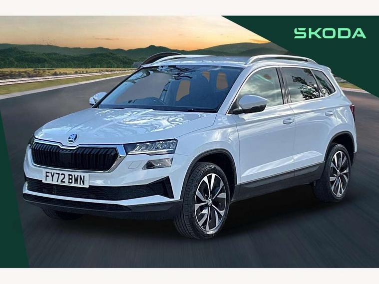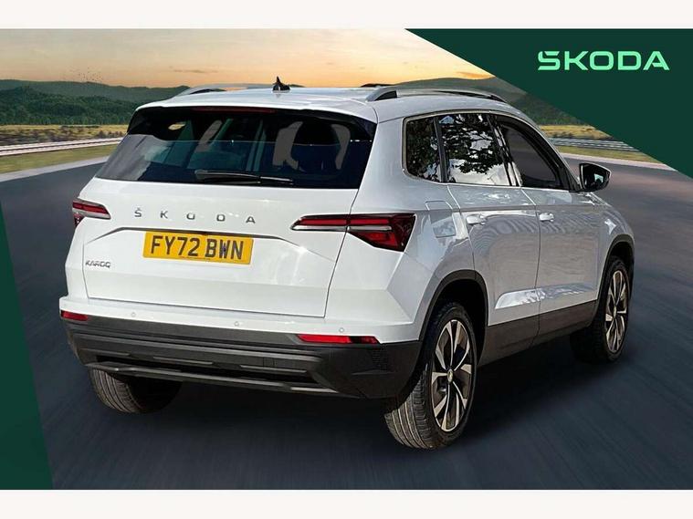 8" Digital display, Care connect, Colour multifunction trip computer, Driver fatigue sensor, Emergency services call system, Outside temperature gauge, Service interval indicator, SmartLink wireless for Apple and wired for Android, Start/stop system with regenerative braking, USB C Port x 2 in front centre console, 8 Speakers, DAB radio with Bluetooth, USB connection, Acoustic glass, Aero front windscreen wipers with intermittent function, Auto dimming rear view mirror with light and rain sensors, Automatic headlight control system, Black electric window control buttons, Body colour door mirrors and handles, Electric front and rear windows with child proof lock, Heated rear windscreen, LED daytime running lights, LED rear lights with high functionality welcome effect and dynamic indicators, Light assistant (coming/leaving home/tunnel light), Plastic scuff plates, Privacy glass, Rear side wing doors, Rear spoiler, Rear window wiper with washer system and intermittent control, Safety reflectors on front doors, 1.5 litre bottle holders in driver and front passenger door panels, 12V socket in boot, 12v socket in front centre armrest with storage compartment and rear air vents, 2 Folding hooks and nets in boot, 2 spoke leather heated multifunction steering wheel with DSG paddles, 2 x Tablet holder, 3 rear height adjustable headrests, 3 seat bench in 2nd row, 4 foldable roof handles with rear coat hooks, Black floor carpet, Chrome inner door handles, Decorative door sills with KAROQ badging, Double sided boot floor, Foldable hooks in the boot, Front head restraints, Height adjustable front three point seats belts with tensioners, Height/reach adjust steering wheel, Ice scraper, Illuminated glovebox, Illuminated luggage compartment, Isofix child seat preparation for front passenger seat, Isofix child seat preparation outer rear, Manual lumbar support for front seats, Pen holder, Pollen filter, Rear boot cover, Rear reading lights, Rubbish bin door, Safety vest holder, Single front passenger seat, Storage box in upper central dashboard closed, Sunvisors with illuminated vanity mirrors, Textile floor mats, Ticket holder, VarioFlex seats with standard rear seat release, Chrome roof rails + chrome pack - Karoq, Parking pack - Karoq, Automatic door unlocking in case of crash, Automatic fuel cut off in case of crash, Child locks on rear doors, Driver airbag, Electronic parking brake with auto hold function, Emergency rear braking signal, ESC including ABS, MSR, ASR, EDS, HBA, DSR, RBS, MKB and traction control, Front side airbags, Hill hold control, Knee airbags, Passenger airbag with switch-off function, Pedestrian monitor, Seatbelt reminder signalisation and pretensioner for all seats, Three point seatbelts rear, Two tone horn, Tyre pressure display, Tyre pressure monitor, Alarm with interior monitoring, back up horn and tilt sensor with safe function, Electronic engine immobiliser, Keyless entry and start/stop, Remote central locking with 2 remote folding keys, Chrome framed air vents, Anti-theft wheel bolts protection, Storage on wheel cover, Tool kit,