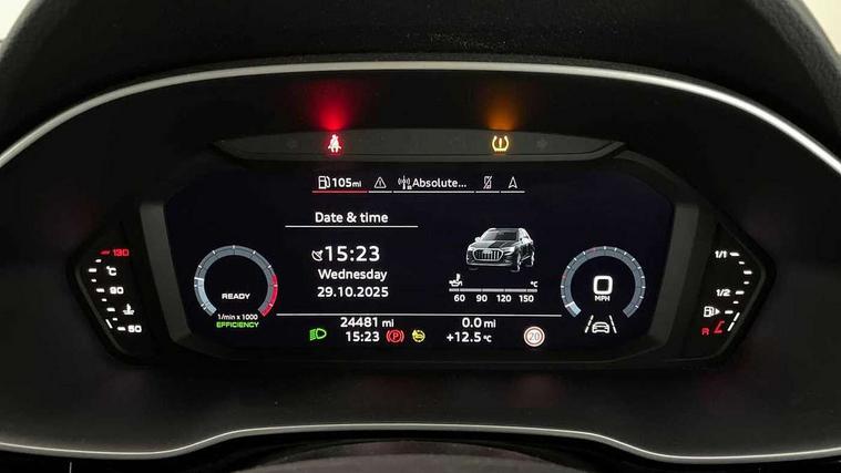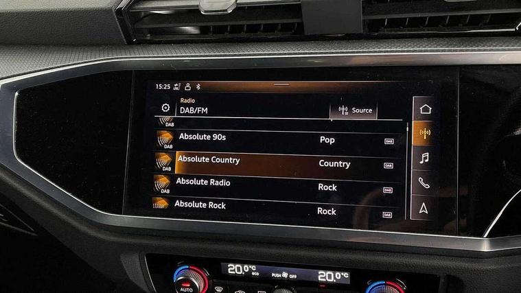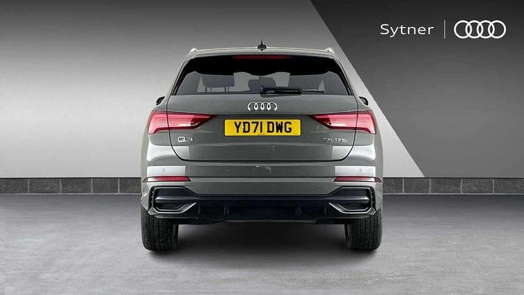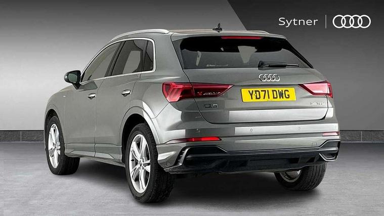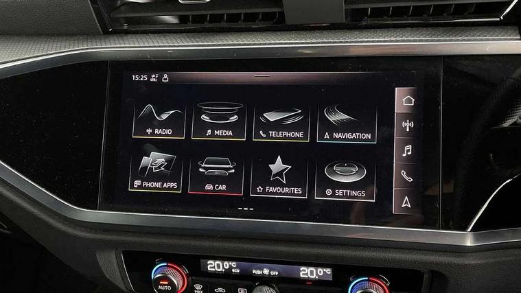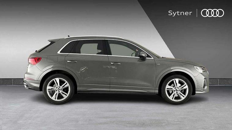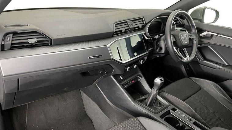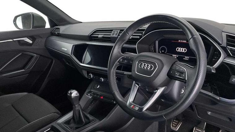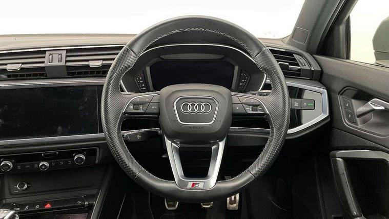 Amazon alexa Integration, Audi connect safety and service (e-call), Audi drive select, Audi lane departure warning, Audi Virtual Cockpit - 10.25" display, Bluetooth interface, Camera based traffic sign recognition, Cruise control + speed limiter, MMI Navigation Plus with high resolution 10.1 inch touchscreen colour display, Power operated tailgate, Progressive steering, Rear parking sensors, Service interval indicator, Smartphone interface includes wireless Apple carplay/Android Auto, Start stop system with recuperation, Voice control system with natural language interaction, Sports suspension, 2 USB-C ports with charge and data functions, 6 passive loudspeakers, DAB digital radio module, Acoustic windscreen, Aluminium roof rails, Aluminium window trim, Auto dimming frameless rear view mirror, Body coloured bumpers, Electrically folding, adjustable and heated door mirrors with integrated LED side indicators and kerb view function for passenger side, Front and rear electric windows, Front fog lights, Front side air inlets in matt platinum grey, Front spoiler blade in matt platinum grey, Grille vertical bars in aluminium silver/Matt, High gloss black finish B and C pillars, LED headlights with LED daytime running lights and dynamic rear indicator, LED rear lights, Privacy glass dark tinted rear and rear-side windows (from B-pillar backwards), Rain and light sensors, Rear diffuser strip in matt titanium black, S line badges on front wings, S Line front and rear bumpers, Side skirt insert in matt Platinium grey, Silver chrome grille surround, Titanium black radiator grille, 12V socket in rear centre console, 40:20:40 folding with manual adjustment for 60:40 forwards/backwards position and backrest angle, Adjustable rear seat bench/backrest with centre armrest and cupholder, Black cloth headlining, Dual zone electronic climate control, Front and rear black floor mats with contrast stitching in rock grey, Front and rear headrests, Front and rear roof module including reading lights, Front centre armrest, Glove compartment lighting, Height and reach adjustable steering wheel, Illuminated door sill trims with S logo, ISOFIX child seat mounting for front passenger with airbag deactivation and outer rear seat including top tether attachment point for outer rear seats, Luggage compartment light, Manual front seats with height adjustment, Perforated leather gearknob, Stainless steel luggage compartment sill finisher, Stainless steel pedals, Non smoking pack - Q3, 3x3 point rear seatbelts, 6 airbags - Driver, front passenger, curtain and side windows, Audi pre-sense front with pedestrain and cyclist recognition, Electrically operated child locks on rear doors, Electromechanical parking brake, Electronic stabilisation control including ABS, ASR and EDL, Hill descent control, Hill hold assist, Pre sense basic, Seatbelt monitoring, Tyre pressure warning, Warning triangle and first aid kit, Anti theft alarm, Anti theft wheel bolts, Remote central locking, Dark matt brushed aluminium inlay, Detail dashboard around MMI touch colour display in glass look, black with surround in aluminium look, Leatherette door armrest,