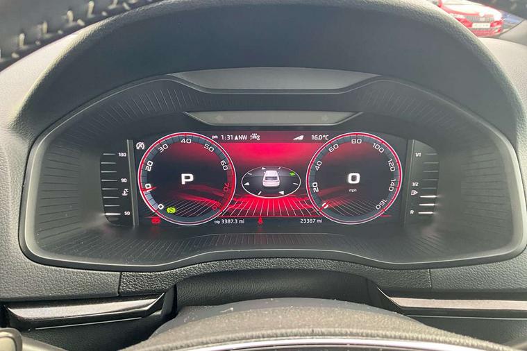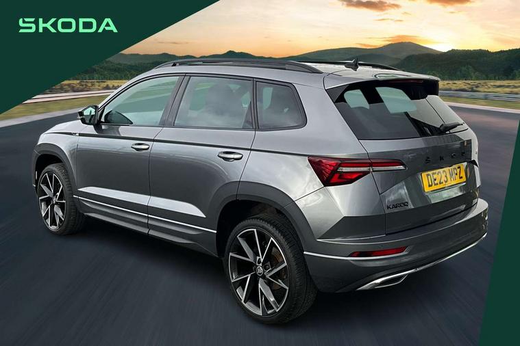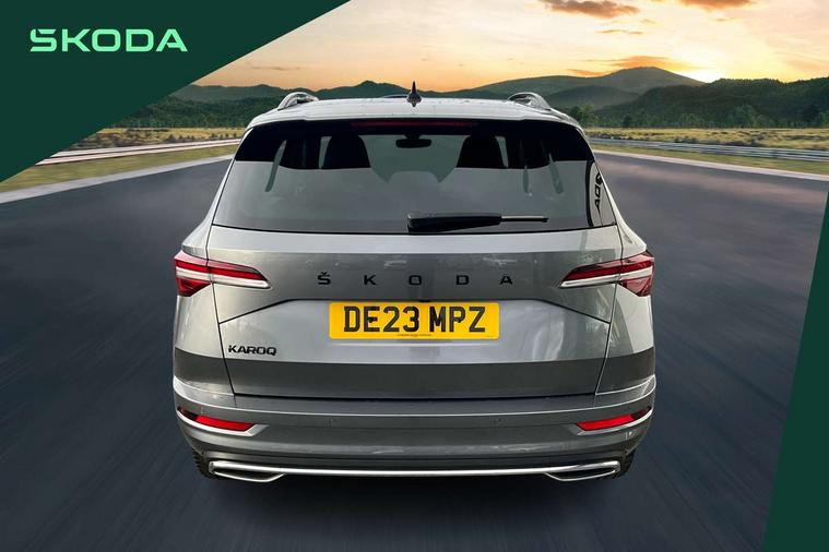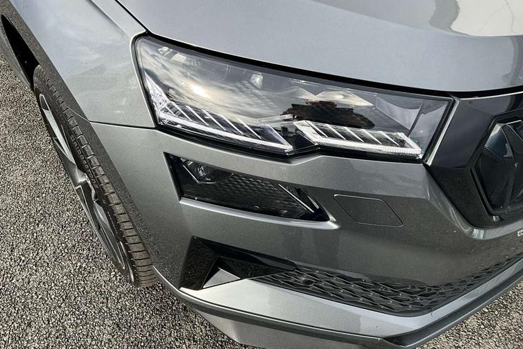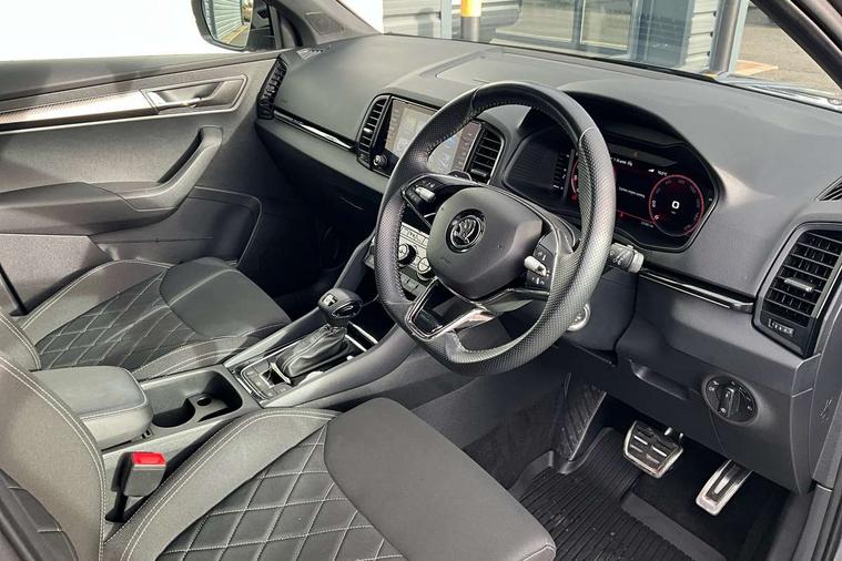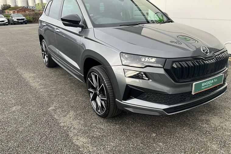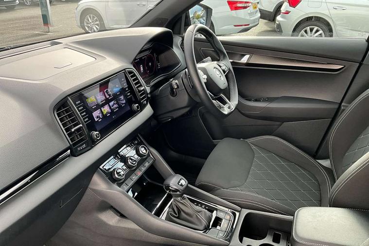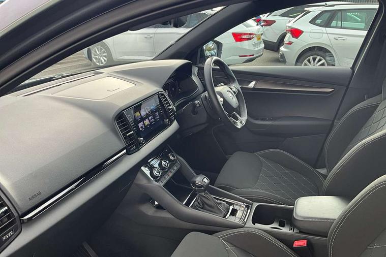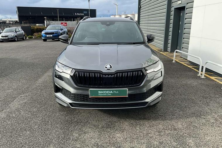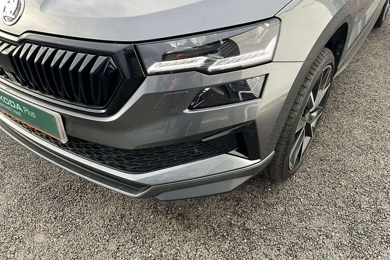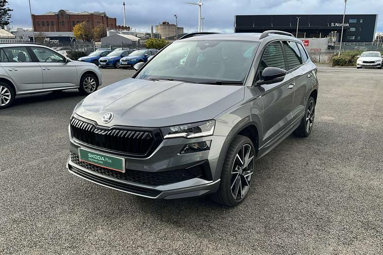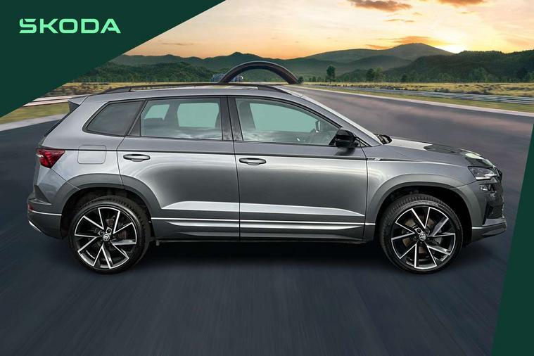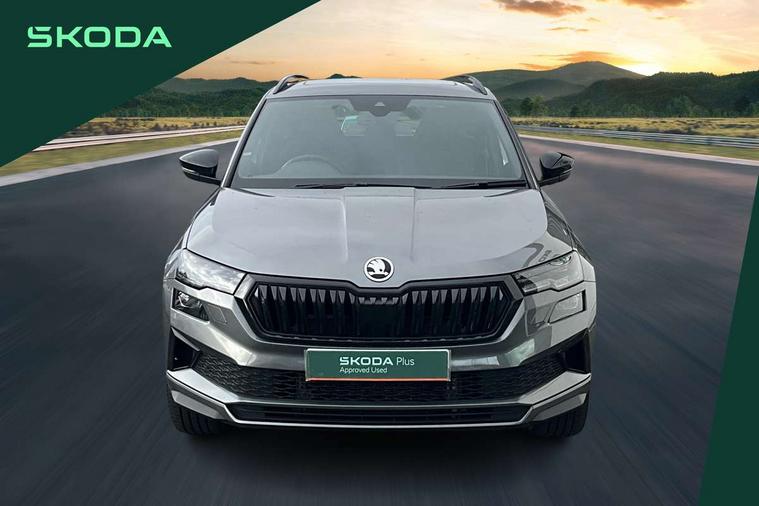 8" Digital display, Care connect, Driver fatigue sensor, Emergency services call system, Outside temperature gauge, Service interval indicator, SmartLink wireless for Apple and wired for Android, Start/stop system with regenerative braking, USB C Port x 2 in front centre console, Virtual cockpit, Virtual pedal with electrically operated boot door, 8 Speakers, DAB radio with Bluetooth, USB connection, Wireless charging without wireless aerial connection, Acoustic glass, Aero front windscreen wipers with intermittent function, Auto dimming rear view mirror with light and rain sensors, Black door mirrors, Black electric window control buttons, Black radiator grille, Black roof rails, Body colour door handles, Dynamic headlight range control with cornering light function, Electric front and rear windows with child proof lock, Front door steps with SportLine logo, Heated rear windscreen, LED daytime running lights, LED rear lights with high functionality welcome effect and dynamic indicators, Light assistant (coming/leaving home/tunnel light), Panoramic sliding sunroof, Plastic scuff plates, Privacy glass, Protective door side sills in body colour, Rear diffuser, Rear side wing doors, Rear spoiler, Rear window wiper with washer system and intermittent control, Safety reflectors on front doors, Skoda lettering on tailgate in black, Sportline badge on front fender, Sportline decorative inserts with badging, Sports front and rear bumpers, 1.5 litre bottle holders in driver and front passenger door panels, 12V socket in boot, 12v socket in front centre armrest with storage compartment and rear air vents, 3 rear height adjustable headrests, 3 seat bench in 2nd row, 3 spoke leather sports multifunction steering wheel and silver stitching with gear shift paddles, 4 foldable roof handles with rear coat hooks, Black floor carpet, Black roof headlining, Chrome inner door handles, Double sided boot floor, Foldable hooks in the boot, Front head restraints, Height adjustable front three point seats belts with tensioners, Height/reach adjust steering wheel, Ice scraper, Illuminated glovebox, Illuminated luggage compartment, Isofix child seat preparation outer rear, Manual lumbar support for front seats, Pen holder, Pollen filter, Rear boot cover, Rear reading lights, Rear seats fixed folding and divided 60:40, Rubbish bin door, Safety vest holder, Single front passenger seat, Storage box in upper central dashboard closed, Sunvisors with illuminated vanity mirrors, Textile floor mats, Ticket holder, Titan black interior ceiling, Welcome animation with sportline logo, Boot pack - Karoq, Light Pack - Karoq, Parking pack - Karoq, Automatic door unlocking in case of crash, Automatic fuel cut off in case of crash, Child locks on rear doors, Driver airbag, Electronic parking brake with auto hold function, Emergency rear braking signal, ESC including ABS, MSR, ASR, EDS, HBA, DSR, RBS, MKB and traction control, Front side airbags, Hill hold control, Knee airbags, Passenger airbag with switch-off function, Pedestrian monitor, Seatbelt reminder signalisation and pretensioner for all seats, Three point seatbelts rear, Two tone horn, Tyre pressure display, Tyre pressure monitor, Alarm with interior monitoring, back up horn and tilt sensor with safe function, Electronic engine immobiliser, Keyless entry and start/stop, Remote central locking with 2 remote folding keys, Black air vent surround, Black centre console, Satin black dashboard, Satin black door trim, 19" Vega black polished alloy wheels, Anti-theft wheel bolts protection, Matt black aero hub caps, Storage on wheel cover, Tool kit,