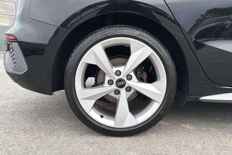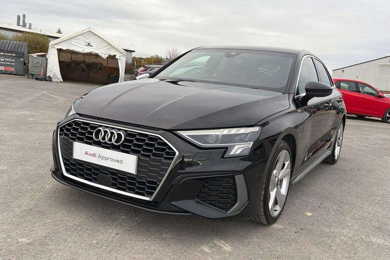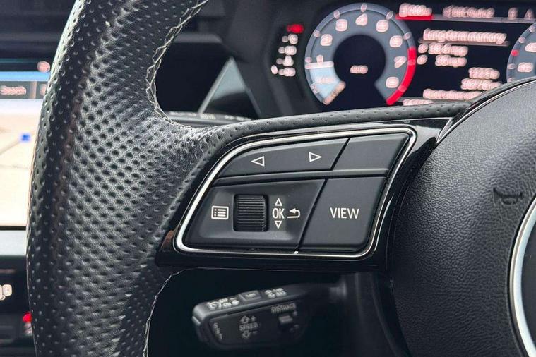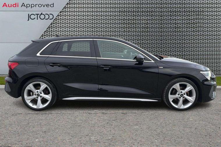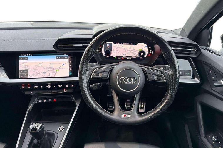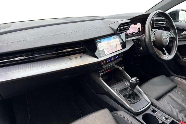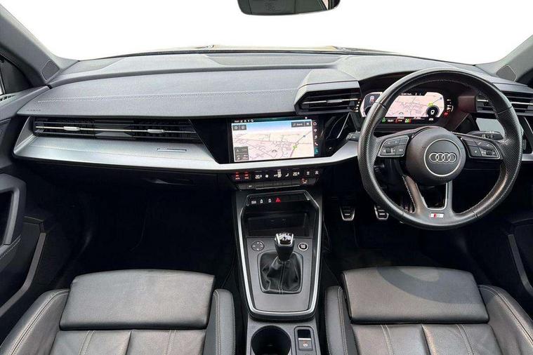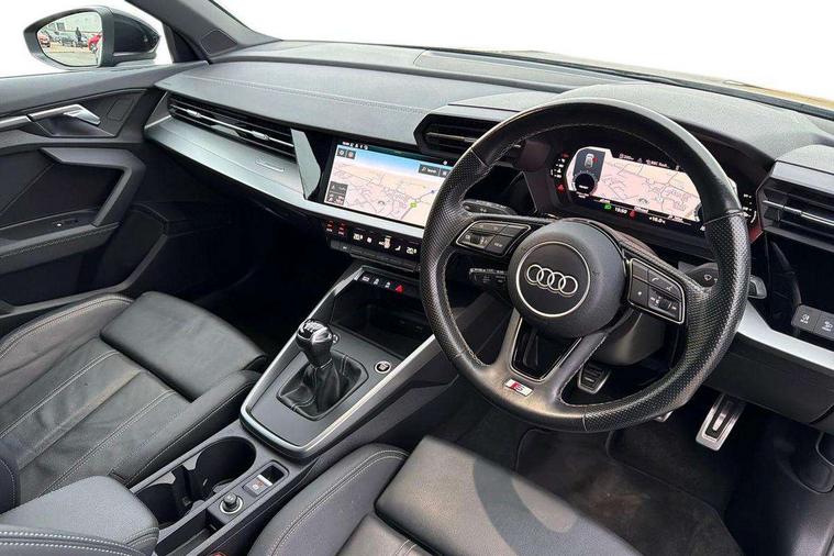 Audi connect emergency call and service, Audi drive select (Auto, Comfort, Dynamic, Efficiency and Individual), Audi smartphone interface, Audi Virtual Cockpit - 10.25" digital and colour instrument cluster, Automatic start/stop system with recuperation, Bluetooth interface, Collision avoidance assistant, Electromechanical power speed sensitive steering, Lane departure warning system, MMI Navigation Plus with high resolution 10.1" colour touch screen display, Service indicator, Trip computer, Voice control system with natural language interaction, 2xUSB-C connection with data and charging functions, 6 passive loudspeakers, DAB Digital radio, 3rd brake light, Acoustic glass windscreen, Aluminium window trim, Auto dimming frameless rear view mirror, Electrically adjustable/heated/folding/auto dimming door mirrors with integrated LED indications + kerb view function for passenger side, Front electric windows, Illuminated aluminium inserts front door sills with S logo, LED daytime running lights, LED headlights with LED rear lights and dynamic rear indicators, Light and rain sensors, Privacy glass - dark tinted rear window, rear door and side windows, Rear electric windows, Rear side air outlets in grained matt black, Rear side wing doors, Rear wiper, S line bumpers, S roof spoiler, 12V socket and storage compartment in front centre console, 3 seat bench in 2nd row, 40/20/40 split folding rear seat bench with cupholder, Black cloth headlining, Dual zone electronic climate control, Front and rear centre armrest in leather, Front and rear headrests, Front/rear floor mats, Height and reach adjustable steering wheel, Illuminated vanity mirror, Interior lighting - glove compartment light and right hand side, Luggage compartment floor covering, Manual boot compartment lid, Manually adjustable front seats, Seat side bolsters, Single front passenger seat, Stainless steel pedals and front footrest in black, Twin leather upholstery with front sports seats S embossed logo, Aluminium interior elements pack - A3 Sportback, S line styling pack - A3 Sportback, 3x3 point rear seat belts, Driver and front passenger airbag with passenger airbag deactivation, Electronic Stabilisation Control (ESC) including ABS, ASR and EDL, First aid kit with warning triangle and 2 safety vests, Front side airbags with head airbags and interaction airbag, Pre-sense front with pedestrian and cyclist detection, Seatbelt monitoring, Tyre pressure loss indicator, Anti theft alarm, Anti-theft wheel bolts, Immobiliser, Manual child locks, Remote control central locking, Accent surfaces in the dashboard and centre console in platinum grey silk effect paint finish, Dark spectrum aluminium inlays,