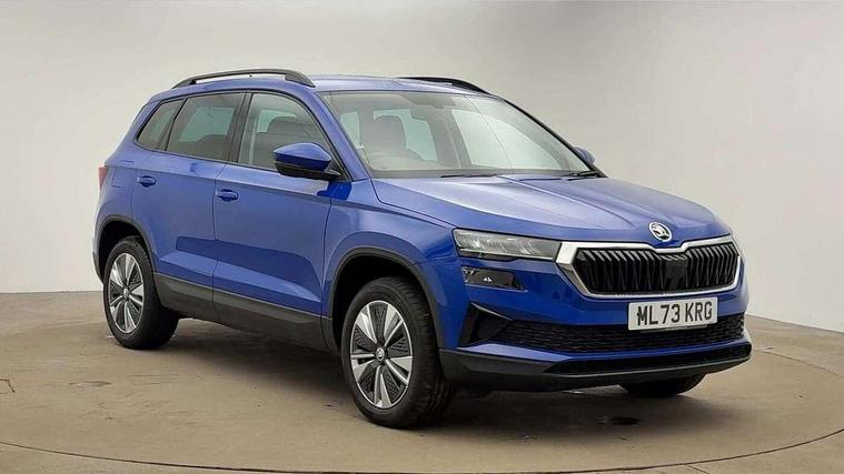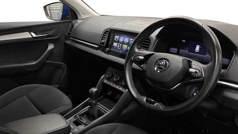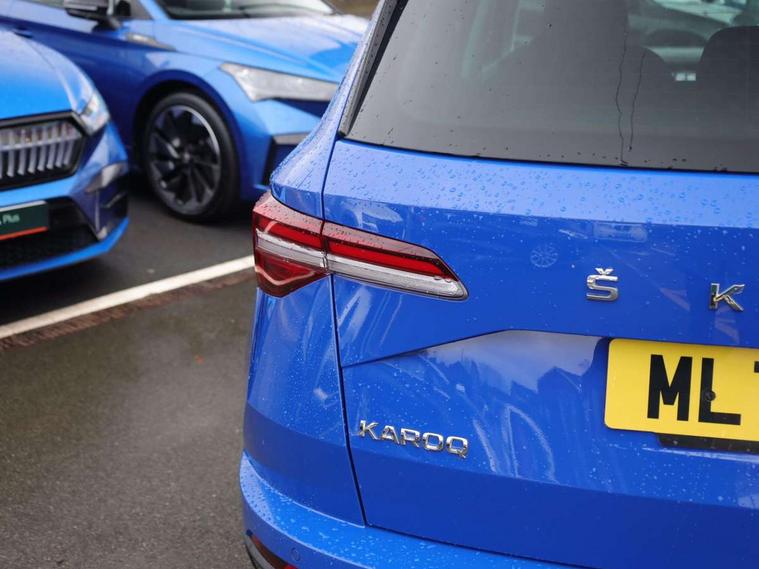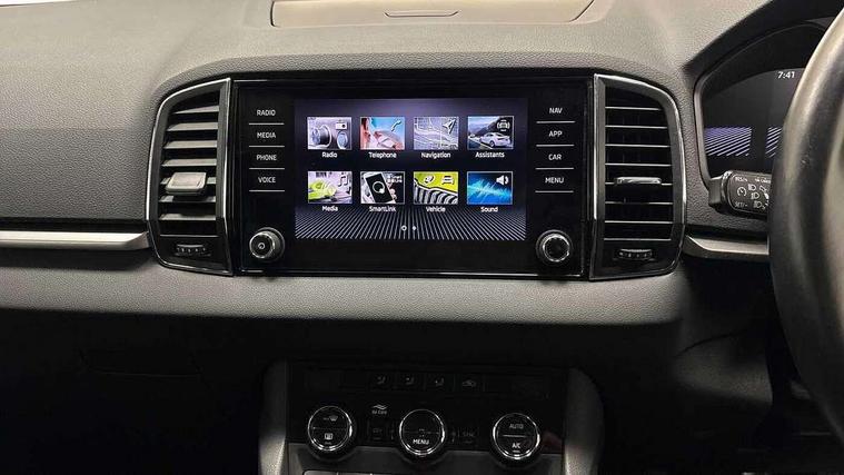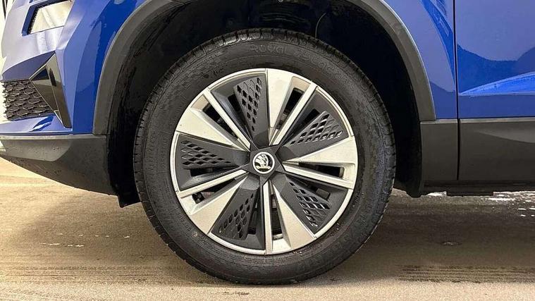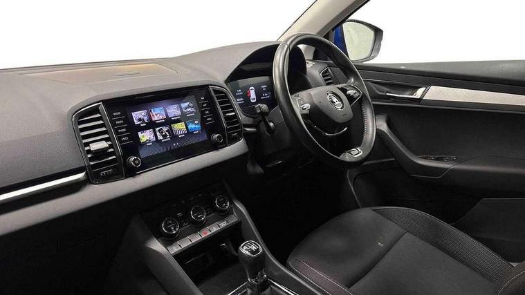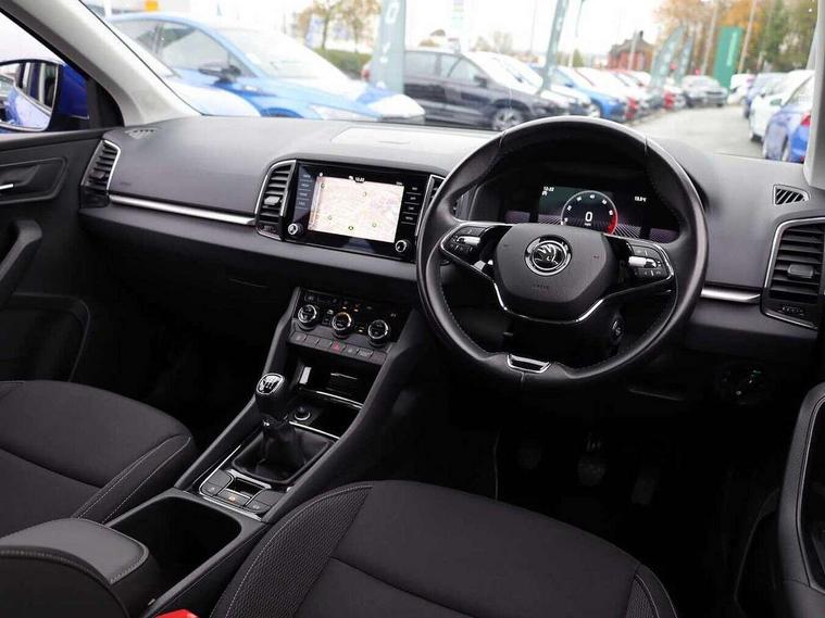 8" Digital display, Amundsen satellite navigation with 8" touchscreen display with maps Europe, WLAN and web radio, Care connect, Driver fatigue sensor, Electro-mechanical PAS, Emergency services call system, Outside temperature gauge, Service interval indicator, SmartLink wireless for Apple and wired for Android, Start/stop system with regenerative braking, USB C Port x 2 in front centre console, 8 Speakers, DAB radio with Bluetooth, USB connection, Acoustic glass, Aero front windscreen wipers with intermittent function, Auto dimming rear view mirror with light and rain sensors, Black electric window control buttons, Body colour door mirrors and handles, Dynamic headlight range control with cornering light function, Electric front and rear windows with child proof lock, Electrically adjustable heated folding and auto dimming door mirrors, Front fog lights, Heated rear windscreen, LED daytime running lights, LED Headlights, LED rear lights with high functionality welcome effect and dynamic indicators, Light assistant (coming/leaving home/tunnel light), Plastic scuff plates, Privacy glass, Rear side wing doors, Rear window wiper with washer system and intermittent control, Safety reflectors on front doors, Third brake light, 1.5 litre bottle holders in driver and front passenger door panels, 12V socket in boot, 12v socket in front centre armrest with storage compartment and rear air vents, 2 x Tablet holder, 3 rear height adjustable headrests, 3 seat bench in 2nd row, 4 foldable roof handles with rear coat hooks, Black floor carpet, Chrome inner door handles, Double sided boot floor, Driver/front passenger reading lights, Foldable hooks in the boot, Folding tables on the front seat backrests, Front head restraints, Height adjustable driver and passenger seat, Height adjustable front three point seats belts with tensioners, Height/reach adjust steering wheel, Ice scraper, Illuminated glovebox, Illuminated luggage compartment, Isofix child seat preparation for front passenger seat, Isofix child seat preparation outer rear, Manual lumbar support for front seats, Pearl grey interior ceiling, Pen holder, Pollen filter, Rear boot cover, Rear reading lights, Rubbish bin door, Safety vest holder, Single front passenger seat, Storage box in upper central dashboard closed, Sunvisors with illuminated vanity mirrors, Textile floor mats, Ticket holder, Umbrella under passenger seat, Boot pack - Karoq, Automatic door unlocking in case of crash, Automatic fuel cut off in case of crash, Child locks on rear doors, Driver airbag, Electronic parking brake with auto hold function, Emergency rear braking signal, ESC including ABS, MSR, ASR, EDS, HBA, DSR, RBS, MKB and traction control, Front side airbags, Hill hold control, Knee airbags, Passenger airbag with switch-off function, Pedestrian monitor, Seatbelt reminder signalisation and pretensioner for all seats, Three point seatbelts rear, Two tone horn, Tyre pressure display, Tyre pressure monitor, Alarm with interior monitoring, back up horn and tilt sensor with safe function, Electronic engine immobiliser, Remote central locking with 2 remote folding keys, Black centre console, Chrome framed air vents, Satin black dashboard, Satin black door trim, Anti-theft wheel bolts protection, Storage on wheel cover, Tool kit,