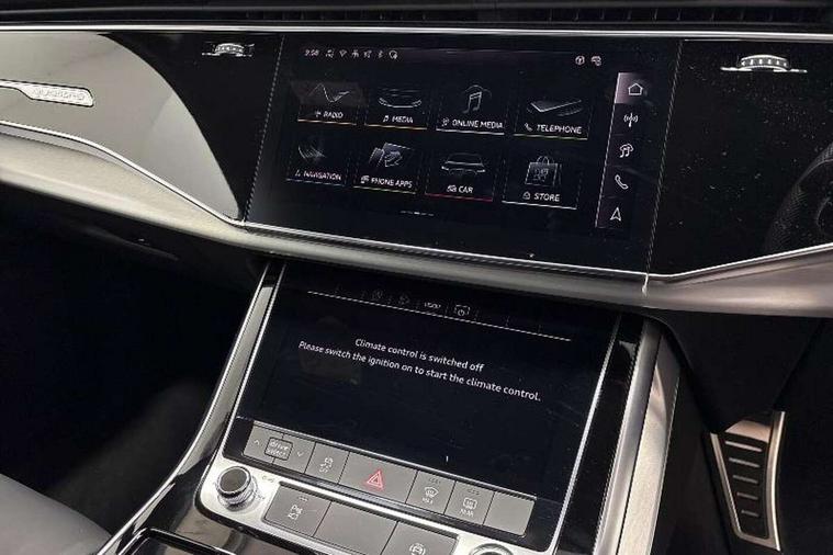 Audi connect safety and service (e-call), Audi connect with Amazon Alexa Integration, Audi drive select (Auto, Comfort, Dynamic, Efficiency, Individual, Off-road and All road), Audi phone box light with wireless charging, Audi virtual cockpit - 12.3" high-resolution LCD display with fully customisable instrument cluster, Bluetooth interface, Camera based traffic sign recognition, Electromechanical power steering, MMI navigation plus with MMI touch screens includes 10.1" and 8.6" screens with haptic feedback, Natural voice recognition, Operating buttons in Matte black, Parking system plus with 360 degree display (front, rear and side sensors) - acoustic and visual park assist system, Power operated tailgate, Rear view camera, Smartphone interface includes wireless Apple carplay/Android Auto, Start/stop system, 48V Mild hybrid technology, Adaptive air suspension, Quattro all wheel drive with self locking centre differential, Audi music interface - front 2 USB-C ports with charger and data functions, Audi sound system with 6 channel amplifier, 180 watt amplifying capacity and 10 loudspeakers including subwoofer, DAB digital radio module, Aluminium roof rails, Aluminium window trim, Auto dimming frameless rear view mirror, Body coloured door mirrors, Electrically adj heated/folding + automatically dimming exterior mirrors with memory + automatic kerb side function for passenger side exterior mirror, Heat insulating glass in windshield, Integrated LED indications in door mirrors, LED 3rd brake light, LED daytime running lights, LED rear tail lights, Loading edge protection in stainless steel, Matrix LED headlights with dynamic front and rear indicators, Privacy glass - dark tinted rear and rear side windows from B-pillar backwards, Rear side wing doors, Rear wiper, S Line badge on wings, S Line body styling, S line bumpers in full body colour paint finish, S line roof spoiler, S line styling side ventilation grilles and side skirts, 2 seat bench in 3rd row, 2 zone automatic climate control, 3 seat bench in 2nd row, 7 seat layout with ISOFIX points for the front passenger seat and rear passenger seat, Black carpets, Black cloth headlining, Comfort front centre armrest, Electric adjustable front seat with 4 way lumbar support, driver memory functionality, Folding rear seats, Front head restraints, Front/rear floor mats, Heated front seats, Illuminated door sill trims with S logo, ISOFIX child seat mounting for front passenger seat and 2 outer rear seats with top tether child seat mounting for all 3 rear seats, LED interior ambient lighting, Luggage compartment cover, Luggage compartment sill protection in stainless steel, Rear head restraints, Rear seat bench plus for the second row, with forwards/backwards sliding adjustment and backrest angle adjustment, Single front passenger seat, Stainless steel pedals, Sunvisors with illuminated vanity mirrors, 3 point seatbelts on all rear seats, Audi pre sense front, Child locks on rear doors, Convenience key with safelock and gesture tailgate, Driver and front passenger, front side and curtain airbags, Electromechanical parking brake, Electronic Stabilisation Control (ESC) including ABS, ASR and EDL, Extended pedestrian protection measures, Hill hold assist, Seatbelt reminder, Tyre pressure loss indicator, Warning triangle and first aid kit, Anti theft alarm with tow away protection, Anti-theft wheel bolts and wheel loosening detection, Keyless Go, Remote central locking, Black dashboard, Darkened matt brushed aluminium inlays, Tool kit, Tyre repair kit,
