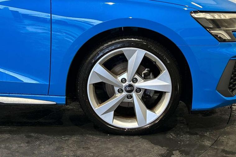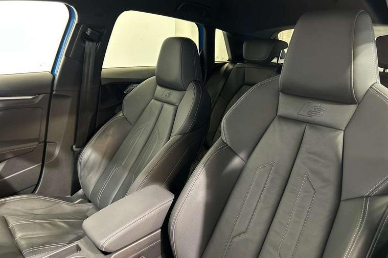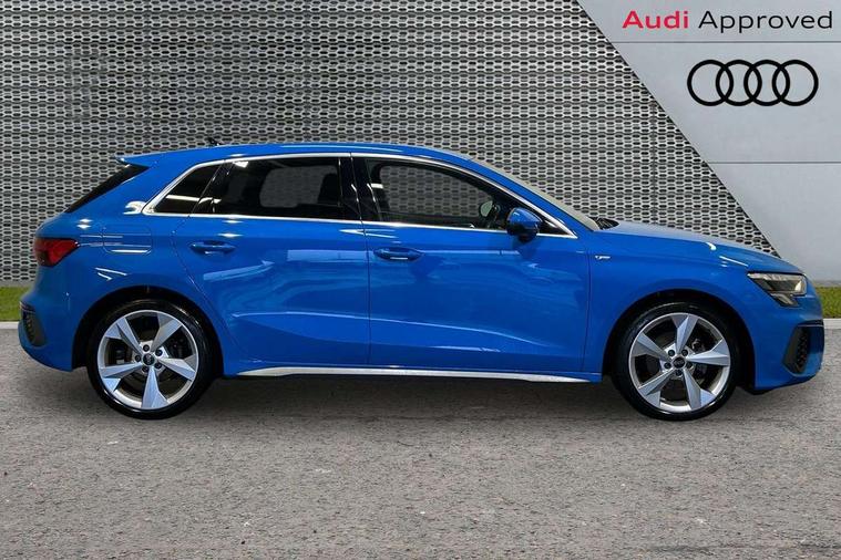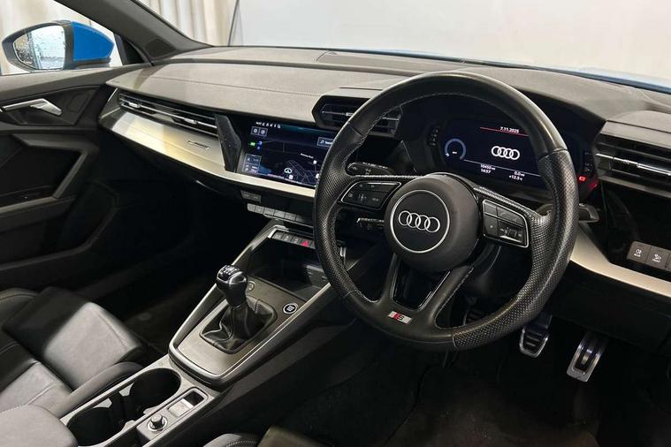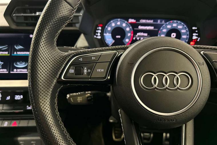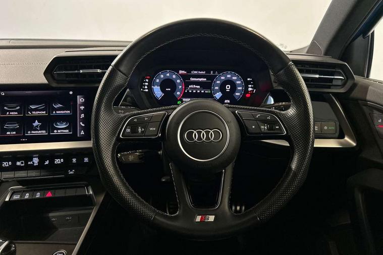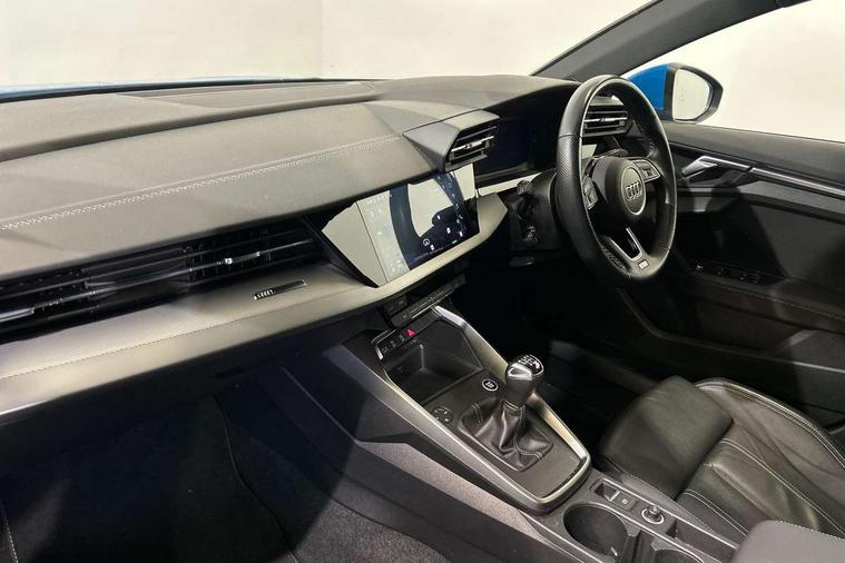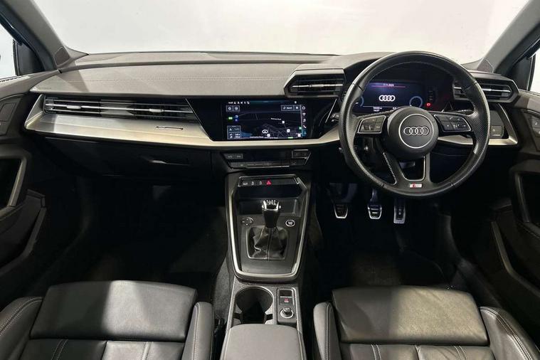 Audi drive select (Auto, Comfort, Dynamic, Efficiency and Individual), Audi smartphone interface, Audi Virtual Cockpit - 10.25" digital and colour instrument cluster, Automatic start/stop system with recuperation, Bluetooth interface, Collision avoidance assistant, Cruise control, e-Call (emergency call), Electromechanical power speed sensitive steering, Lane departure warning system, MMI Navigation Plus with high resolution 10.1" colour touch screen display, Rear parking sensors, Service indicator, Trip computer, Voice control system with natural language interaction, 2xUSB-C connection with data and charging functions, 6 passive loudspeakers, DAB Digital radio, 3rd brake light, Acoustic glass windscreen, Aluminium window trim, Auto dimming frameless rear view mirror, Electrically adjustable/heated/folding/auto dimming door mirrors with integrated LED indications + kerb view function for passenger side, Front electric windows, Illuminated aluminium inserts front door sills with S logo, LED daytime running lights, LED headlights with LED rear lights and dynamic rear indicators, Light and rain sensors, Privacy glass - dark tinted rear window, rear door and side windows, Rear electric windows, Rear side air outlets in grained matt black, Rear side wing doors, Rear wiper, S line bumpers, S roof spoiler, 12V socket and storage compartment in front centre console, 3 seat bench in 2nd row, 40/20/40 split folding rear seat bench with cupholder, Black cloth headlining, Dual zone electronic climate control, Front and rear centre armrest in leather, Front and rear headrests, Front/rear floor mats, Height and reach adjustable steering wheel, Illuminated vanity mirror, Interior lighting - glove compartment light and right hand side, Luggage compartment floor covering, Manual boot compartment lid, Manually adjustable front seats, Seat side bolsters, Single front passenger seat, Stainless steel pedals and front footrest in black, Twin leather upholstery with front sports seats S embossed logo, Aluminium interior elements pack - A3 Sportback, S line styling pack - A3 Sportback, 3x3 point rear seat belts, Audi pre sense front, Driver and front passenger airbag with passenger airbag deactivation, Electronic Stabilisation Control (ESC) including ABS, ASR and EDL, First aid kit with warning triangle and 2 safety vests, Front side airbags with head airbags and interaction airbag, Pre-sense front with pedestrian and cyclist detection, Seatbelt monitoring, Tyre pressure loss indicator, Anti theft alarm, Anti-theft wheel bolts, Immobiliser, Manual child locks, Remote control central locking, Accent surfaces in the dashboard and centre console in platinum grey silk effect paint finish, Dark spectrum aluminium inlays,