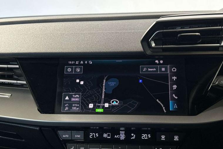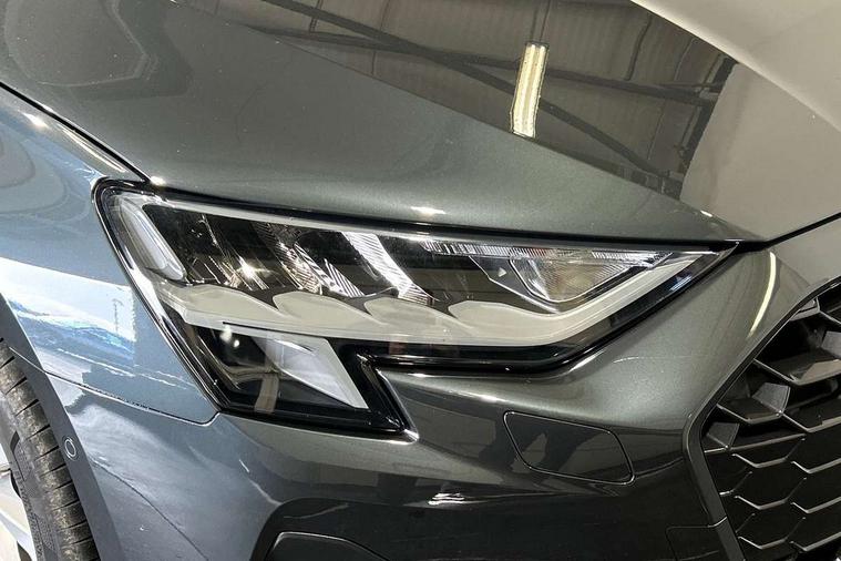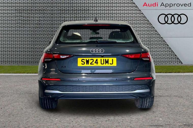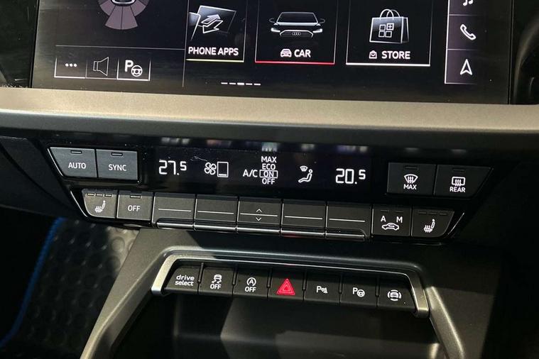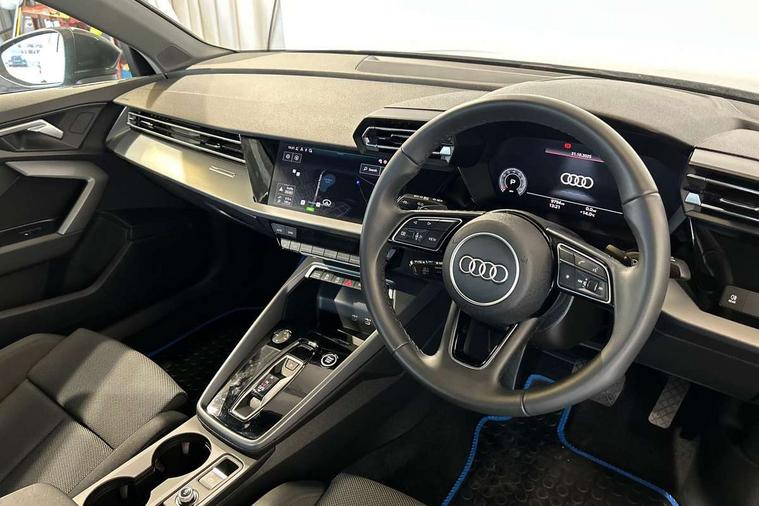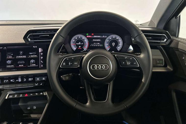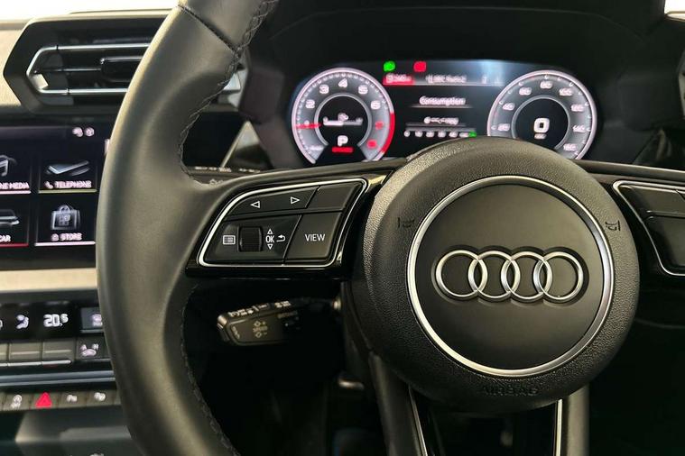 Adjustable speed limiter, Audi drive select, Audi smartphone interface with app store includes wireless Apple carplay, Android auto and Amazon alexa integration, Audi virtual cockpit plus - 12.3" full HD resolution dynamic digital instrument cluster, Automatic start/stop system with recuperation, Bluetooth interface, Camera based traffic sign recognition, Collision avoidance assistant, Cruise control, Distraction and Fatigue warning, e-Call (emergency call), Electromechanical power speed sensitive steering, Lane departure warning system, MMI Navigation Plus with high resolution 10.1" colour touch screen display, Park Assist with parking system Plus, Service indicator, Tailgate, Trip computer, Voice control system with natural language interaction, Standard suspension, Audi Phonebox light with wireless charging, Audi sound system - 10 loudspeakers including centre loudspeaker and subwoofer, DAB Digital radio, USB ports with charging function in the rear, 3rd brake light, Acoustic glass windscreen, Aluminium window trim, Auto dimming frameless rear view mirror, Body colour exterior mirrors, Body colour roof spoiler, Electrically adjustable/heated/folding/auto dimming door mirrors with integrated LED indications + kerb view function for passenger side, Exterior model badging, Front electric windows, Front radiator grill in high gloss dark chrome, Front side air inlets in grained matt black with silver frame, Heat insulating glass windscreen, LED daytime running lights, LED headlights and halogen rear lights, Light and rain sensors, Rear diffuser and grill in grained matt black with silver frame, Rear electric windows, Rear side wing doors, Rear window, rear door windows and rear side windows in clear glass, Rear wiper, 12V socket and storage compartment in front centre console, 3 seat bench in 2nd row, 3 spoke leather multifunction steering wheel with gear shift paddles, 3-zone deluxe automatic air conditioning, 4 way electrically adjustable lumbar support for driver and front passenger, 60/40 split folding rear seat bench, Front and rear headrests, Front centre armrest, Front door sill trims with aluminium inlay, Front/rear floor mats, Heated front seats, Height and reach adjustable steering wheel, Manual boot compartment lid, Manually adjustable front seats, Routine cloth upholstery with front sports seats, Seat side bolsters, Single front passenger seat, Steel grey cloth headlining, Aluminium interior elements pack - A3 Sportback, LED interior lighting pack -A3, 3x3 point rear seat belts, Driver and front passenger airbag with passenger airbag deactivation, Electronic Stabilisation Control (ESC) including ABS, ASR and EDL, First aid kit with warning triangle and 2 safety vests, Front side airbags with head airbags and interaction airbag, Hill hold assist, Pre-sense front with pedestrian and cyclist detection, Seatbelt monitoring, Tyre pressure loss indicator, Anti theft alarm, Anti-theft wheel bolts, Electronically operated child locks, Immobiliser, Remote central locking with safelock, Inlays in volcano grey fine paint finish,