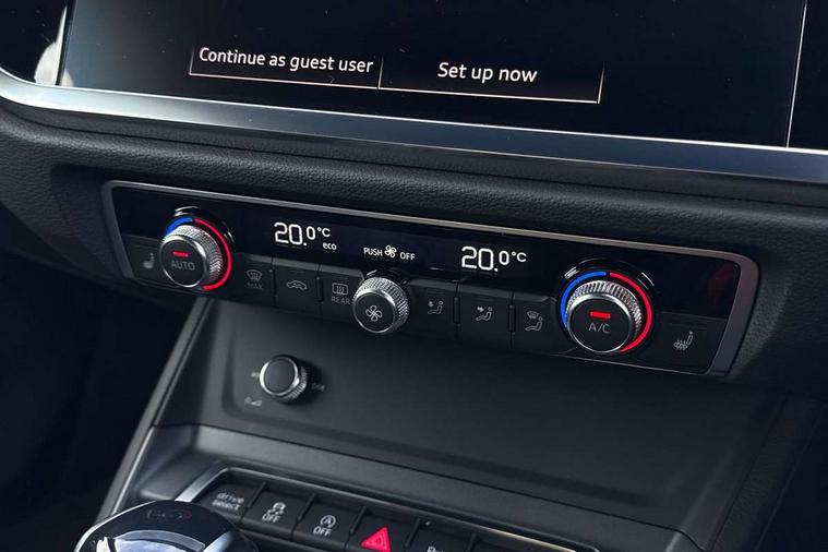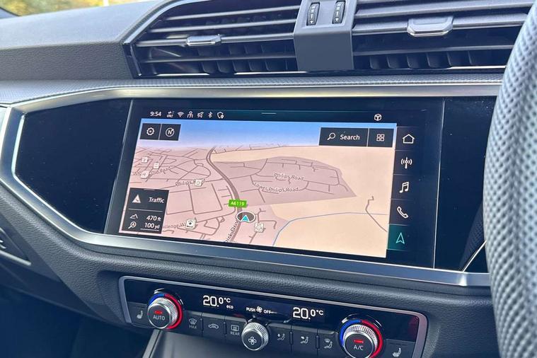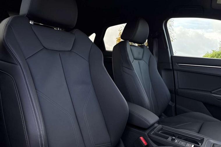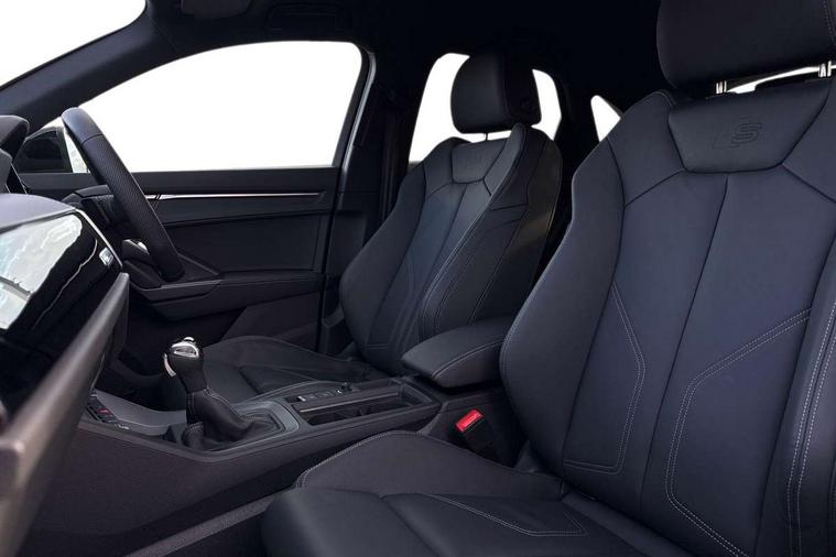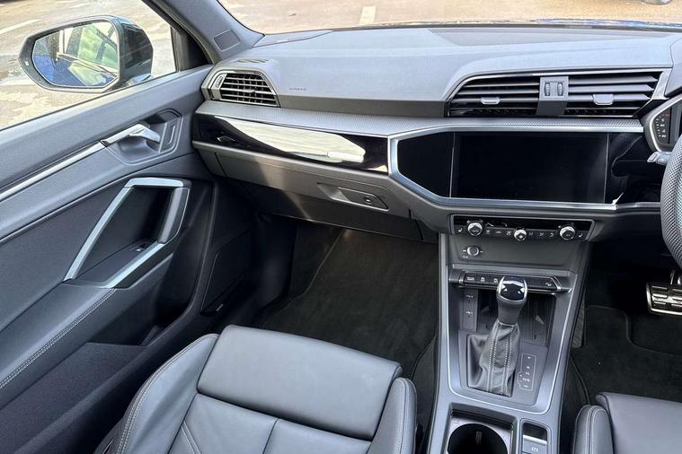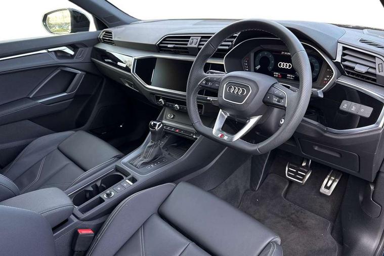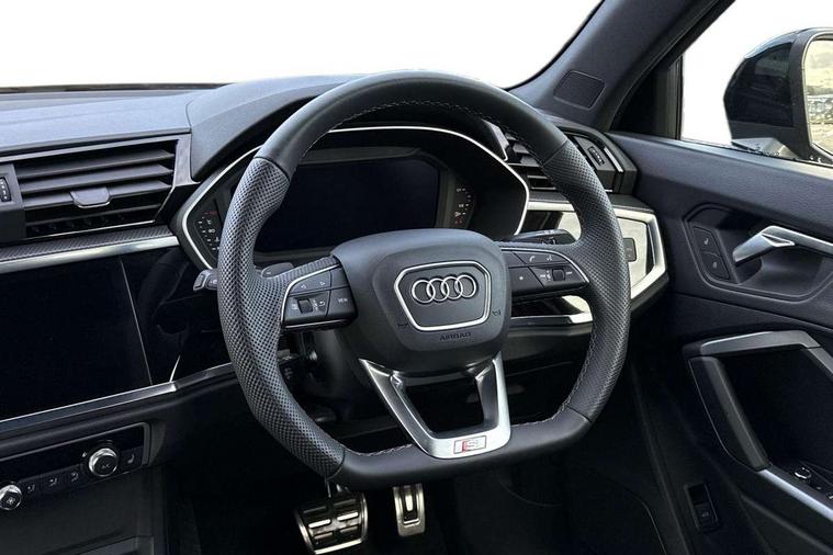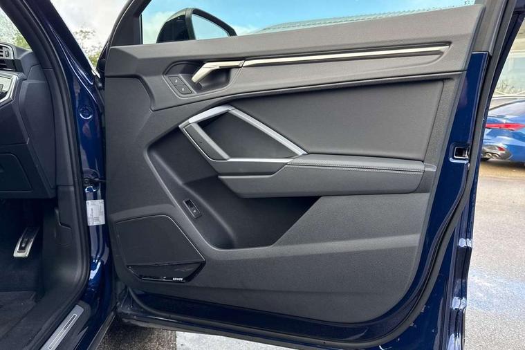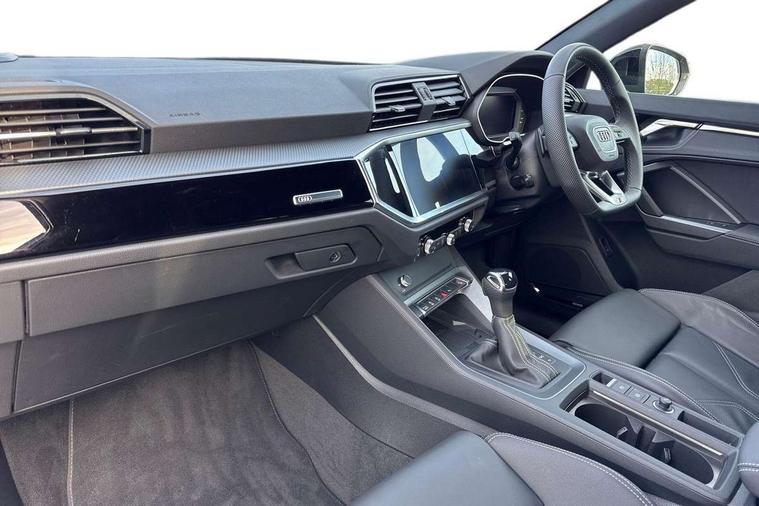 Audi connect safety and service, Audi drive select, Audi lane departure warning, Audi Virtual Cockpit - 10.25" display, Bluetooth interface, Camera based traffic sign recognition, Distraction and Fatigue warning, Legal emergency call, MMI Navigation Plus with high resolution 10.1 inch touchscreen colour display, Power operated tailgate, Progressive steering, Service interval indicator, Smartphone interface includes wireless Apple carplay/Android Auto, Start stop system with recuperation, Voice control system with natural language interaction, Diesel particulate filter, Sports suspension, 2 USB-C ports with charge and data functions, 6 passive loudspeakers, DAB digital radio module, Acoustic windscreen, Audi Beam uses LEDs to project the Audi logo onto the ground as you exit your Q3, Auto dimming door mirrors, Auto dimming frameless rear view mirror, Diffuser grille in grained matt black, Diffuser trim in selenite silver, Electrically folding, adjustable and heated door mirrors with integrated LED side indicators and kerb view function for passenger side, Front and rear electric windows, Front fog lights, Front underbody protection in manhattan grey paint finish, High gloss black finish B and C pillars, LED Dynamic rear indicators, LED headlights with LED daytime running lights, LED rear lights, LED third brake light, Privacy glass dark tinted rear and rear-side windows (from B-pillar backwards), Rain and light sensors, Rear side wing doors, Rear underbody protection in matt black, Rear wiper, S line front and rear bumpers and side skirts in contrasting Manhattan grey paint finish, Variable front intermittent wipers, 12V socket in rear centre console, 3 seat bench in 2nd row, 40:20:40 folding with manual adjustment for 60:40 forwards/backwards position and backrest angle, Adjustable rear seat bench/backrest with centre armrest and cupholder, Black cloth headlining, Dual zone electronic climate control, Electric lumbar support, Front and rear black floor mats with contrast stitching, Front and rear headrests, Front centre armrest, Height and reach adjustable steering wheel, Illuminated door sill trims with S logo, ISOFIX child seat mounting for front passenger with airbag deactivation and outer rear seat including top tether attachment point for outer rear seats, Luggage compartment sill protection in stainless steel, Manual front seats with height adjustment, Perforated leather gearknob, Single front passenger seat, Stainless steel pedals, Twin leather upholstery with front sport seats + S embossing, Black styling pack - Q3, Non smoking pack - Q3, 3x3 point rear seatbelts, 6 airbags - Driver, front passenger, curtain and side windows, Audi pre-sense front with pedestrain and cyclist recognition, Electrically operated child locks on rear doors, Electromechanical parking brake, Electronic stabilisation control including ABS, ASR and EDL, Front seatbelt reminder, Hill descent control, Hill hold assist, Pre sense basic, Seatbelt monitoring, Tyre pressure warning, Warning triangle and first aid kit, Anti theft alarm, Anti theft wheel bolts, Immobiliser, Remote central locking, Aluminium look interior elements, Detail dashboard around MMI touch colour display in glass look, black with surround in aluminium look, Leatherette door armrest, Piano black inlay,