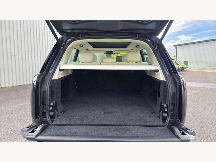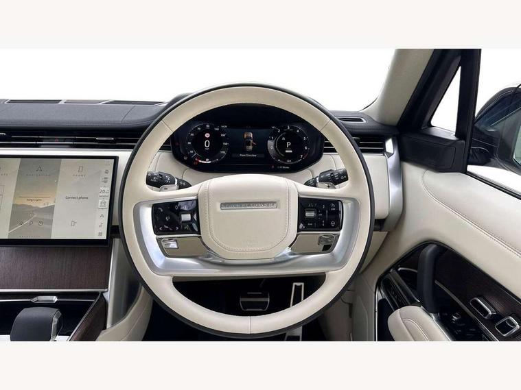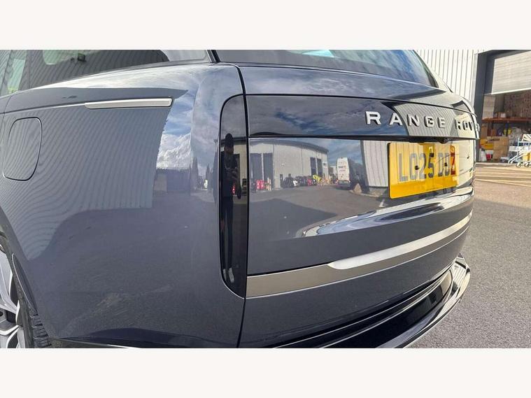 13.1" Touchscreen, 3D surround camera inc frwd traffic detection, vehicle clearance guidance, 3D view, clearsight ground view, manoevure light, 360 parking aid, wade sensing, All Terrain Info Centre, All wheel steering, Android Auto, Apple car play, Blind spot assist, Bluetooth connectivity streaming, Driver condition response, Eco mode, Electric power assisted steering (EPAS), Emergency call service, Front and rear parking aid, Head up Display, Interactive driver display, Lane keep assist, Park assist, Powered gesture tailgate/boot lid, Rear collision monitor, Rear traffic monitor, Remote, Traffic sign recognition with adaptive speed limiter, Wi-Fi Enabled with data plan, Wireless device charging with phone signal booster, 7 kW onboard charger, 8 speed automatic transmission, Active damper technology system, Adaptive dynamics, All terrain progress control, All Wheel Drive (AWD), Automatic access height, Home charging cable 5m Mode 2 including plugs, Public charging cable 5m Mode 2 including plugs, Terrain Response 2 Auto, Twin speed transfer box, Digital Audio Broadcast radio-DAB, Pivi pro including smart settings, Connected navigation pro, nuance speech, USB socket, Acoustic laminated windscreen, Animated directional indicators, Automatic headlights, Automatic levelling headlights, Centre high mounted stop light, Electric windows with one touch open/close and anti trap, Engine cover, Flush deployable exterior door handles, Front and rear recovery eyes, Front fog lights, Headlamp power wash, Heated rear window, Heated washer jets, Illuminated aluminum treadplates with Range Rover script, LED tail lights, No badges, Power fold, auto-dimming, heated door mirrors with approach lights, Rain sensing windscreen wipers, Rear boot, Rear fog lights, Rear side wing doors, Side repeater indicators in mirror, Trailer stability assist, Winter wiper park position, 12V power sockets, 3 seat bench in 2nd row, Air quality sensor, Auto folding loadspace cover, Bright metal pedals, Cabin air purification pro, Cabin lighting, Customer configurable single point entry, Driver and passenger front seat armrests, Easy boot loading, Ebony Carpet, Front and rear cupholders, Front and rear grab handles, Front head restraints, Gearshift paddles, Heated steering wheel, Hook in load space, Loadspace light, Luggage tie down in loadspace, Multifunction steering wheel, Rear centre armrest, Rear head restraints, Rear ISOFIX, Single front passenger seat, Soft close doors, Upper and lower glovebox, Online pack with data plan - Range Rover, 3x3 point rear seat belts, Anti-lock braking system (ABS), Brake hold function, Cornering brake control (CBC), Customer configurable autolock, DSC - Dynamic Stability Control, Electronic brake force distribution, Electronic parking brake, Electronic traction control, Emergency braking, Front airbags with passenger seat occupant detector, Front side airbags, Hill descent control, Hill launch assist, Low traction launch, Occupant protection assist, Power operated child locks, Roll stability control, Tyre pressure monitoring system (TPMS), Immobiliser, Intrusion sensor and alarm, Keyless entry, Locking wheel nuts, Remote central locking, Noble chrome controls,