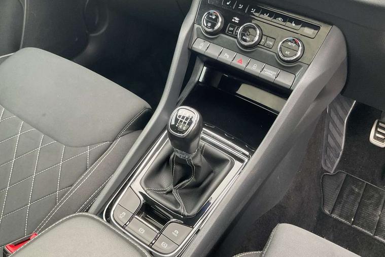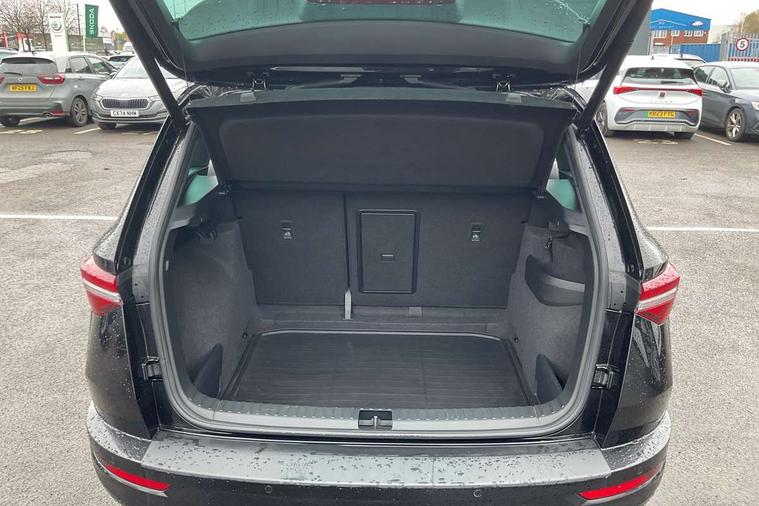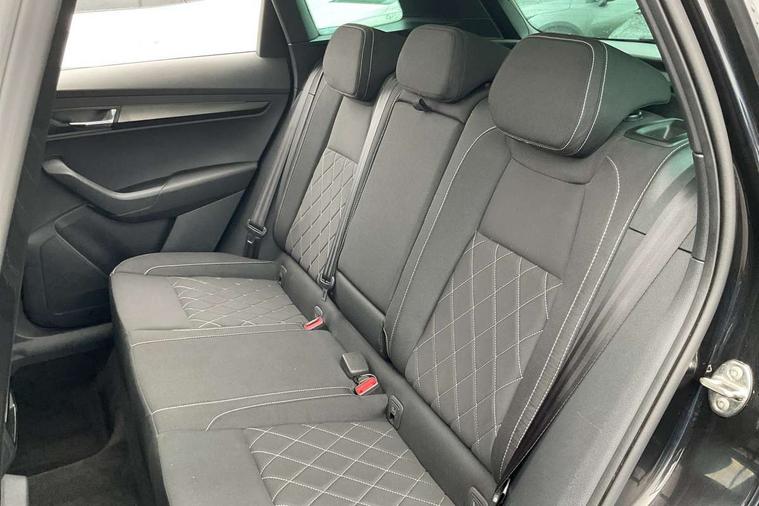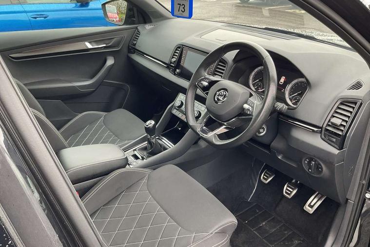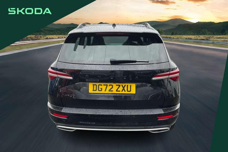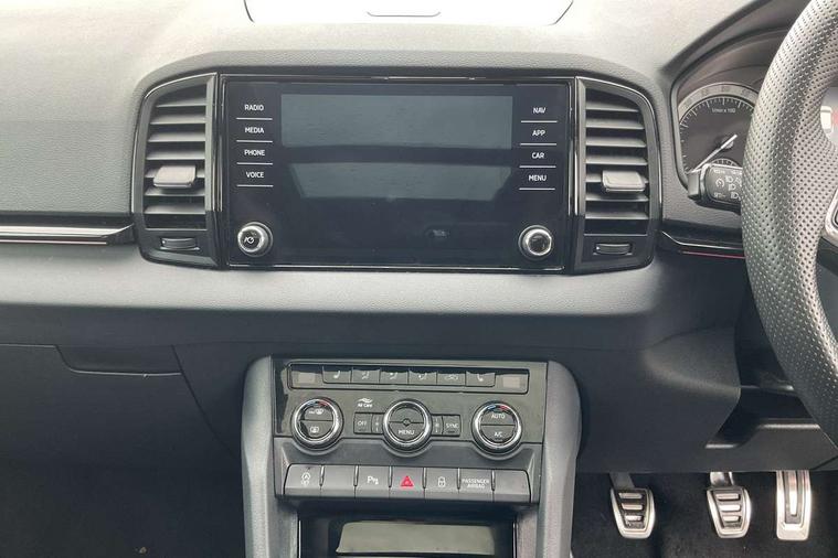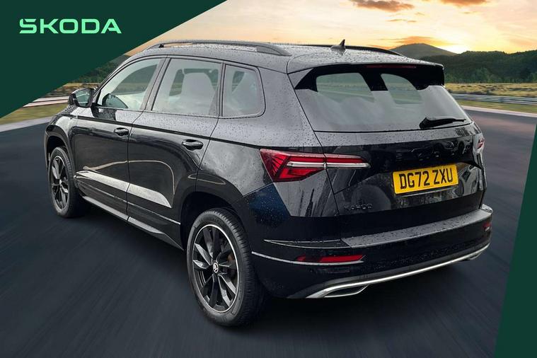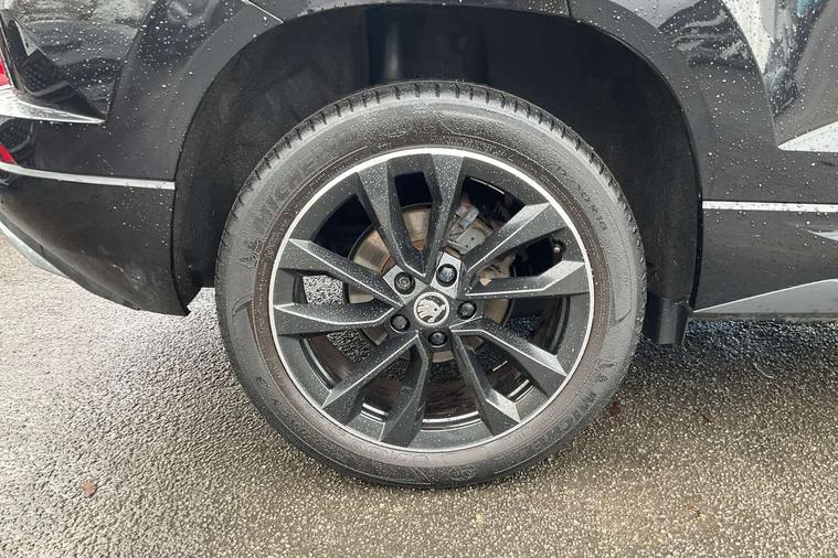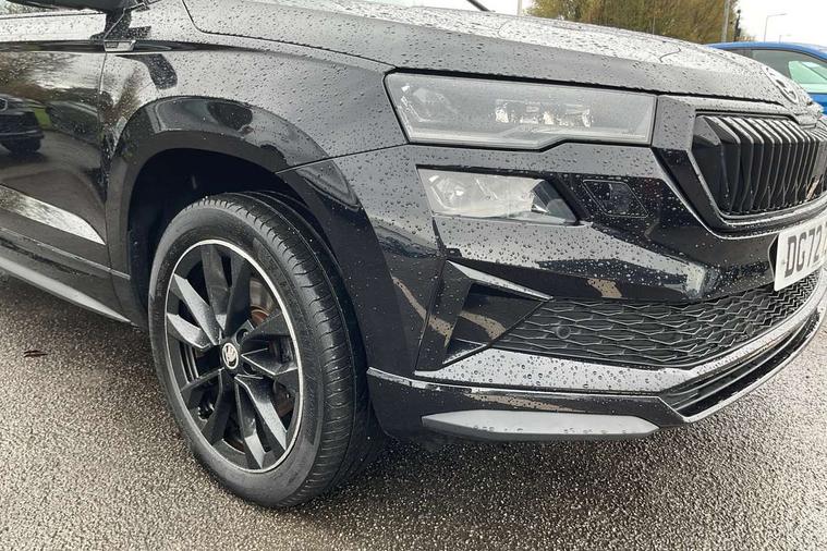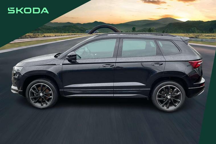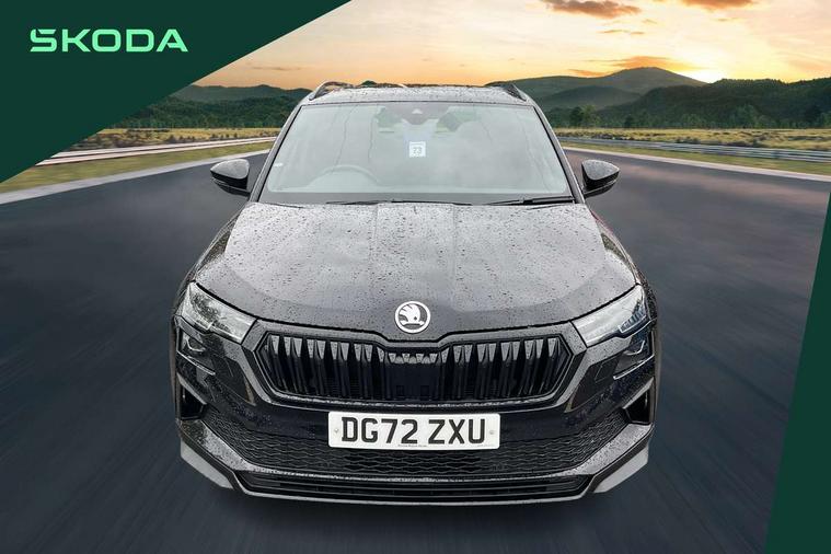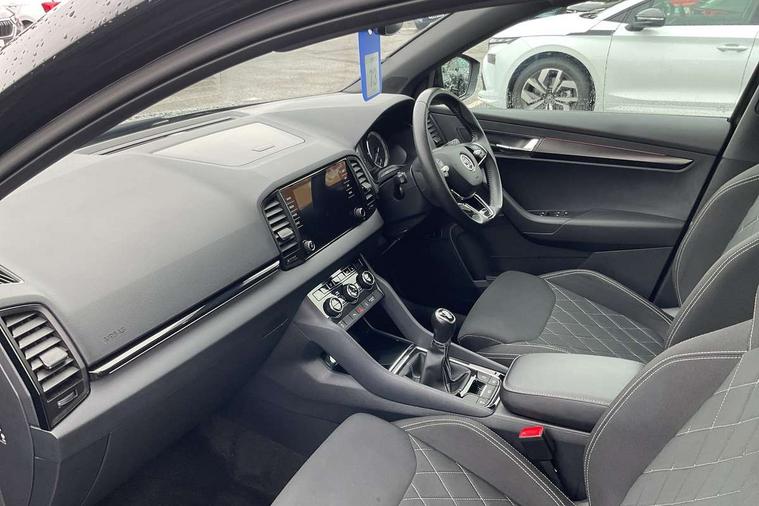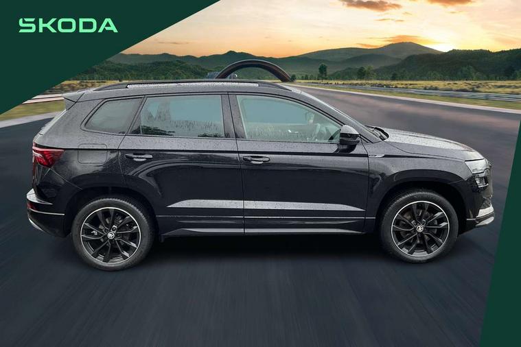 8" Digital display, Care connect, Driver fatigue sensor, Emergency services call system, Outside temperature gauge, Service interval indicator, SmartLink wireless for Apple and wired for Android, Start/stop system with regenerative braking, USB C Port x 2 in front centre console, Virtual pedal with electrically operated boot door, Diesel particulate filter, 8 speakers, DAB radio with Bluetooth, USB connection, Acoustic glass, Aero front windscreen wipers with intermittent function, Auto dimming rear view mirror with light and rain sensors, Automatic headlight control system, Black door mirrors, Black electric window control buttons, Black radiator grille, Black roof rails, Body colour door handles, Electric front and rear windows with child proof lock, Front door steps with SportLine logo, Heated rear windscreen, LED daytime running lights, LED rear lights with high functionality welcome effect and dynamic indicators, Light assistant (coming/leaving home/tunnel light), Panoramic sliding sunroof, Privacy glass, Protective door side sills in body colour, Rear diffuser, Rear side wing doors, Rear spoiler, Rear wiper, Safety reflectors on front doors, Skoda lettering on tailgate in black, Sportline badge on front fender, Sportline decorative inserts with badging, Sports front and rear bumpers, Third brake light, 1.5 litre bottle holders in driver and front passenger door panels, 12V socket in boot, 12v socket in front centre armrest with storage compartment and rear air vents, 2 Folding hooks and nets in boot, 3 rear height adjustable headrests, 3 seat bench in 2nd row, 3 spoke leather sports multifunction steering wheel and silver stitching, 4 foldable roof handles with rear coat hooks, Black floor carpet, Black roof headlining, Chrome inner door handles, Double sided boot floor, Foldable hooks in the boot, Front head restraints, Glovebox, Height adjustable front three point seats belts with tensioners, Height/reach adjust steering wheel, Ice scraper, Illuminated luggage compartment, Interior noise suppression, Isofix child seat preparation outer rear, Manual lumbar support for front seats, Pen holder, Pollen filter, Rear reading lights, Rear seats fixed folding and divided 60:40, Rubbish bin door, Safety vest holder, Single front passenger seat, Solid rear boot cover, Storage box in upper central dashboard closed, Sunvisors with illuminated vanity mirrors, Textile floor mats, Ticket holder, Titan black interior ceiling, Umbrella under passenger seat, Welcome animation with sportline logo, Light Pack - Karoq, Parking pack - Karoq, Airbags - Front side, head, knee and curtain, Automatic door unlocking in case of crash, Automatic fuel cut off in case of crash, Child locks on rear doors, Driver airbag, Electronic parking brake with auto hold function, Emergency rear braking signal, ESC including ABS, MSR, ASR, EDS, HBA, DSR, RBS, MKB and traction control, Front assist radar scanning of the space in front of the car with automatic braking, Hill hold control, Passenger airbag with switch-off function, Pedestrian monitor, Seatbelt reminder signalisation and pretensioner for all seats, Three point seatbelts rear, Two tone horn, Tyre pressure display, Tyre pressure monitor, Alarm with interior monitoring, back up horn and tilt sensor with safe function, Electronic engine immobiliser, Keyless entry and start/stop system with SAFE system, Remote central locking with 2 remote folding keys, Black air vent surround, Black centre console, Satin black dashboard, Satin black door trim, 19" Sagitarius anthracite alloy wheels with matt black aero inserts, Anti-theft wheel bolts protection, Matt black aero hub caps, Storage on wheel cover,