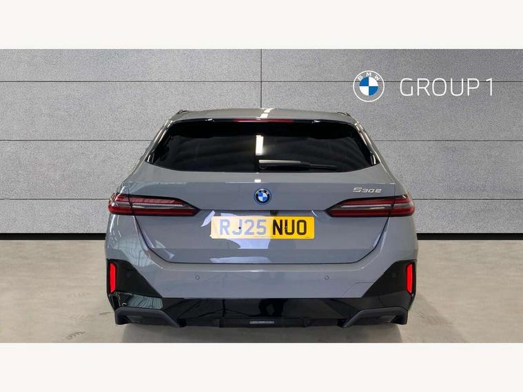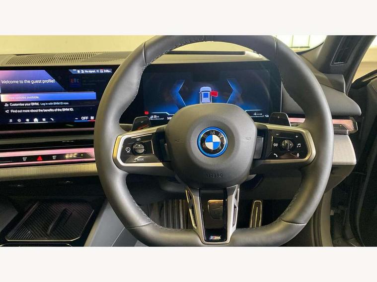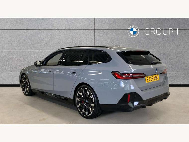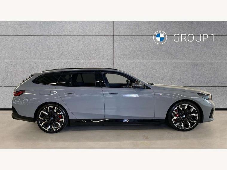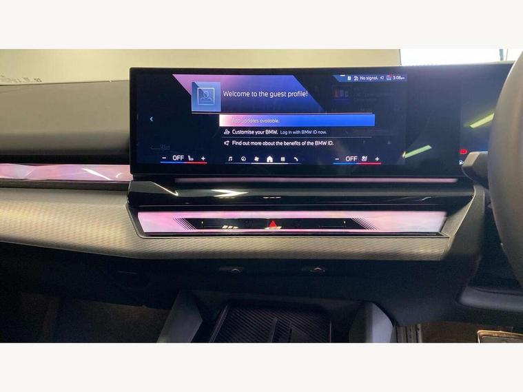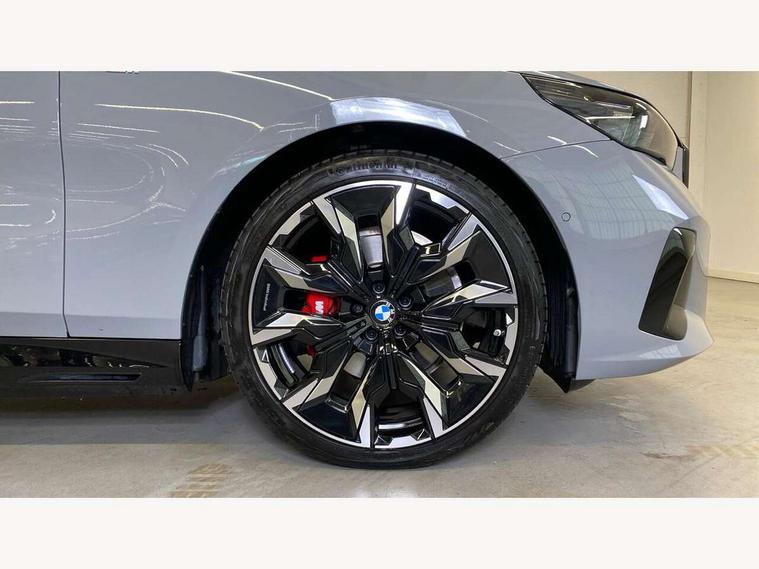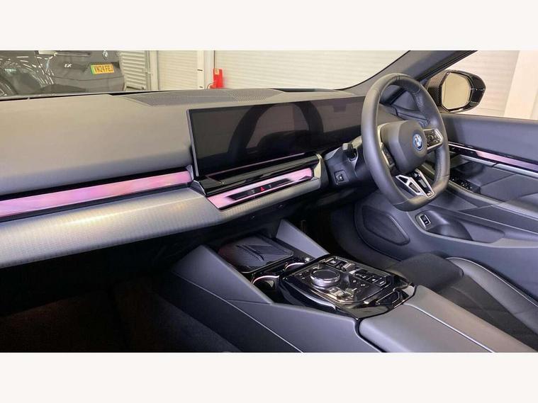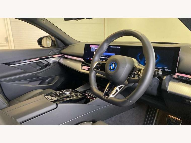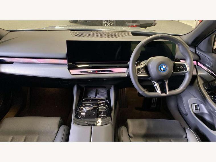 Automatic tailgate operation, BMW ConnectedDrive online services, BMW Iconic sounds electric, BMW legal emergency call, BMW Teleservices, Brake pad wear indicator, Cruise control with brake assist, Driving Assistant Plus Preparation, Front collision warning with brake intervention, Lane departure warning with active return, Left turn warning with brake function, Multifunctional instrument panel, Oil sensor for level and grade, On board computer inc. average speed, fuel consumption, liquid crystal Info display, journey computer, outside temperature display, personal profile, On-board diagnosis - OBD, PAS, Personal e-SIM, Powered by Operating System 7.0, Run flat indicator, Service interval indicator, Speed limit Info with manual speed limit assist, Stop/start button, 8 speed automatic steptronic transmission with gearshift paddles, AC charging cable professional (mode 3) for public charging, Expert mode, Launch control, DAB tuner, Acoustic glazing, Adaptive LED Headlights, Automatic cornering lights, Automatic windscreen wipers and automatic headlight, BMW selective beam, Body colour door handles, Body coloured bumpers, Dynamic brake lights with LED technology, Electric adjustable door mirrors, Electric front and rear windows with fingertip open/close + anti-trap facility and comfort closing function, Follow me home headlight function, Headlight elements in blue, Heated windscreen washer jets, LED daytime running lights, LED third brake light, Light colour close to that of ordinary daylight, M high gloss shadow line with extended contents - Radiator grille frame, struts and strip in rear light, M light shadowline - Dark design of selected elements of the headlight and rear lights, M rear spoiler, Optimum, homogeneous illumination of the road, Rear side wing doors, Rear wiper, 2 zone automatic air conditioning, 3 seat bench in 2nd row, 3 spoke leather M steering wheel in BMW M specific design with M badge, Armrest - front and rear integrated door trim, centre console includes storage compartment, rear centre includes 2 cupholders, Child seat ISOFIX attachment with rear outer seats includes top tether, Electric adjustable front sports seats, Electric adjustable steering column, Electrically adjustable lumbar support for driver and front passenger, Heated driver and front passenger seats, High-gloss black door switch cluster, power window switch and tailgate button on first and second row seat, M Anthracite headlining, M Sport pedal covers in stainless steel, Rear headrests, Single front passenger seat, Through loading system with 40/20/40 rear seat backrest split, Velour floormats, Wireless charging tray, Ambient lighting pack - 5 Series/I5, BMW Iconic glow kidney grille exterior package, Connected package professional - 5 Series/I5, Driving assistance pack - 5 Series/I5, Expanded exterior mirror package - 5 series/I5, M high gloss shadow line pack - 5 Series/ I5, M Sport exterior styling pack - 5 Series/I5, 3 rear three point seatbelts, Active protection, Airbag deployment is controlled with respect to the intensity and scope, Anti-lock braking system (ABS), Brake assist, Brake energy regeneration, Cornering brake control (CBC), Crash sensor activating central locking release, hazard warning lights, fuel cut off and interior lighting, Driver and front passenger airbags, Driver central airbag, Driver/front passenger side airbags, DSC - Dynamic Stability Control, Dynamic brake control, Dynamic Traction Control - DTC, Electromechanical parking brake with automatic drive away release and auto hold function, Electronic brake force distribution, Engine drag torque control, Front and rear brake discs with interior ventilation, Front and rear curtain airbags, Front head restraints with anti-whiplash, Head airbags for first and second row seats, Hill start assist, Locking of doors after driving off, M seat belts, Mechanical child proof lock on rear doors, PC iBrake PostCrash approach control warning with light braking function, Side impact protection, Trailer stability control, Two tone horn, Tyre pressure monitoring system, Warning triangle and first aid kit, Alarm system, Locking wheel bolts including wheel bolt adapter, Tyre repair kit,