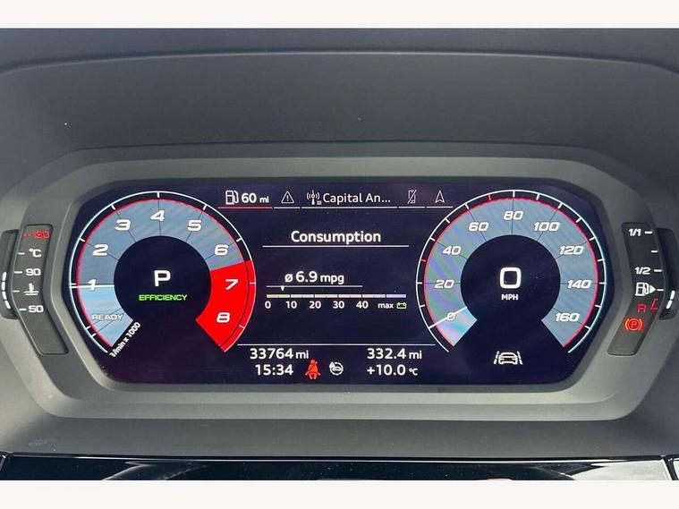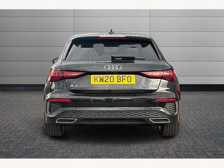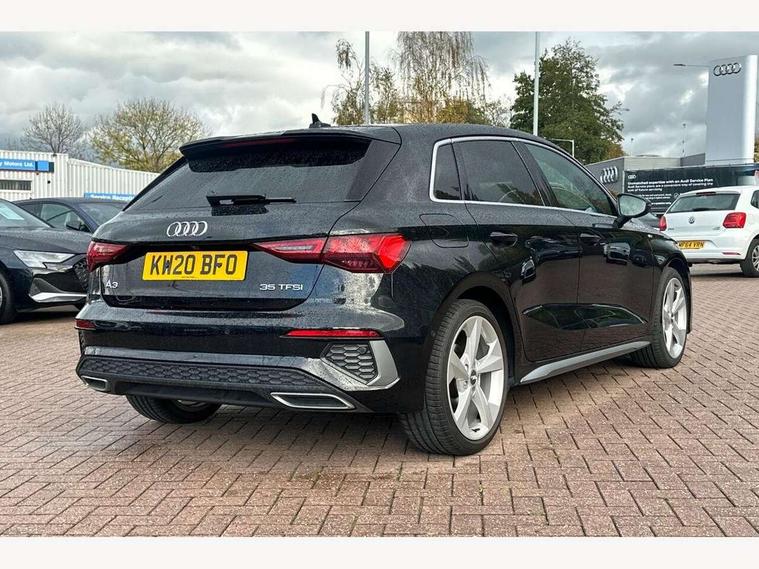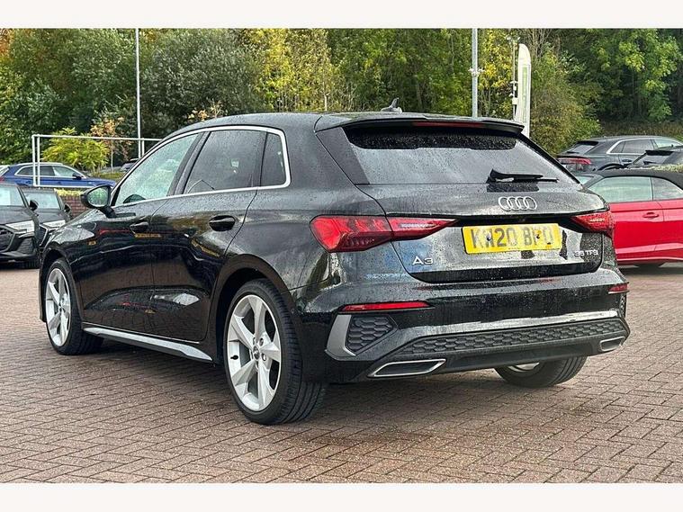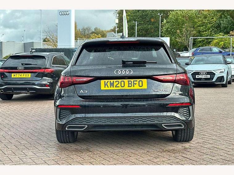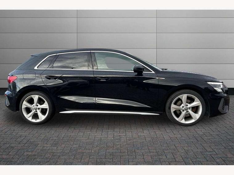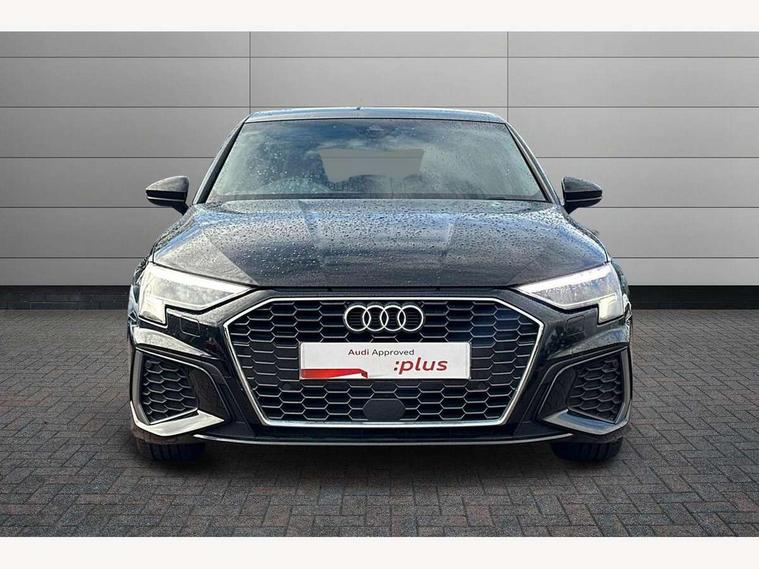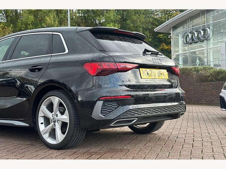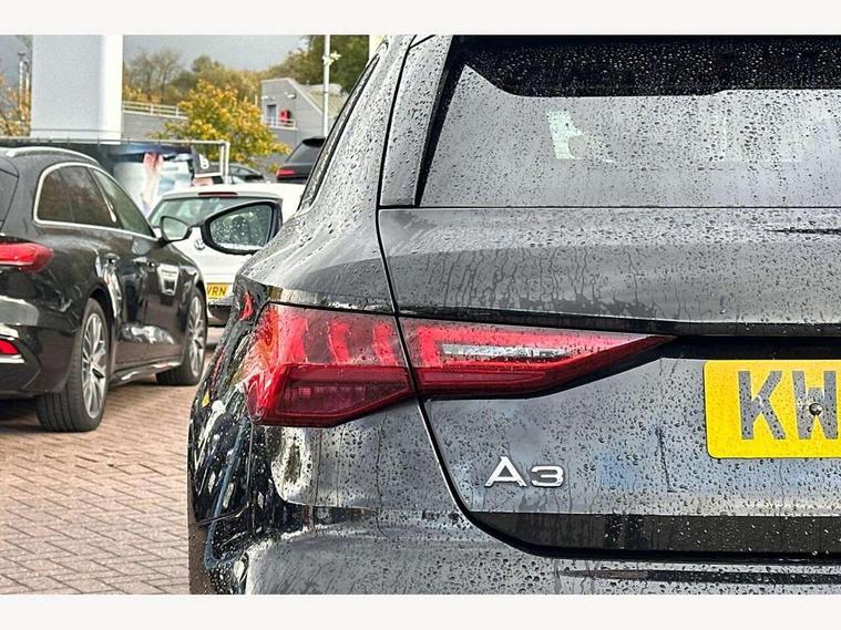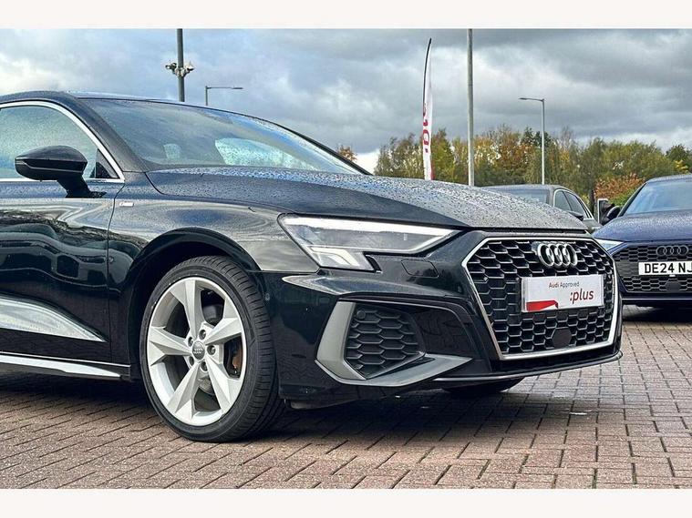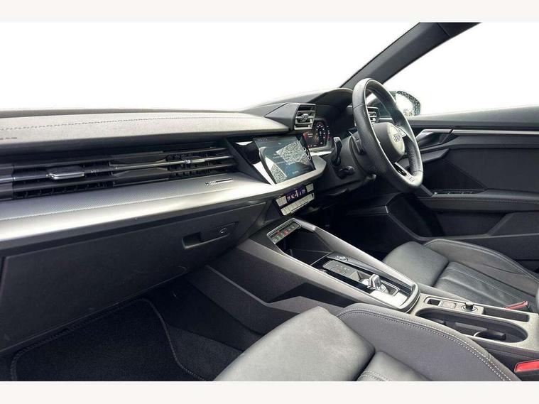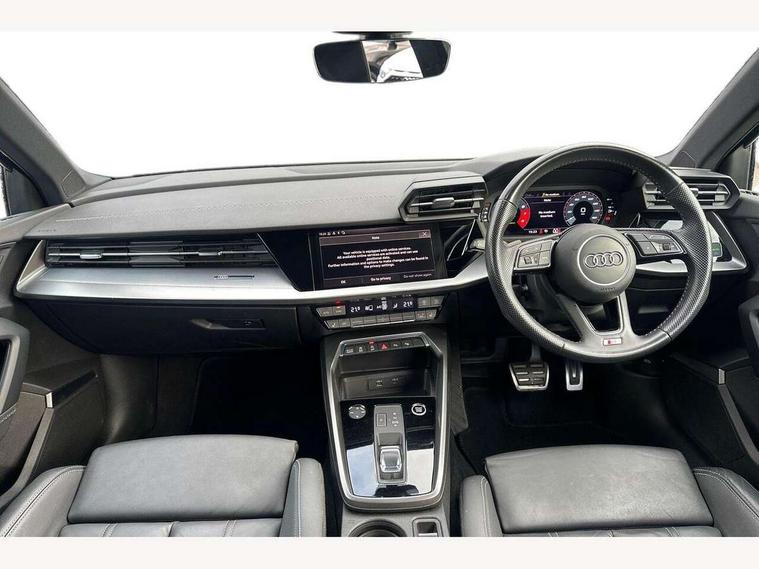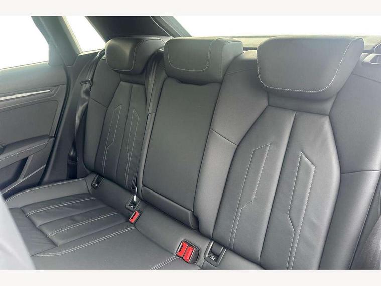 Audi connect emergency call and service, Audi drive select (Auto, Comfort, Dynamic, Efficiency and Individual), Audi smartphone interface, Audi Virtual Cockpit - 10.25" digital and colour instrument cluster, Automatic start/stop system with recuperation, Bluetooth interface, Collision avoidance assistant, Electromechanical power speed sensitive steering, Lane departure warning system, MMI Navigation Plus with high resolution 10.1" colour touch screen display, Service indicator, Trip computer, Voice control system with natural language interaction, 1xUSB-A and 1xUSB-C connection, 6 passive loudspeakers, DAB Digital radio, Acoustic glass windscreen, Aluminium window trim, Auto dimming frameless rear view mirror, Body colour exterior mirrors, Electrically adjustable/heated/folding/auto dimming door mirrors with integrated LED indications + kerb view function for passenger side, Front electric windows, Illuminated aluminium inserts front door sills with S logo, LED daytime running lights, Light and rain sensors, Privacy glass - dark tinted rear window, rear door and side windows, Rear electric windows, Rear side air outlets in grained matt black, Rear wiper, S line bumpers, S roof spoiler, 12V socket and storage compartment in front centre console, 40/20/40 split folding rear seat bench with cupholder, Black cloth headlining, Dual zone electronic climate control, Front and rear centre armrest in leather, Front and rear headrests, Front/rear floor mats, Height and reach adjustable steering wheel, Interior lighting - glove compartment light and right hand side, Luggage compartment floor covering, Manual boot compartment lid, Manually adjustable front seats, Seat side bolsters, Stainless steel pedals and front footrest, Twin leather upholstery with front sports seats S embossed logo, Aluminium interior elements pack - A3 Sportback, S line styling pack - A3 Sportback, 3x3 point rear seat belts, Driver and front passenger airbag with passenger airbag deactivation, Electronic Stabilisation Control (ESC) including ABS, ASR and EDL, First aid kit with warning triangle and 2 safety vests, Hill hold assist, Pre-sense front with pedestrian and cyclist detection, Seatbelt monitoring, Tyre pressure loss indicator, Anti theft alarm, Anti-theft wheel bolts, Electronically operated child lock, Immobiliser, Remote control central locking, Accent surfaces in the dashboard and centre console in platinum grey silk effect paint finish, Dark spectrum aluminium inlays,