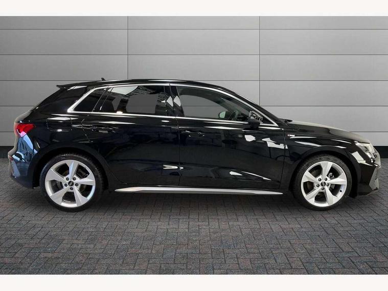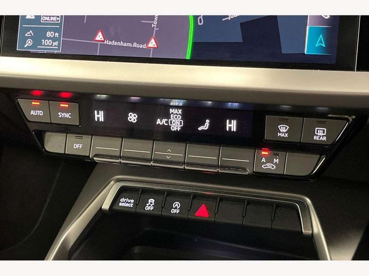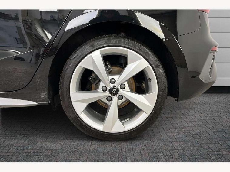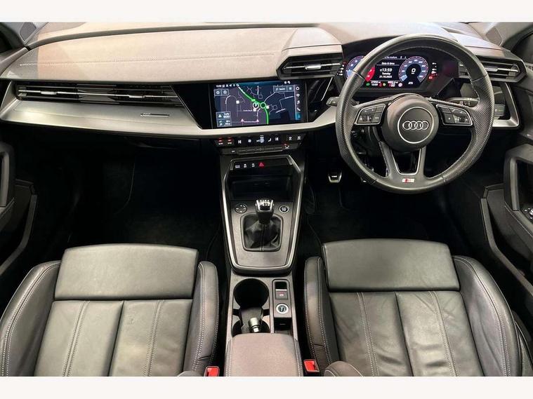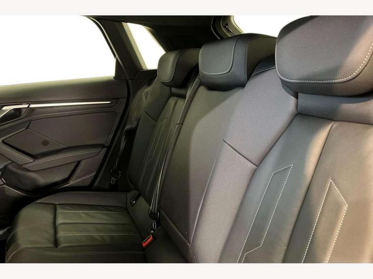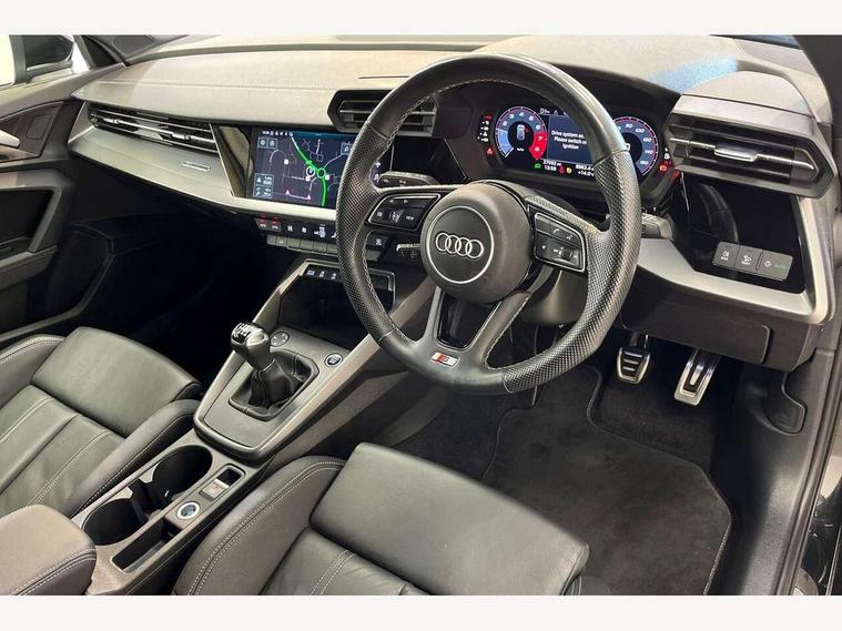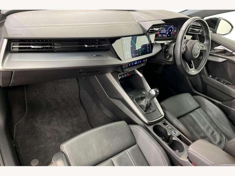 Audi drive select (Auto, Comfort, Dynamic and Individual), Audi smartphone interface, Audi Virtual Cockpit - 10.25" digital and colour instrument cluster, Automatic start/stop system with recuperation, Bluetooth interface, Camera based traffic sign recognition, Collision avoidance assistant, Cruise control, e-Call (emergency call), Electromechanical power speed sensitive steering, Lane departure warning system, MMI Navigation Plus with high resolution 10.1" colour touch screen display, Rear parking sensors, Service indicator, Trip computer, Voice control system with natural language interaction, Sports suspension, 2xUSB-C connection with data and charging functions, 6 passive loudspeakers, DAB Digital radio, 3rd brake light, Acoustic glass windscreen, Aluminium window trim, Auto dimming frameless rear view mirror, Body colour exterior mirrors, Electrically adjustable/heated/folding/auto dimming door mirrors with integrated LED indications + kerb view function for passenger side, Front electric windows, Illuminated door sills with aluminium inserts at the front with S logo, LED daytime running lights, LED headlights with LED rear lights and dynamic rear indicators, Light and rain sensors, Privacy glass - dark tinted rear window, rear door and side windows, Rear electric windows, Rear side air outlets in grained matt black, Rear side wing doors, Rear wiper, S line bumpers, S roof spoiler, 12V socket and storage compartment in front centre console, 3 seat bench in 2nd row, 3 spoke leather multifunction steering wheel, 4 way electrically adjustable lumbar support for driver and front passenger, 60/40 split folding rear seat bench, Black cloth headlining, Dual zone electronic climate control, Front and rear centre armrest in artificial leather, Front and rear headrests, Front/rear floor mats, Height and reach adjustable steering wheel, Interior lighting - glove compartment light and right hand side, Luggage compartment floor covering, Manual boot compartment lid, Manually adjustable front seats, Seat side bolsters, Single front passenger seat, Stainless steel pedals and front footrest in black, Twin leather upholstery with front sports seats S embossed logo, Aluminium interior elements pack - A3 Sportback, LED interior lighting pack - A3 Sportback, S line styling pack - A3 Sportback, 3x3 point rear seat belts, Driver and front passenger airbag with passenger airbag deactivation, Electronic Stabilisation Control (ESC) including ABS, ASR and EDL, First aid kit with warning triangle and 2 safety vests, Front side airbags with head airbags and interaction airbag, Pre-sense front with pedestrian and cyclist detection, Seatbelt monitoring, Tyre pressure loss indicator, Anti theft alarm, Anti-theft wheel bolts, Electronically operated child locks, Immobiliser, Remote control central locking, Dark spectrum aluminium inlays, accent surfaces in the dashboard and centre console in platinum grey silk effect paint finish,