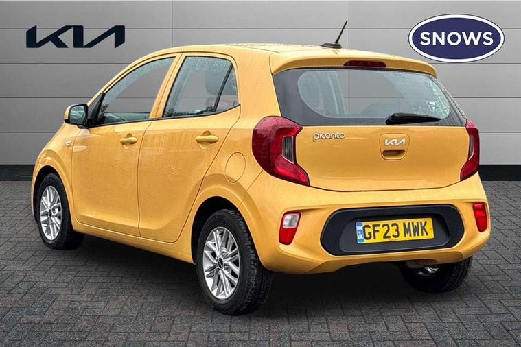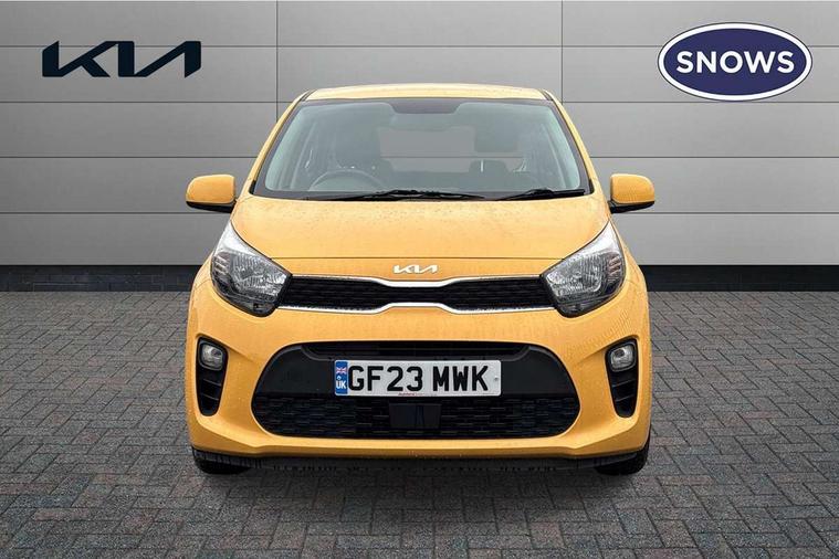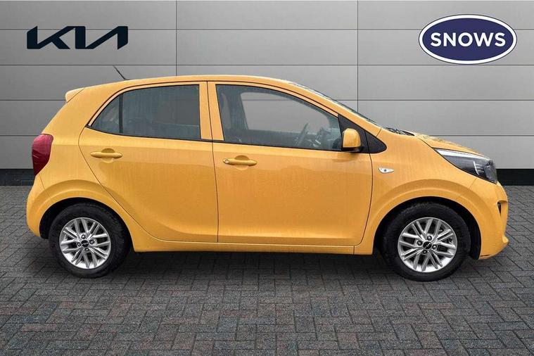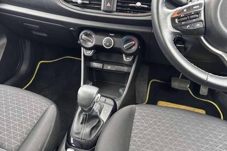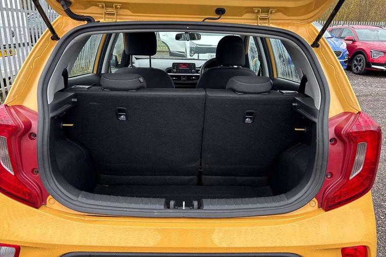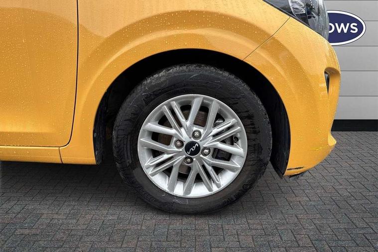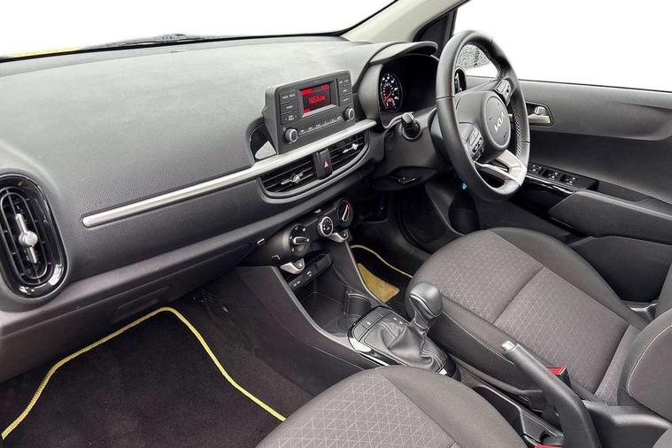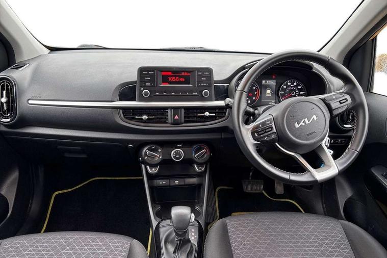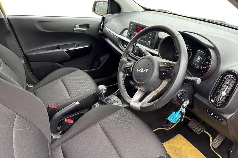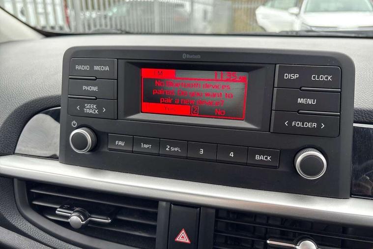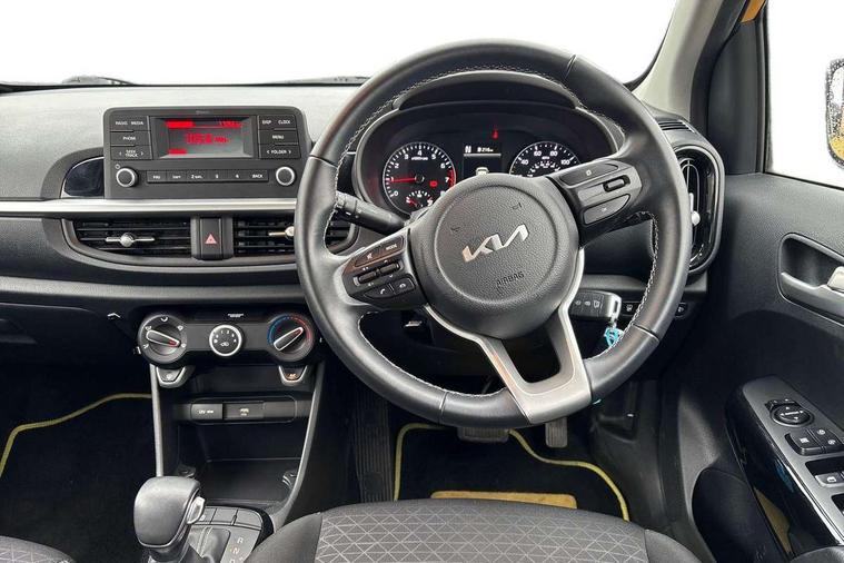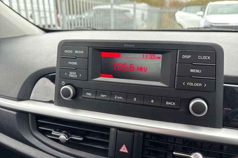 3.8" monochrome audio display with RDS and DAB, Emergency call service, Emergency stop signalling system, External temperature gauge, Motor driven power steering, Tachometer, Tailgate, Trip computer, 4 speaker audio system, Bluetooth with music streaming, Steering wheel mounted controls, USB ports for connection of a media device, Automatic headlight control system, Black radiator grille with chrome surround, Body colour bumpers, Body colour mirrors and door handles, Day/night rear view mirror, Daytime running lights, Electric adjustable heated door mirrors, Front and rear electric windows with drivers's auto up/down function, Headlamp levelling, Heated rear window, High mount brake light, MFR - Multi Focus Reflector halogen headlights with black bezel, Rain sensor, Rear fog lights, Rear side wing doors, Rear wash/wipe, Speed variable front wipers, Tinted glass, Visible VIN plate, Welcome and follow-me home light functionality, 1 x rear coat hook, 12V power point front, 2 seat bench in 2nd row, 3 x passenger assist grips, 60/40 split/folding 2nd row of seats, All round height adjustable headrests, Cupholders in centre console, Driver and front passenger sunvisor with vanity mirror, Driver seat height adjust, Front cabin lights, Glovebox, High gloss lower centre fascia trim, door armrest and air vents, ISOFIX Child seat top tethers and anchor fixings, Leather trimmed steering wheel and gearshift, Luggage area light, Luggage area parcel shelf, Manual air conditioning, Passenger front seatback pockets, Premium cloth upholstery, Silver paint finished interior door handles, Single front passenger seat, Slide/reclining front seats, Tilt adjustable steering wheel, Advanced Driver Assistance Pack - Picanto, 2 x 3-point rear seatbelts, ABS/EBD, Automatic unlocking of doors in case of impact, Dual front airbags, ESC + BAS + VSM + HAC, Front passenger airbag cut-off switch, Front seatbelt height adjusters, Front seatbelt pretensioners + load limiters, Hill hold control, Knee airbags, Rear child proof door locks, Seatbelt warning, Side impact protection, Torque vectoring brake based and straight line stability (SLS), Traction control, Twin curtain airbags, Twin front side airbags, Tyre pressure monitoring system, Anti theft alarm, Engine immobiliser, Folding key, Locking wheel nuts, Remote central door locking, 14" alloy wheels, Tyre mobility kit,