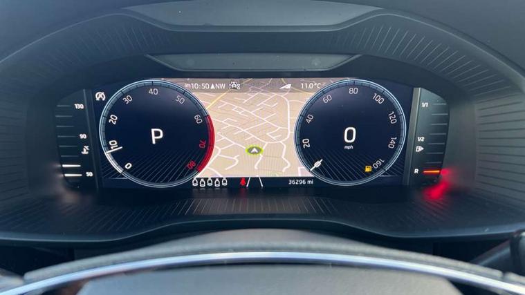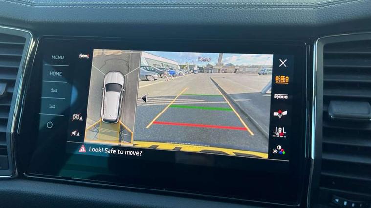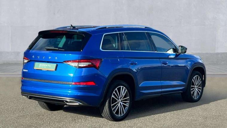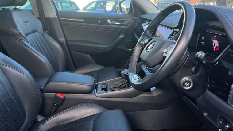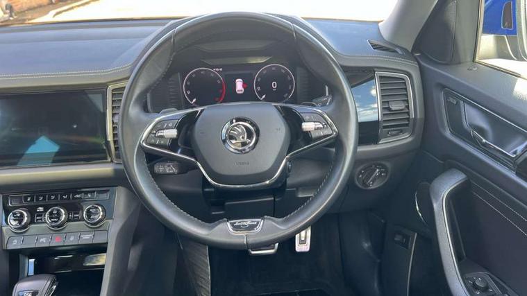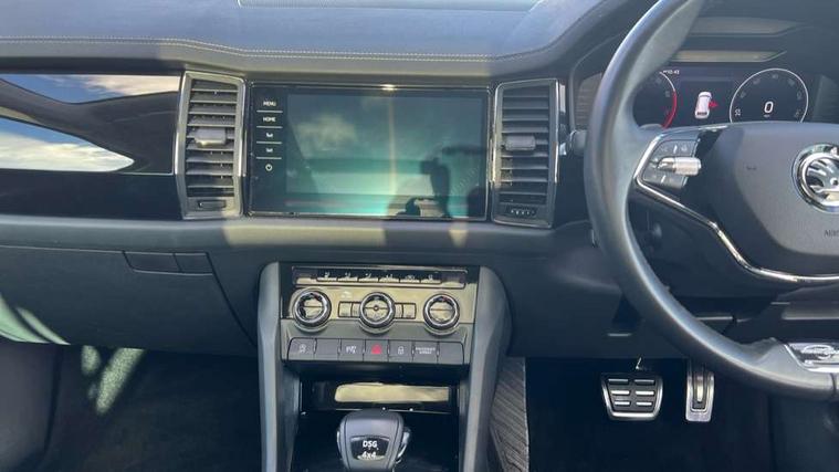 Area view, Bluetooth system, Columbus satellite navigation with 9.2" touchscreen, integrated Wi-Fi, web radio, E-call, ECO Stop/start function, Exterior temperature indicator, Progressive steering, Smartlink wireless for apple carplay and wired for android auto, Speed limiter, Tailgate unlocking from outside, USB C Port x 2 in front centre console, Virtual Cockpit - 10.25" digital display, Wireless charging, Canton sound system, DAB Digital radio, Aero front windscreen wipers with intermittent function, Aero rear window wiper, Auto dimming rear view mirror, Black wheel arch surrounds, Body colour bumpers, Body colour door mirrors and handles, Body colour door panels, Chrome front grille, Chrome roof rails with chrome window surround, Electric front and rear windows, Extended rear spoiler with finlets in gloss black, Front fog lights, Full LED matrix headlights with AFS (adaptive front light system), cornering function and AWL (all weather lighting system), Headlight washers, Heated rear window, Invisible tailpipe, L&K front and rear bumpers including lower rear chrome strip, LED daytime running lights, LED rear fog light, LED third brake light in rear spoiler, Off-road style lower front bumper element, Panoramic sunroof, Privacy glass, Rain and light sensors, Rear LED lights (high functionality) with welcome effect and dynamic indicators, Safety reflectors on front and rear doors, Window control switches with black trim, Without engine designation, 12V socket in boot, 2 rails with 2 hooks, 4 foldable roof handles with rear coat hooks, 60:40 foldable rear seat with sliding adjustment and backrest angle adjustment, Aluminium pedals, Bottle holders in door panel in the 1.5 litre front and 1 litre rear, Cargo storage compartments, Chrome headlight control button, Chrome interior door handles, Coat hooks on B pillar, Covered storage compartment on driver side, Decorative door sills in the front and rear, Front centre armrest with storage compartment, cup holder and 12V socket, Front courtesy lights, Gear shift lever with chrome frame and black gloss insert, Grey stitching in front and rear armrests and door armrests + door inserts, Height adjustable front headrests, Illuminated and cooled glovebox, Illuminated luggage compartment, Isofix child seat fittings in outer rear seats with top tether, Manually adjustable steering column, Net programme in boot (1x horizontal Net, 2x vertical Nets), Overhead glasses storage compartment, Pollen filter, Rear centre armrest with cupholders, Sliding trunk cover, Small Bags on the inner sides of the front backrests, Sunvisors with illuminated vanity mirrors, Three rear height adjustable headrests, Ticket holder on A Pillar, Umbrella in door panel, Variable boot floor, LED Interior light pack - Kodiaq, Auto door release and activation of warning lights in the event of an accident, Driver and front passenger airbag with knee airbag and front passenger airbag deactivation, Electronic parking brake with hill start assist, Emergency rear braking signal, ESC (incl. ABS+MSR+ASR+EDS+HBA+DSR+RBS+MKB), Front assist with autonomous emergency braking, Front side airbags with curtain airbags, Fuel cut off safety device, Height adjustable front 3 point seatbelts + pretensioners, Hill hold control, Rear disc brakes, Safety vest holder in door, Seat belt reminder for all seats, Three point rear seat belts, Two tone horn, Tyre pressure monitor, Alarm with interior monitoring and tilt sensor with safe function, Anti-theft wheel bolts, Immobiliser, Keyless entry and start system (KESSY), Remote central locking with 2 keys, Grey stitching in dashboard, Piano black decorative inserts, Plaquette L&K front fenders, Temporary spare wheel (space saver),