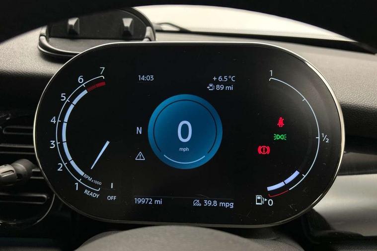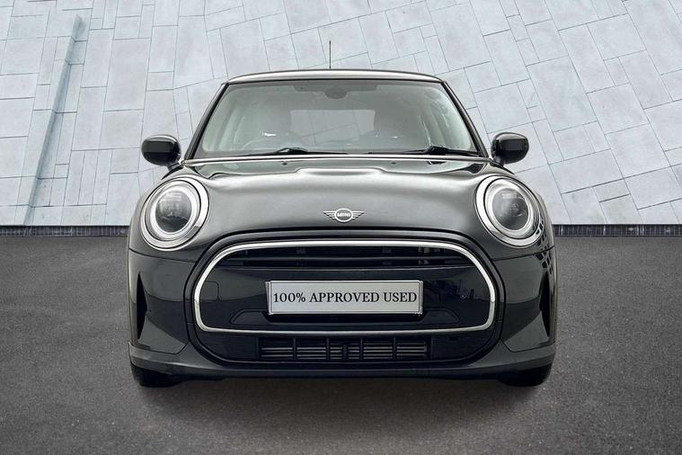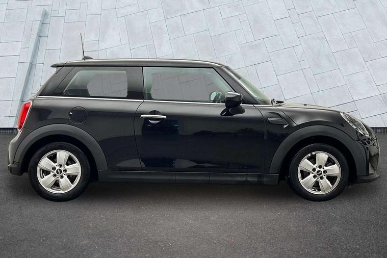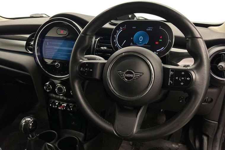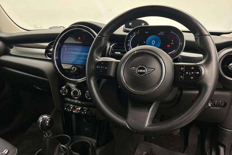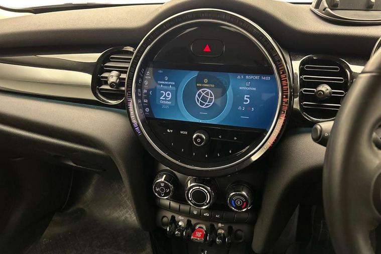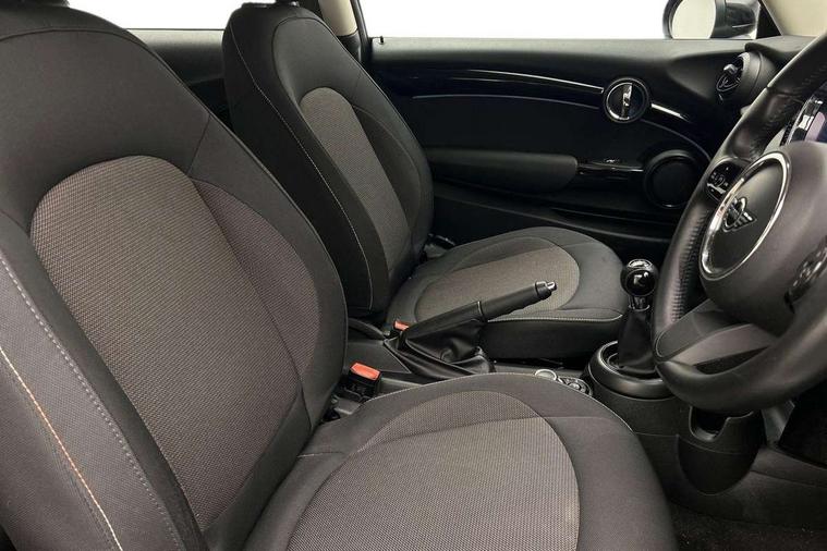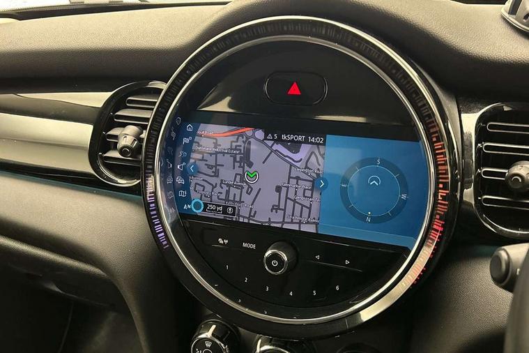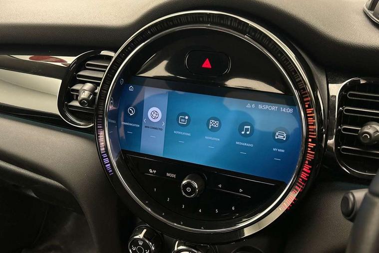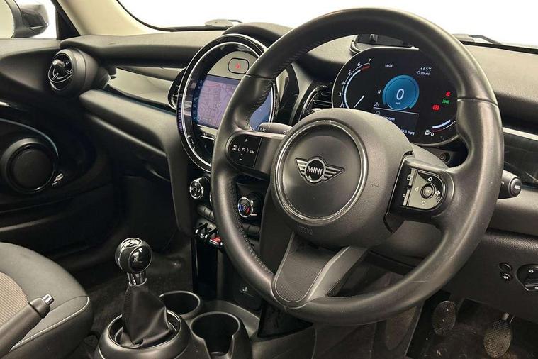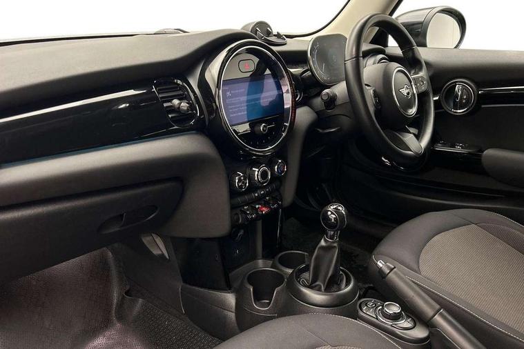 Automatic start/stop function with brake energy recuperation, Compatible mobile phone bluetooth with audio streaming, Cruise control with brake assist, Electro-mechanical speed dependant steering assistance, Flexible car sharing preparation, Instrument cluster, Mini E-call, MINI TeleServices, On board computer, Service interval indicator, 6 Speed manual transmission including gear change indicator display, Double Vanos system, Fully variable valve control, High precision injection, Performance Control, 4 speakers in front door trims and underneath front seats, 8.8" touchscreen with LED ring, FM tuner and DAB digital radio, Automatic headlight activation switch, Body colour fuel filler cap, Chrome border high gloss black slats radiator grille, Dynamic brake lights, Electric front windows, Exhaust tailpipe on left with chrome finisher, Heated rear window, Heated windscreen washer jets, LED headlight with closed ring and daytime driving lights, Metal door sill strips with MINI imprint, Model logo Cooper on right of tailgate, Rain sensor window wipers, Rear fog lights, Rear LED lights with union jack design, Rear window wiper, Side scuttle panel with integrated indicator, Sun/heat protection glass, White indicator lenses, 12V Accessory socket in centre console, 4 lashing eyes in luggage compartment, 60/40 split folding rear seat, Ambient lighting, Carbon black colour line - Knee roll and door armrest, Chrome interior highlights, Cupholders, Front and rear head restraints, Front and rear isofix with front passenger airbag deactivation, Glove compartment, Height and length steering column adjustment, Interior lighting with 12 different colours across the dashboard, underneath door bezel with illuminated laser-engraved design on central display, Leatherette gearshift lever and handbrake gaiters, LED reading lights, vanity mirror lights, front foot well light and spotlight on front seats, Manual air conditioning, Mechanical seat adjustment - forward/back & backrest for front seats and driver seat height adjust, Multifunction steering wheel, Passenger seat height adjuster, Satellite grey headlining including grab handles and clothes hooks, Sport leather steering wheel with speed limiter and audio/communication controls, Storage compartments in doors, Sunvisors with vanity mirrors, Velour floor mats, 3 point seatbelts on all four seats, 6 Airbags - front, side, head and seat belt tensioners, Anti-lock braking system (ABS), DSC - Dynamic Stability Control, Front and rear disc brakes, Single tone fanfare horn, Tyre pressure monitoring system, Alarm system with tilt sensor, monitoring doors, bonnet interior and tailgate, Electronic vehicle immobiliser, Start/stop toggle with keyless go, Piano black interior trim, Tool kit, Tyre repair kit,