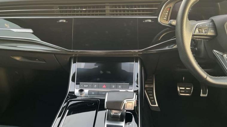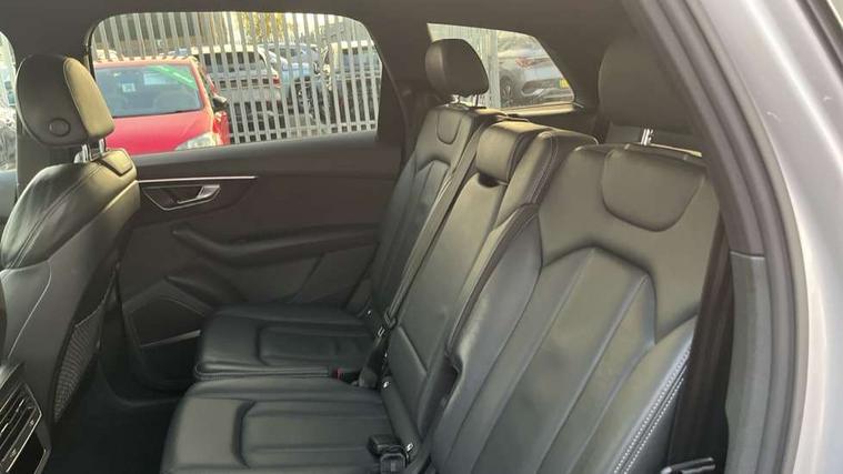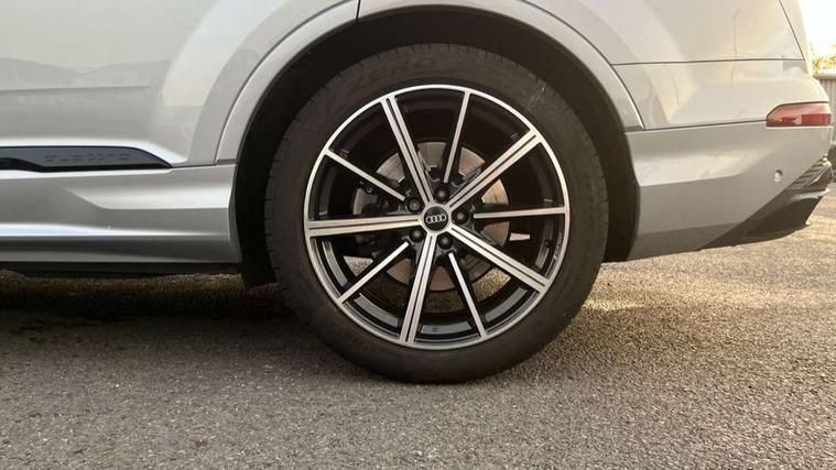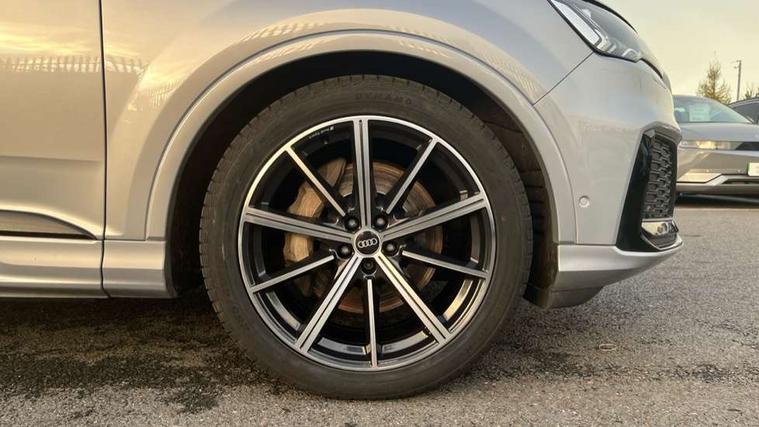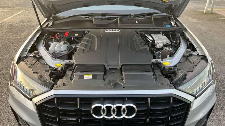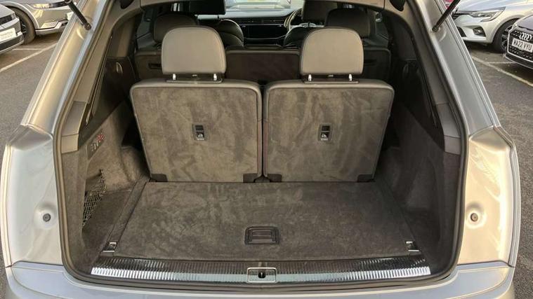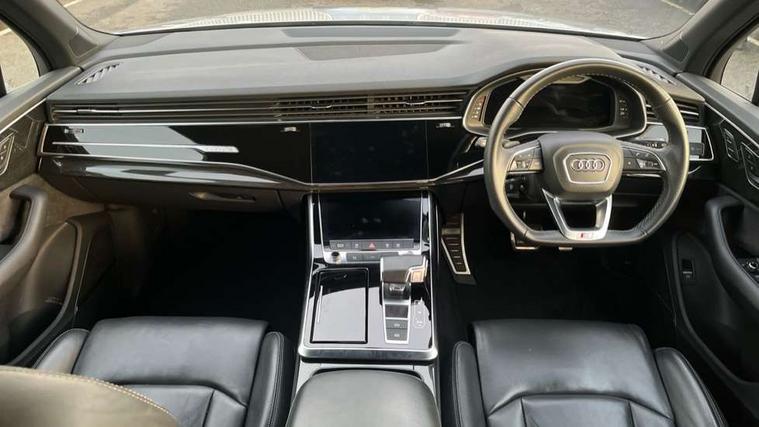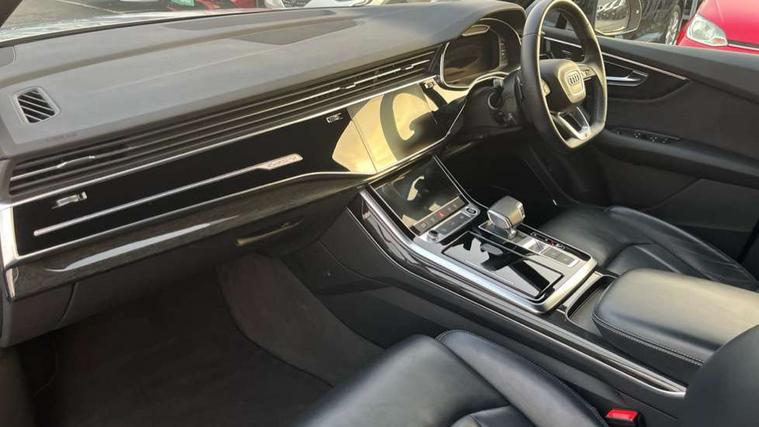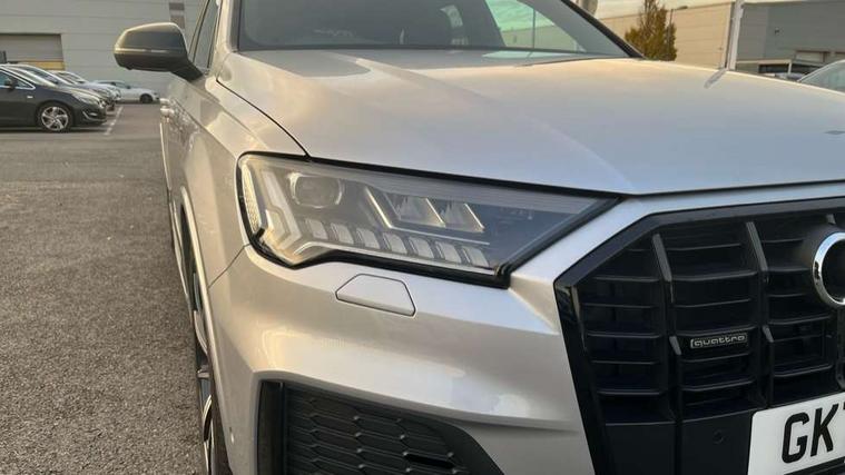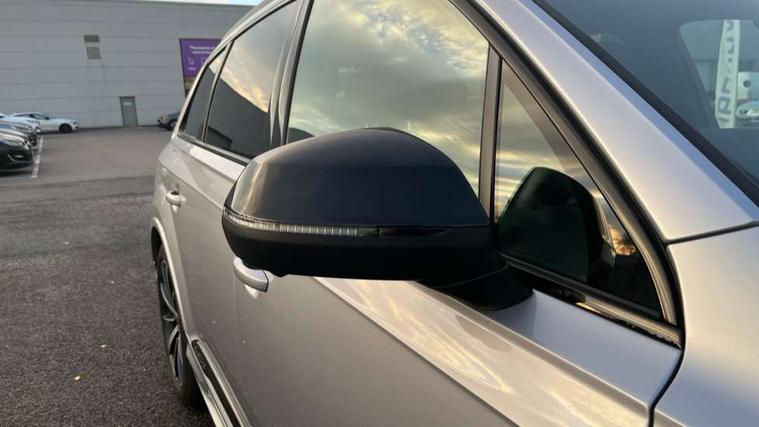 Audi connect safety and service (e-call), Audi connect with Amazon Alexa Integration, Audi drive select (Auto, Comfort, Dynamic, Efficiency, Individual, Off-road and All road), Bluetooth interface, Camera based traffic sign recognition, Electromechanical steering, MMI navigation plus with MMI touch screens includes 10.1" and 8.6" screens with haptic feedback, Natural voice recognition, Parking system plus with 360 degree display (front, rear and side sensors) - acoustic and visual park assist system, Power operated tailgate, Rear view camera, Smartphone interface includes wireless Apple carplay/Android Auto, Start/stop system, 48V Mild hybrid technology, Adaptive air sports suspension, Quattro all wheel drive with self locking centre differential, Audi music interface - front 2 USB-C ports with charger and data functions, Audi sound system with 6 channel amplifier, 180 watt amplifying capacity and 10 loudspeakers including subwoofer, DAB digital radio module, Audi matrix LED headlights with dynamic front and rear indicators, Auto dimming frameless rear view mirror, Black roof rails, Bumpers in contrast paint scandium grey finish includes door trim and wheel arch trim strips, inlays in door strip contain quattro embossing, Electrically adj heated/folding + automatically dimming exterior mirrors with memory + automatic kerb side function for passenger side exterior mirror, Heat insulating glass in windshield, Integrated LED indications in door mirrors, LED daytime running lights, LED rear tail lights, Privacy glass - dark tinted rear and rear side windows from B-pillar backwards, 4 zone deluxe automatic climate control, 7 seat layout with ISOFIX points for the front passenger seat and rear passenger seat, Black cloth headlining, Comfort front centre armrest, Electric adjustable front seat with 4 way lumbar support, driver memory functionality, Folding rear seats, Front head restraints, Front/rear floor mats, Heated front seats, Illuminated door sill trims with S logo, LED interior ambient lighting, Luggage compartment cover, Luggage compartment sill protection in stainless steel, Rear head restraints, Stainless steel pedals, Sunvisors with illuminated vanity mirrors, Titanium black styling pack - Q7/SQ7, 3 point seatbelts on all rear seats, Audi pre sense front, Driver and front passenger, front side and curtain airbags, Electromechanical parking brake, Electronic Stabilisation Control (ESC) including ABS, ASR and EDL, Extended pedestrian protection measures, Hill hold assist, Seatbelt monitoring, Tyre pressure loss indicator, Warning triangle and first aid kit, Anti theft alarm, Anti-theft wheel bolts and wheel loosening detection, Keyless Go, Remote central locking, Polished oak trim with grey finish inlay, Tool kit, Tyre repair kit,