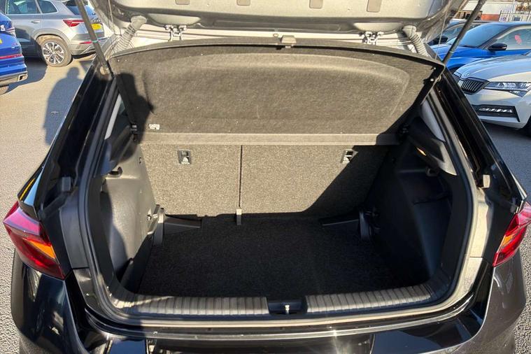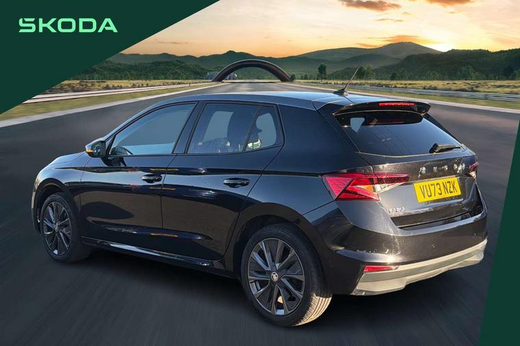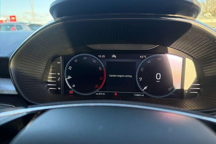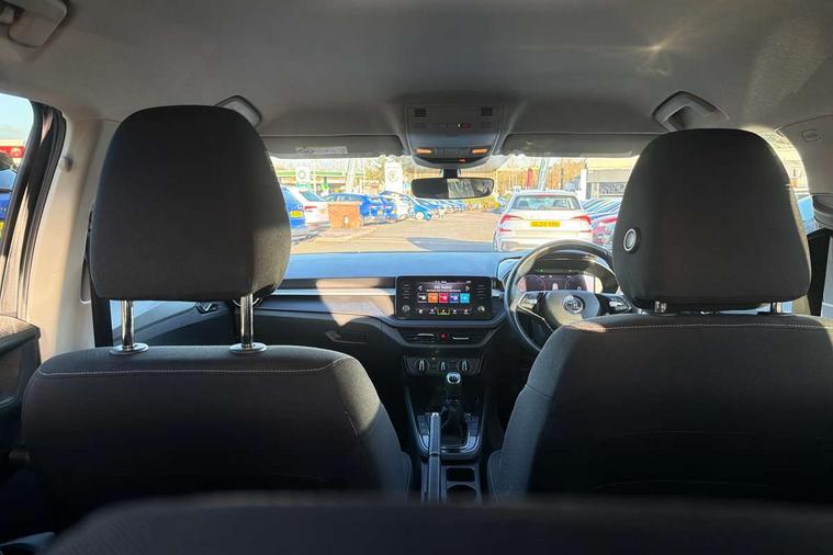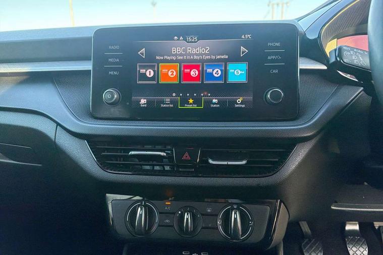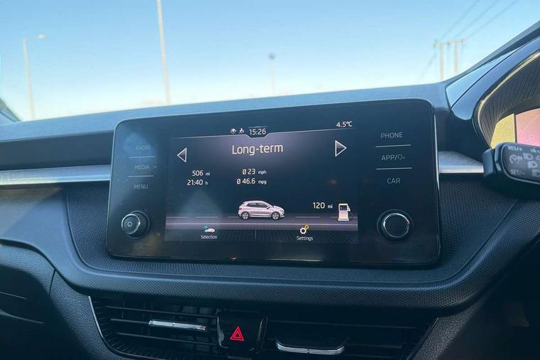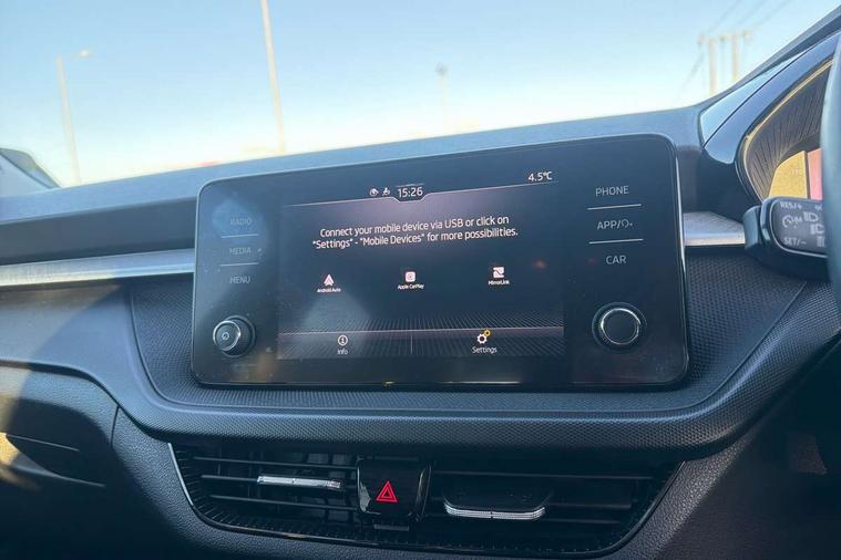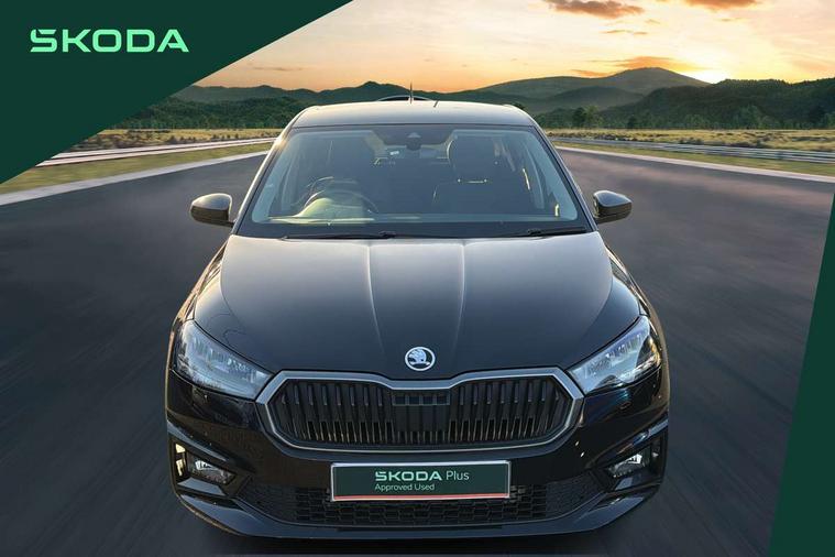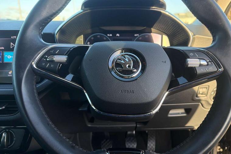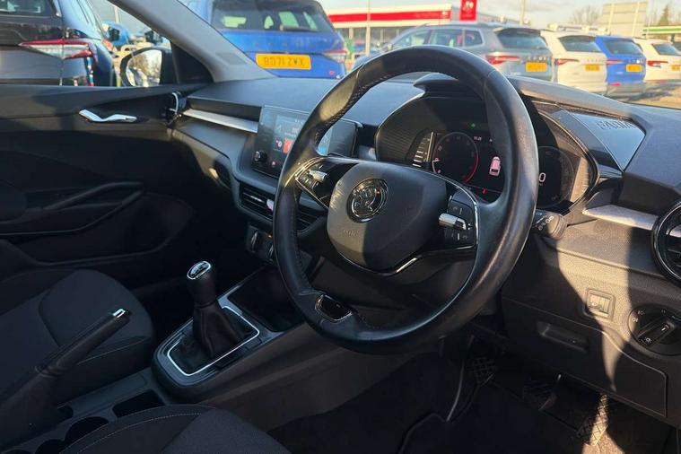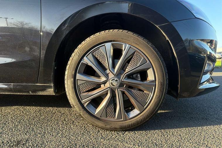 Bluetooth connection, Driver alert system - DAS, Electromechanical power steering, Exterior temperature gauge, Lane assist including road edge detection, Service interval indicator, Virtual cockpit with 10.25" colour display, 2x USB-C in the front (for data transmission and charging), 6 Speakers (4 in front and 2 in rear), Auxiliary socket for external MP3 player, Bolero radio with 8" colour display, DAB digital radio reception, Basic rear lights, Body coloured bumpers, Dimming rear view mirror with black frame, Door mirror integrated indicators, Electrically adjustable and heated door mirrors, Electrically adjustable front windows with function auto up/down, Front window wiper intermittent control, Headlight range control - Automatic, Ice scraper in fuel cap, LED daytime running lights with coming and leaving home feature, Mechanical adjustable rear windows, Privacy glass, Rear LED fog light, Rear side wing doors, Rear window wiper with washing nozzles, Roof colour door mirrors, Roof mounted spoiler, SKODA tailgate lettering in chrome, Third brake light, 3 rear headrests, Backrest split and folding, Central console with fixed cup holder and storage box, Chrome handbrake release button, Fabric upholstery, Gearshift knob/handle in leather, Grain satin black interior door handles, Hand brake lever handle in leather, Height adjustable front headrests, Height adjustable steering wheel, ISOFIX and TopTether anchorage points to the outer rear seats, ISOFIX and TopTether on the front passenger seat, Luggage compartment lighting, Pollen filter, Rear seat bench unsplit, Single front passenger seat, Storm grey headlining, Sun visors with mirror and airbag label on passenger side, Ticket holder, Umbrella in drivers door, 3-point height adjustable front seats belts with pretensioner and force limiter, Automatic warning lights in case of crash, Driver and passengers airbag with switch off function, e-Call+, ESC including ABS, MSR, ASR, EDS, HBA and XDS, Front and rear seat belt warning, FRONT ASSIST (AEB City and AEB Inter Urban), Front side airbags, Head airbags, One tone horn, Pedestrian protection, Three rear 3-points safety seat belts with pretensioner and force limiter including stop function for outer rear seat belts, Tyre pressure monitoring system, Anti-theft alarm system including immobiliser, interior monitoring, backup horn, and towing protection, Anodized cross line upper decorative trim, Colour Edition air vents, Grain satin black central console cover, Grain satin black lower decorative trim, Satin black door and side trim panel in front, Anti-theft wheel bolts protection, Super-low rolling resistance tyres,
