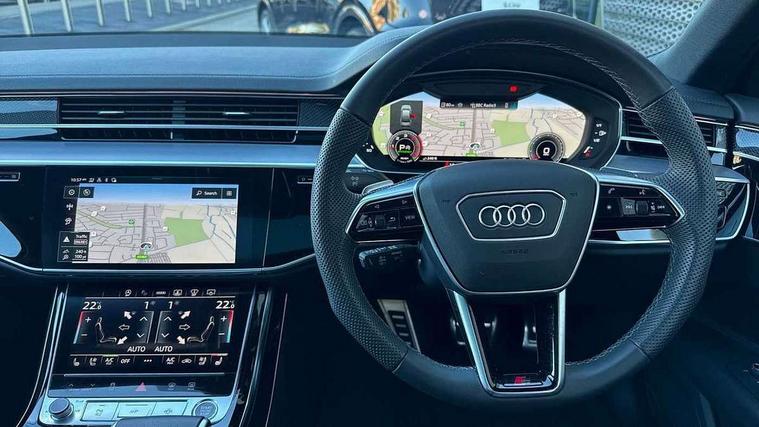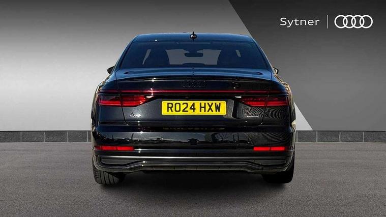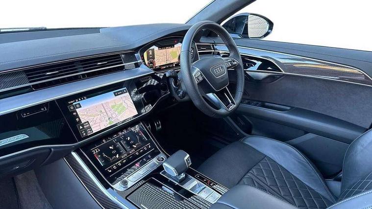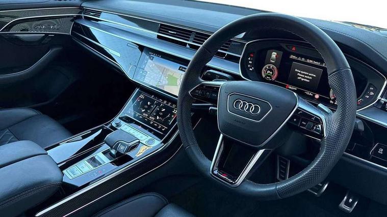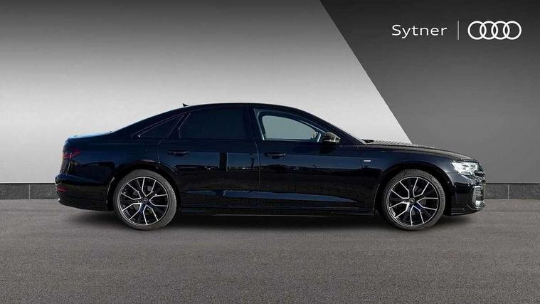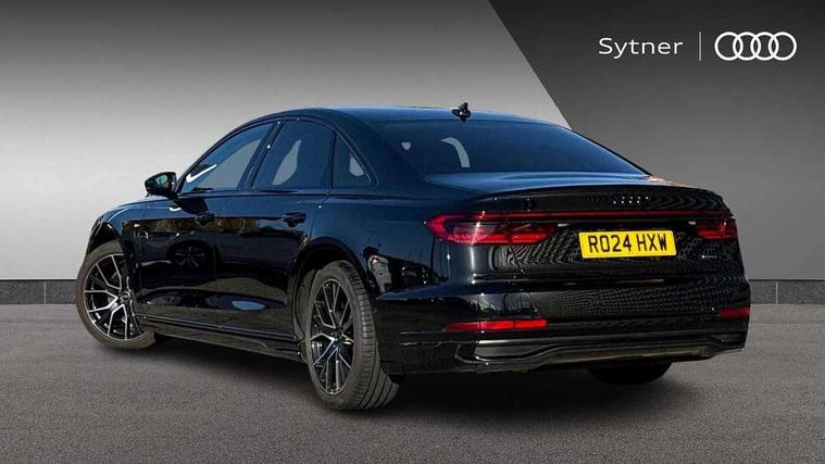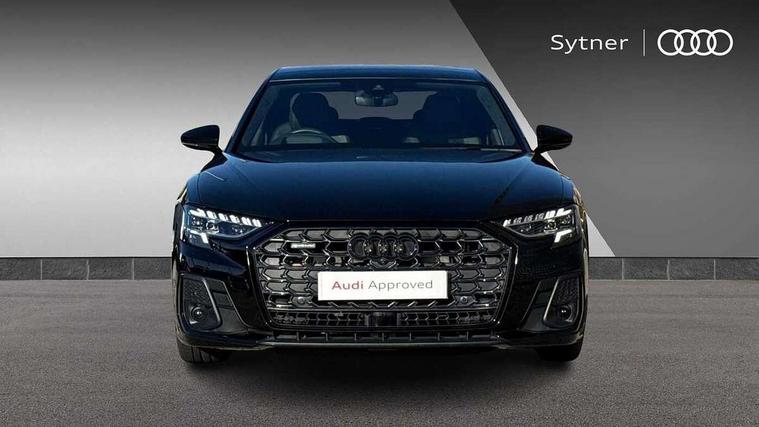 'Lights On' Reminder warning buzzer, Adaptive cruise control with cruise assist, emergency assist, efficiency assist, swerve assist, turn assist and speed limiter, Audi connect safety and service (e-call), Audi drive select, Audi parking system plus with front and rear sensors, Audi smartphone interface with app store includes wireless Apple carplay, Android auto and Amazon alexa integration, Audi virtual cockpit, Bluetooth interface, Camera based traffic sign recognition, Convenience key, Electro - mechanical power assisted steering, Head up Display, MMI navigation plus with MMI touch + Twin touch screens with haptic feedback, Operating buttons in black, glass look with haptic feedback including extended aluminium look, Power door closure, Power operated tailgate, Rear view camera, Remote fuel filler release, Service interval indicator, 24 litre AdBlue tank, 48V Mild hybrid technology, 8 speed transmission with hill hold assist, 82 litre fuel tank, Adaptive air suspension, Diesel particulate filter, Quattro all wheel drive with self locking centre differential, Audi music interface, Audi sound system, DAB digital radio module, DVD System, MMI radio plus, USB connection, Acoustic double glazing, All-weather, manoeuvring, position, static cornering, turning and motorway lights with automatic dynamic headlight range control, Audi space frame, Auto dimming rear view mirror, Body colour bumpers, Body colour side protection with aluminium trim strips, Electric front windows, Electric rear windows with isolation switch, Electric sunblinds for rear window and rear door windows, Electrically adjustable heated folding + automatically dimming exterior mirrors with memory function and integrated LED indicators, Front wash/wipe with interval delay, HD matrix LED headlights with dynamic light presentation and dynamic indicators, Headlight cleaning system, Heat insulating darkened glass in side and rear windows, Heat insulating glass windscreen, Heated rear window, Heated windscreen washer jets, High beam assist, LED brake lights, LED daytime running lights, LED third brake light, OLED rear lights with changeable rear light signature, Privacy glass, Rear boot, Rear side wing doors, Side skirts, Welcome/leaving lighting, 12V socket, 2 zone automatic air conditioning, 3 seat rear bench with centre armrest in 2nd row, 4 way electric lumbar support for driver and front passenger, Audi phone box light, Black cloth headlining, Centre console with cupholders, Comfort centre armrest, Door pockets with bottle holder, Driver and front passenger side sunvisors with illuminated vanity mirrors, Dust/pollen filters, Electric front seats with memory function, Front floor mats, Glove compartment cooling, Heated front seats, Height/reach electric steering column with easy exit function, Illuminated door sill trims with aluminium inlays and S diamond emblem, Isofix child seat mounting points on outer rear seats, Leather gearknob, Passenger footwell storage net, Reading lights, Rear floor mats, Rear headrests, Roof mounted sunglasses holder, Single front passenger seat, Stainless steel pedals and footrest, Valcona leather upholstery with front sports seats in diamond quilted with S embossed logo, Black exterior styling pack - A8 Black Edition, Chrome exterior pack - A8, Extended LED Interior multi coloured light pack - A8, 3 point seatbelts on all rear seats, ABS/EBD, Active front headrest system, ASR traction control, Audi pre sense basic, Audi pre sense front, Black brake calipers, Driver/Front Passenger airbags, EDL traction control, Electromechanical parking brake, ESP, Extended pedestrian protection measures, Front and rear disc brakes, Front and rear side airbags with head airbag system, Front passenger airbag deactivation, Rear child proof door locks, Seatbelt reminder + electric contact in buckle + advanced safety equipment, Tyre pressure loss indicator, Warning triangle and first aid kit, Anti theft alarm tow away protection, Anti-theft wheel bolts and wheel loosening detection, Remote central locking, Carbon vector upper inlays, Dark matt brushed aluminium lower inlays,