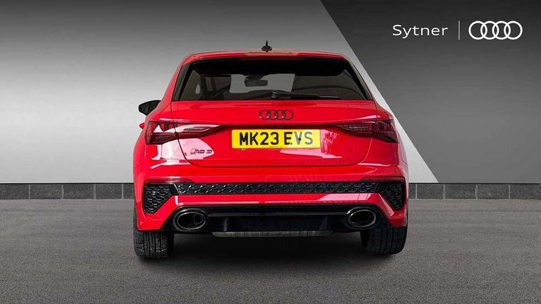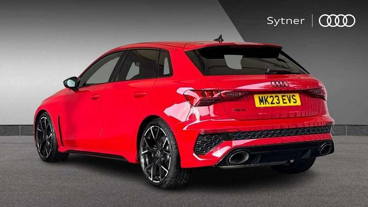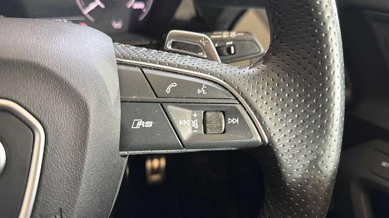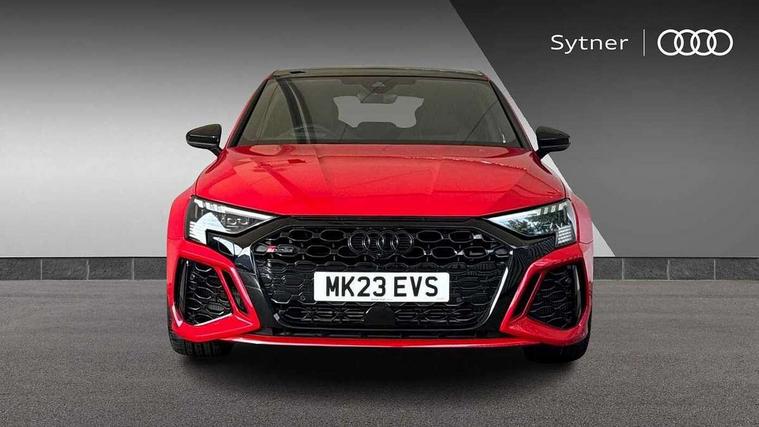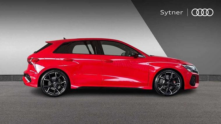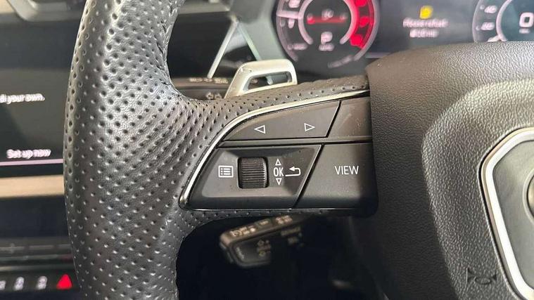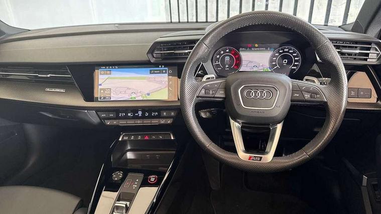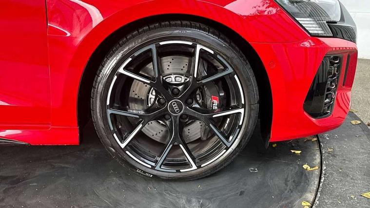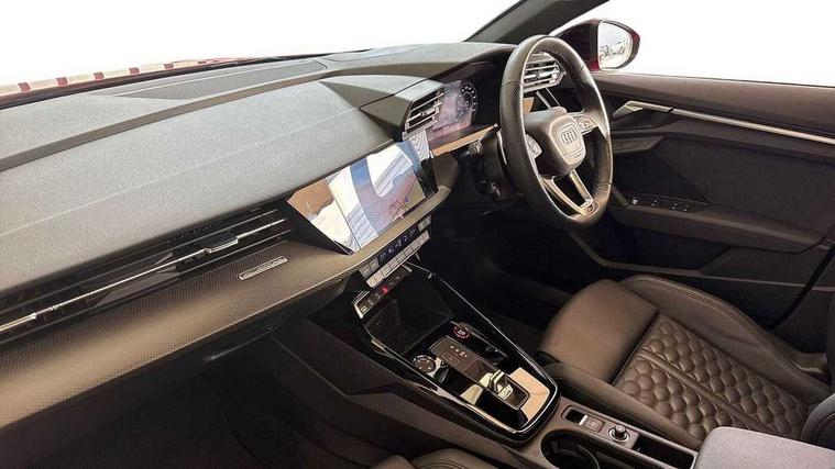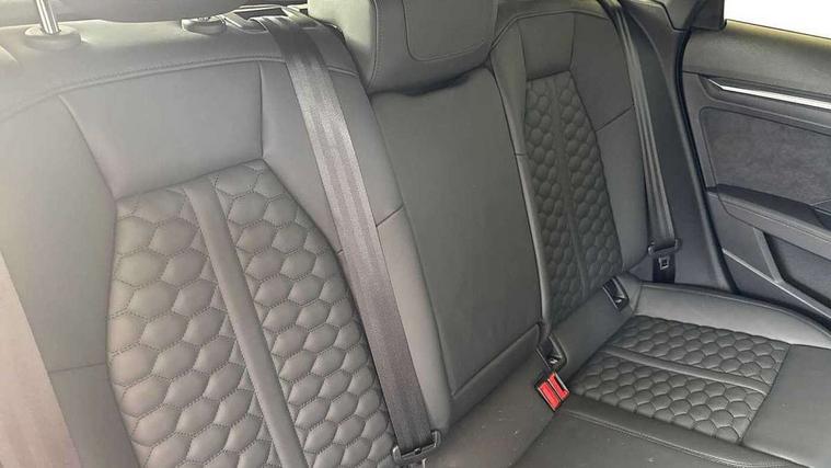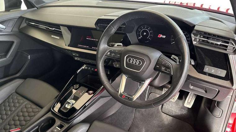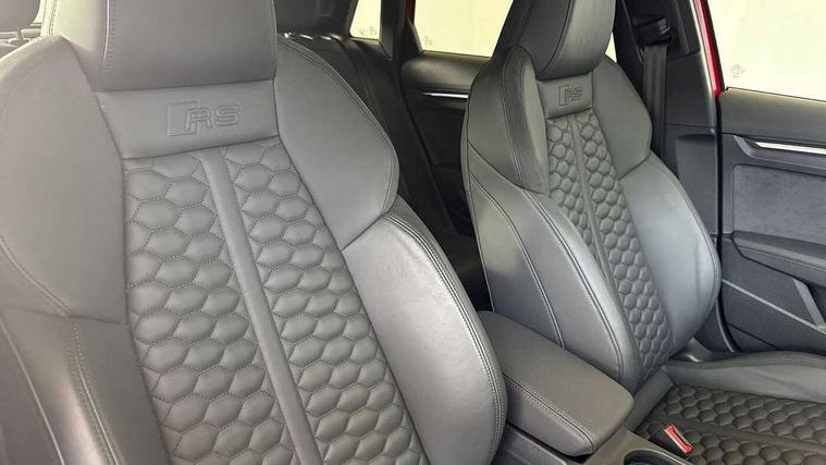 Adaptive cruise assist, Adaptive cruise control, Audi smartphone interface, Audi virtual cockpit with RS specific display 12.3" full colour digital instrument cluster, Automatic start/stop system with recuperation, Bluetooth interface, Camera based traffic sign recognition, Collision avoidance assistant, Emergency e-call, Head up Display, Lane departure warning system, Legal emergency call, Parking assist with parking system plus, Power operated tailgate - Luggage compartment lid opens electrically, Progressive power assisted steering, Reversing camera, Quattro permanent four wheel drive, Rear suspension, DAB Digital radio, 3rd brake light, Acoustic glass windscreen, Audi beam uses LEDs to project the Audi sport logo onto the ground as you exit your RS 3, Audi matrix LED headlights, LED rear lights, dynamic front and rear indicators and headlight cleaning system, Auto dimming rear view mirror, Black side skirts, Body colour roof, Carbon exterior door mirror, Carbon fibre engine cover, Daytime running lights, Electric adj heated/folding + auto dimming exterior mirrors with memory + LED indicator + auto kerb side function for passenger side exterior mirror, Front spoiler in high gloss black, Heat insulating glass windscreen, Light and rain sensors, Panoramic glass sunroof, Privacy glass - dark tinted rear and rear side windows from B-pillar backwards, Rear side wing doors, Rear window wiper and washer system, RS exterior features in gloss black, RS sports exhaust system, 3 seat bench in 2nd row, 3 spoke leather multifunction steering wheel with gear shift paddles, 4 way lumbar support for front seats, 40/20/40 split folding rear seat bench, Black cloth headlining, Dual zone electronic climate control, Electrically adjustable front seats with memory function for driver's side, Front and rear headrests, Front centre armrest, Front sports seats RS embossed logo, Front/rear floor mats, Heated front seats, Honeycomb stitching and RS embossing, Illuminated door sill trims inlays in aluminium with RS 3 logo, Illuminated vanity mirror, RS emblems, Single front passenger seat, Stainless steel pedals and front footrest in black, Aluminium interior elements pack - RS3, Ambient lighting pack - RS3, Comfort and sound pack - RS3, Driver assistance pack with 3 spoke leather multi function steering wheel - RS3, MMI navigation plus with MMI touch - RS3, RS bodystyling - RS3, Storage Pack - RS3, 3x3 point rear seat belts, ABS/EBD, ASR, Audi pre sense front, Driver/Front Passenger airbags, EDL, ESC - Electronic Stability Control + traction control, Front passenger airbag deactivation, Front side airbags with head airbags and interaction airbag, Hill hold assist, Seat belt reminder with passenger presence detection in rear, Tyre pressure loss indicator, Warning triangle and first aid kit, Anti theft alarm, Anti-theft wheel bolts, Electronically operated child lock, Remote control central locking, Full decorative carbon trim, 19" 5 Y spoke black with graphic print alloy wheels, Tool kit, Tyre repair kit,