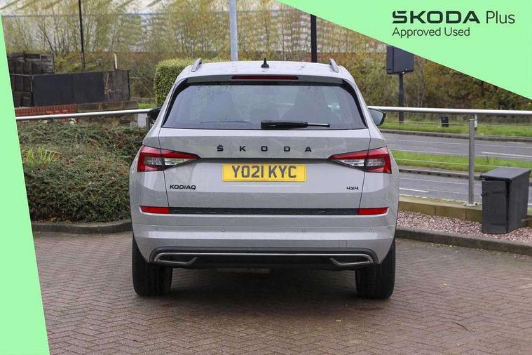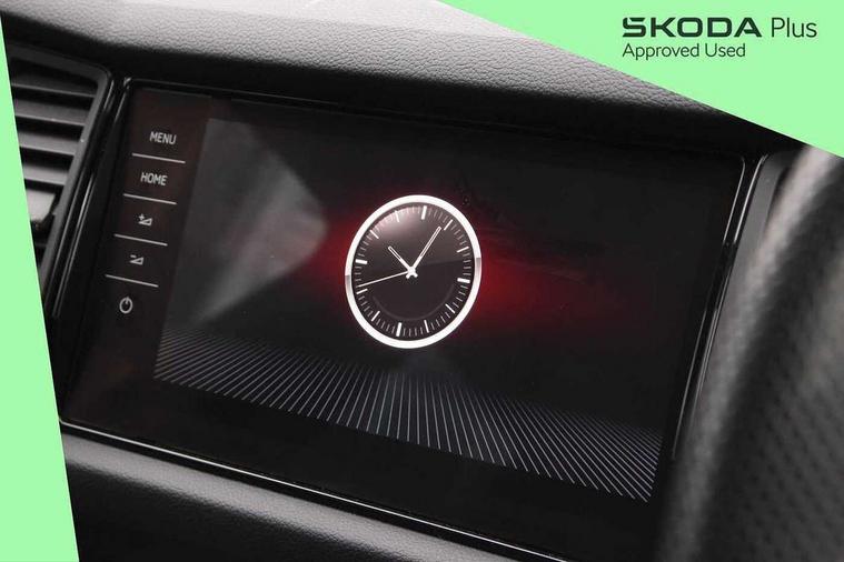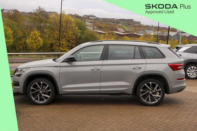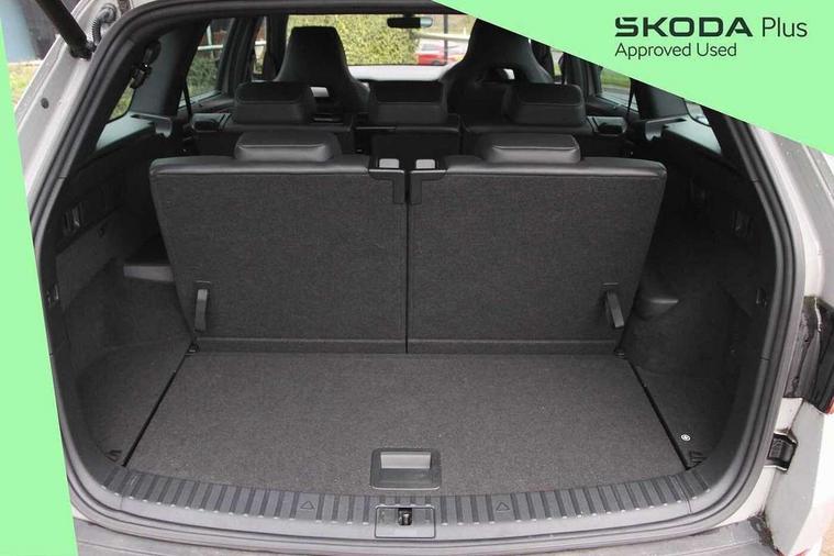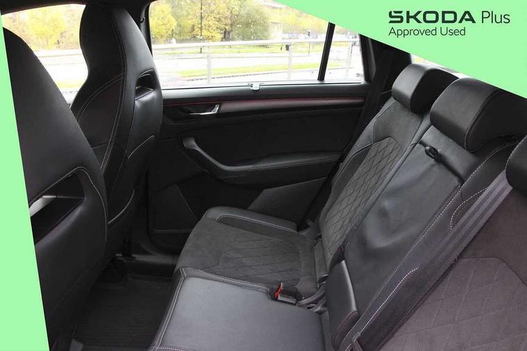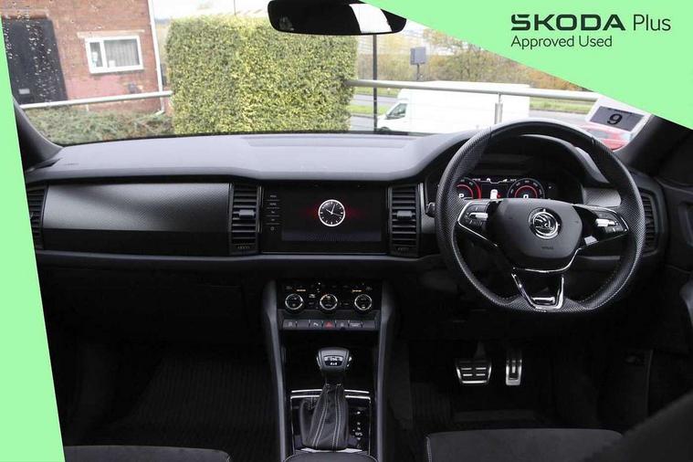 Bluetooth system, Columbus satellite navigation with 9.2" touch screen and integrated Wi-Fi + WLAN and web radio, Digital voice enhancement, ECO Stop/start function, Exterior temperature indicator, Map care, Progressive steering, Smartlink wireless for apple carplay and wired for android auto, Speed limiter, Sports dials, Tailgate unlocking from outside, USB C Port x 2 in front centre console, DAB Digital radio, Aero front windscreen wipers with intermittent function, Aero rear window wiper, Auto dimming rear view mirror, Automatic activation of hazard warning lights, Black electric window control buttons, Black roof rails and door mirrors with radiator grille and window surrounds, Black wheel arch surrounds, Body colour bumpers, Body colour door handles, Chrome exhaust tailpipe, Electric front and rear windows, Electrically adjustable/heated/foldable and auto dimming door mirrors with memory function, Front door steps with SportLine logo, Full LED Headlights with adaptive front light system and LED daytime running lights, Headlight washers, Heated rear window, LED front fog lights with static cornering light function, LED rear fog light, LED third brake light in rear spoiler, Light assistant (coming home/tunnel light), Rain and light sensors, Rear diffuser, Rear spoiler, Safety reflectors on front and rear doors, Sportline badge on front fender, Sports front and rear bumpers, Sunset privacy glass, Tailgate lettering in Black, Without engine designation, 12V socket in boot, 2 rails with 2 hooks including 4 hooks for net programme, 4 foldable roof handles with rear coat hooks, 4 lashing points on luggage floor, 60:40 foldable rear seat with sliding adjustment and backrest angle adjustment, Alcantara door panels, Aluminium pedals, Black roof headlining, Bottle holders in door panel in the 1.5 litre front and 1 litre rear, Cargo storage compartments, Centre console with open storage box, cup holder and 12V socket, Chrome headlight control button, Chrome interior door handles, Coat hooks on B pillar, Covered storage compartment on driver side, Front and rear door armrest with black adductor trim, Front and rear height adjustable headrests, Front centre armrest with storage compartment, cup holder and 12V socket, Front courtesy lights, Gear shift lever with chrome frame and black gloss insert, Illuminated and cooled glovebox, Illuminated luggage compartment, Isofix child seat fittings in outer rear seats with top tether, Manually adjustable steering column, Microsuede/leather upholstery with front sports seats, Net programme in boot (1x horizontal Net, 2x vertical Nets), Overhead glasses storage compartment, Paddles on steering wheel for DSG gearbox, Pollen filter, Rear centre armrest with cupholders, Roll up luggage compartment cover with intermediate position, Small Bags on the inner sides of the front backrests, Storage compartment in lower middle instrument panel with closing, Three rear height adjustable headrests, Ticket holder on A Pillar, Umbrella in door panel, LED Interior Light pack - Kodiaq Scout/Sport Line/VRS/Laurin + Klement, Auto door release and activation of warning lights in the event of an accident, Driver and passenger airbags, Electronic parking brake with hill hold control, Emergency rear braking signal, ESC (incl. ABS+MSR+ASR+EDS+HBA+DSR+RBS+MKB), Front and rear three point safety belt on all seats, Front assist includes AEB city/urban, Front passenger airbag deactivation switch, Front side airbags, Fuel cut off safety device, Head and knee airbags, Rear disc brakes, Safety vest holder in door, Seat belt reminder for all seats, Two tone horn, Tyre pressure monitor, Warning lights in front doors, Alarm with interior monitoring and tilt sensor with safe function, Immobiliser, Keyless entry and start system (KESSY), Remote central locking, Black air vent surround, Carbon finish dashboard and door inserts, 20" Vega Anthracite alloy wheels with anti-theft wheel bolts,