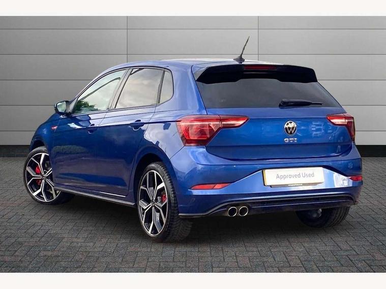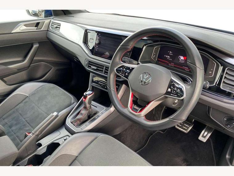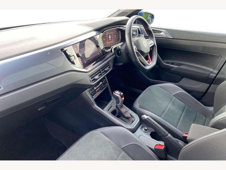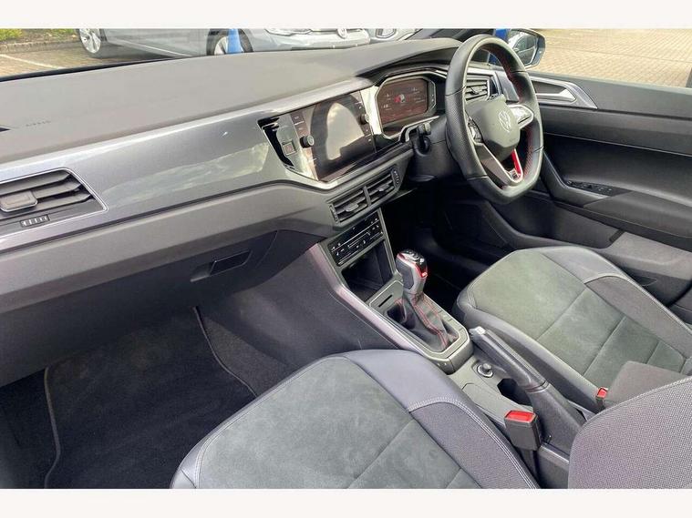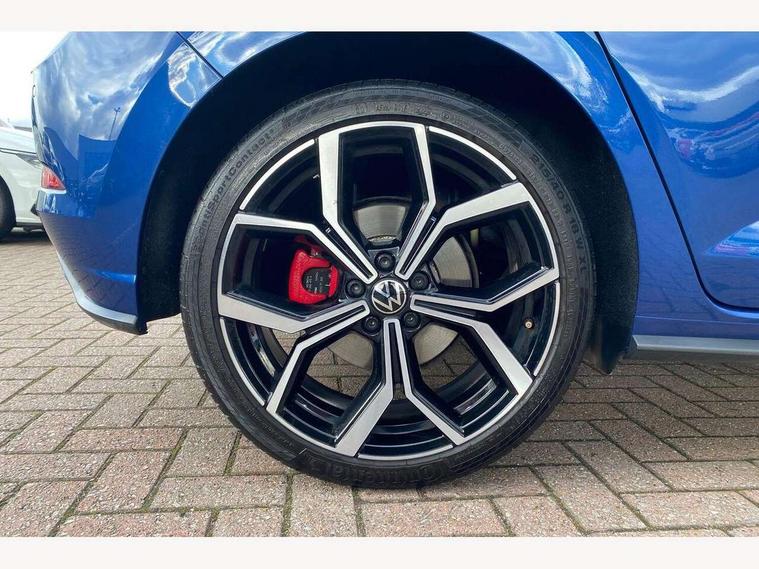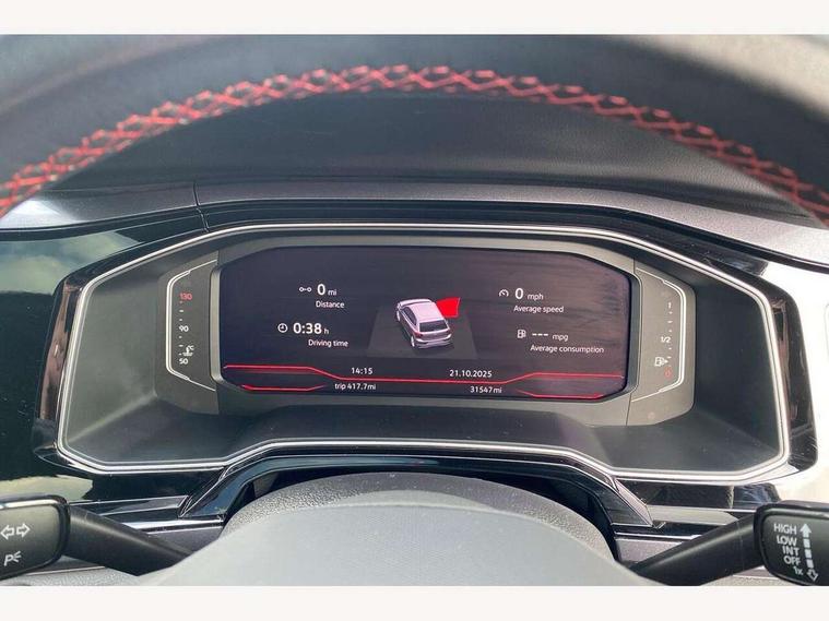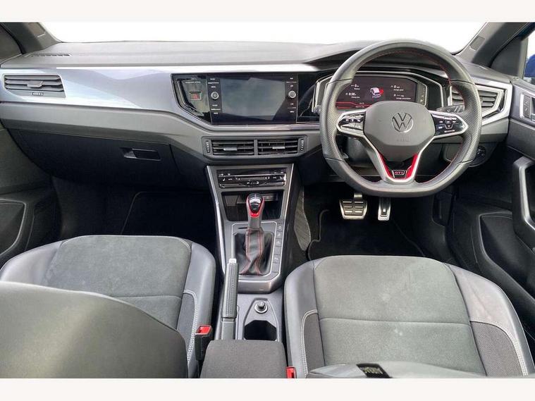 Adaptive cruise control with follow-to-stop and speed limiter, Bluetooth mobile phone interface, Digital Cockpit Pro with 10.25" Display, Driver alert system, Dynamic road sign display, Eco mode, Emergency call service, Power assisted speed sensitive steering, Preparation for We connect and We connect plus, Speedo and rev counter, electronic odometer, trip, service interval display and fuel gauge, Travel Assist - Lane keeping system and traffic jam assist, Travel assist including emergency assist, Trip computer, Warning signal and warning light for front and rear seatbelts not fastened, Washer fluid level indicator, Wireless app connect, Adaptive chassis control, Front wheel drive, Heavy duty rear axle, Rear shock absorpion sports version, Sports select suspension lowered by 15mm, Start-stop system with battery regeneration (recuperation - energy recovery during braking), DAB Digital radio, Diversity antenna for FM reception, Front and rear 6 speakers, Body colour bumpers, Body colour door handles, Chrome plated radiator grille inserts, air vent surrounds and light switch surrounds, Electric front windows, Front scuff plates in aluminium with GTI logo, Heat insulating glass in side and rear windows, Heat insulating glass windscreen, Power folding adjustable/heated exterior mirrors and front passenger exterior mirror lowering function, Rear electric windows, Rear fog light, Rear side wing doors, Rear windscreen washer and wiper with interval delay, Sport bumpers with air intakes with honeycomb structure, Third brake light, Twin chrome exhaust tailpipes, 12V power socket in centre console, 2 USB-C ports in the front, 2 USB-C charging sockets on the center console in the rear, 3 rear head restraints, 60/40 split folding rear seat and rear seat bench not split, Air care climatronic air conditoning system with active combination filter and 2-zone temperature control, Black roof lining, Door and side trim panel, Driver and front passenger seat height adjustment, Driver/passenger sunvisors with illuminated vanity mirrors, Front + rear carpet mats in recycled material, Front centre armrest, Front footwell illumination, Front seat backrest storage pockets, GTI sports gearshift knob in aluminium leather, Handbrake lever handle in leather, Headliner in recycled material, Isofix child seat preparation easy-fit (for two outer rear seats, and front passenger seat) compatible with I-size, LED interior light with switch off delay and dimmer, 2 reading lights front and rear, Luggage compartment cover, Luggage compartment floor, Luggage compartment lighting, Single front passenger seat, Stainless steel pedals, Standard pedal cluster, Three spoke leather wrapped multifunction sports steering wheel with shifting paddles, IQ LED matrix headlights pack - Polo, Light and sight pack - Polo GTI, Sports suspension pack - Polo, 3 point height adj front seatbelts + pretensioners, 3x3 point rear seatbelts, ABS, Driver and front passenger airbag with front passenger airbag deactivation, Drivers and front passengers safety optimised head restraints, ESC (Electronic stability control) + EDL (Electronic Differntial lock) and ASR (Traction control), Extended and predictive pedestrian/ cyclist protection, Front and rear disc brakes with red brake calipers, Front curtain and side airbags with center airbag, Hill hold control, Manual child lock in rear doors, Two tone horn, Tyre pressure loss indicator, Alarm with interior protection, Anti-theft alarm system with interior monitoring, backup horn, and towing protection, Anti-theft wheel bolts, Electronic engine immobiliser, Chrome applications on rotary light, mirror adjustment, window regulator switches, outlet with frame in black, Low rolling resistance tyres,
