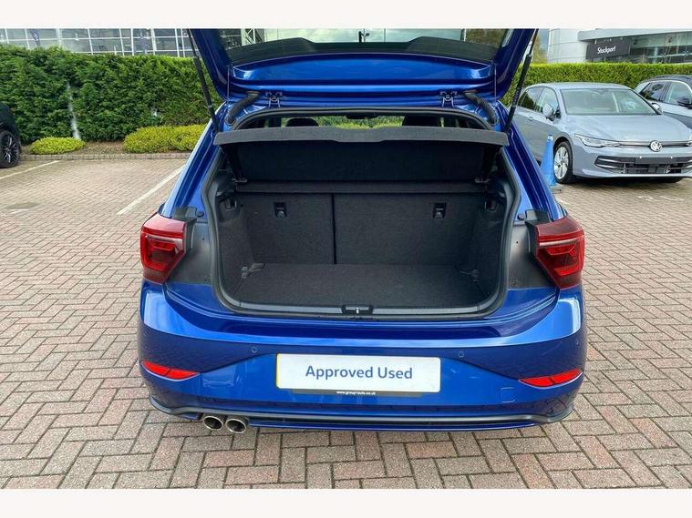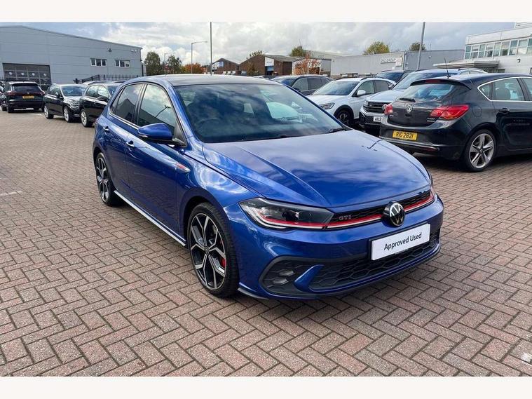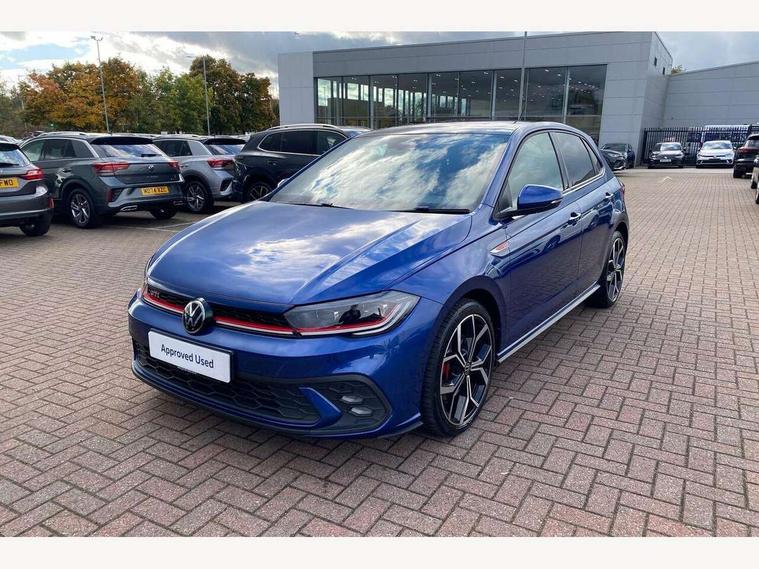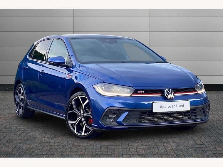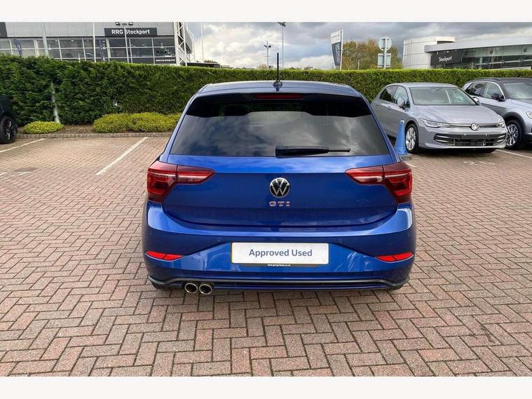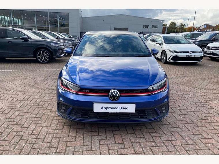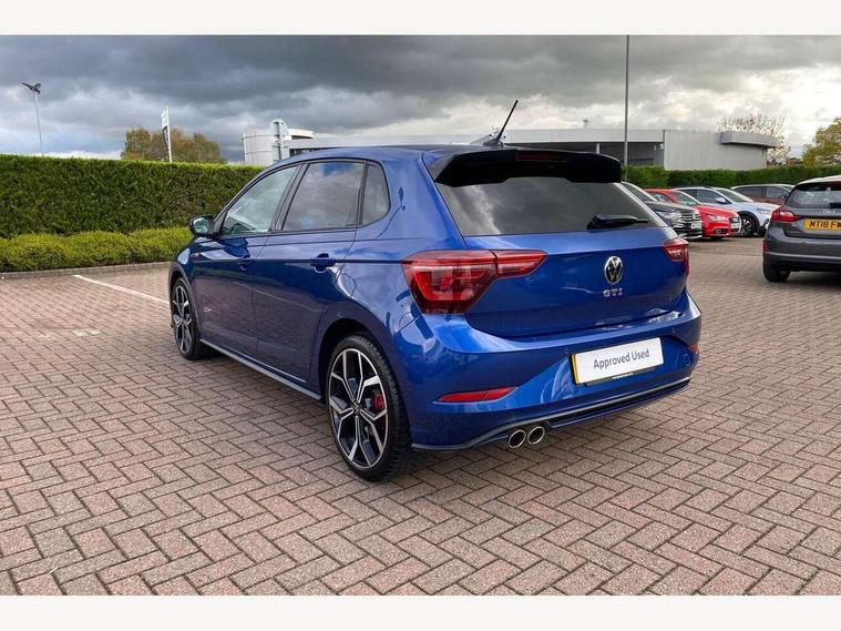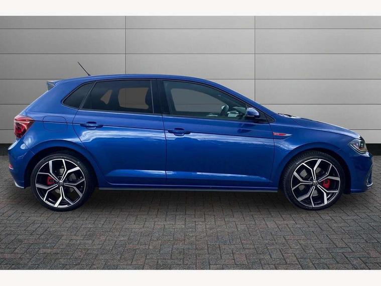 Adaptive cruise control with follow-to-stop and speed limiter, Bluetooth mobile phone interface, Digital Cockpit Pro with 10.25" Display, Driver alert system, Dynamic road sign display, Eco mode, Emergency call service, Power assisted speed sensitive steering, Preparation for We connect and We connect plus, Speedo and rev counter, electronic odometer, trip, service interval display and fuel gauge, Travel Assist - Lane keeping system and traffic jam assist, Travel assist including emergency assist, Trip computer, Warning signal and warning light for front and rear seatbelts not fastened, Washer fluid level indicator, Wireless app connect, Adaptive chassis control, Front wheel drive, Heavy duty rear axle, Rear shock absorpion sports version, Sports select suspension lowered by 15mm, Start-stop system with battery regeneration (recuperation - energy recovery during braking), DAB Digital radio, Diversity antenna for FM reception, Front and rear 6 speakers, Body colour bumpers, Body colour door handles, Chrome plated radiator grille inserts, air vent surrounds and light switch surrounds, Electric front windows, Front scuff plates in aluminium with GTI logo, Heat insulating glass in side and rear windows, Heat insulating glass windscreen, Power folding adjustable/heated exterior mirrors and front passenger exterior mirror lowering function, Rear electric windows, Rear fog light, Rear side wing doors, Rear windscreen washer and wiper with interval delay, Sport bumpers with air intakes with honeycomb structure, Third brake light, Twin chrome exhaust tailpipes, 12V power socket in centre console, 2 USB-C ports in the front, 2 USB-C charging sockets on the center console in the rear, 3 rear head restraints, 60/40 split folding rear seat and rear seat bench not split, Air care climatronic air conditoning system with active combination filter and 2-zone temperature control, Black roof lining, Door and side trim panel, Driver and front passenger seat height adjustment, Driver/passenger sunvisors with illuminated vanity mirrors, Front + rear carpet mats in recycled material, Front centre armrest, Front footwell illumination, Front seat backrest storage pockets, GTI sports gearshift knob in aluminium leather, Handbrake lever handle in leather, Headliner in recycled material, Isofix child seat preparation easy-fit (for two outer rear seats, and front passenger seat) compatible with I-size, LED interior light with switch off delay and dimmer, 2 reading lights front and rear, Luggage compartment cover, Luggage compartment floor, Luggage compartment lighting, Single front passenger seat, Stainless steel pedals, Standard pedal cluster, Three spoke leather wrapped multifunction sports steering wheel with shifting paddles, IQ LED matrix headlights pack - Polo, Light and sight pack - Polo GTI, Sports suspension pack - Polo, 3 point height adj front seatbelts + pretensioners, 3x3 point rear seatbelts, ABS, Driver and front passenger airbag with front passenger airbag deactivation, Drivers and front passengers safety optimised head restraints, ESC (Electronic stability control) + EDL (Electronic Differntial lock) and ASR (Traction control), Extended and predictive pedestrian/ cyclist protection, Front and rear disc brakes with red brake calipers, Front curtain and side airbags with center airbag, Hill hold control, Manual child lock in rear doors, Two tone horn, Tyre pressure loss indicator, Alarm with interior protection, Anti-theft alarm system with interior monitoring, backup horn, and towing protection, Anti-theft wheel bolts, Electronic engine immobiliser, Chrome applications on rotary light, mirror adjustment, window regulator switches, outlet with frame in black, Low rolling resistance tyres,