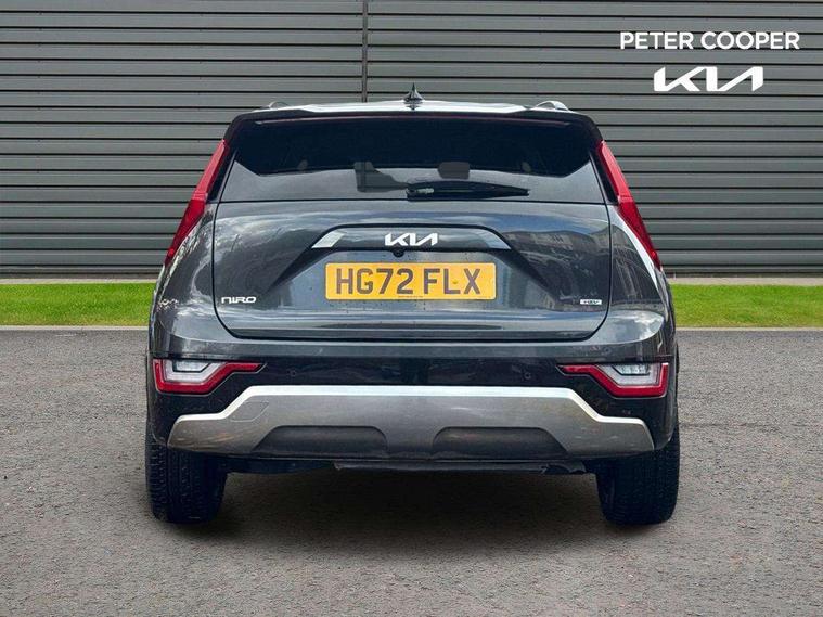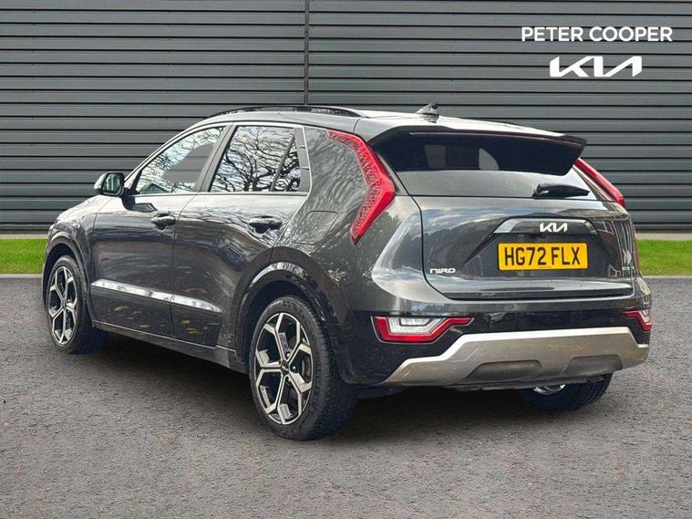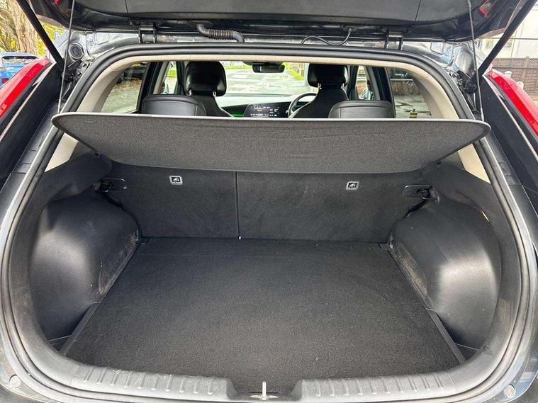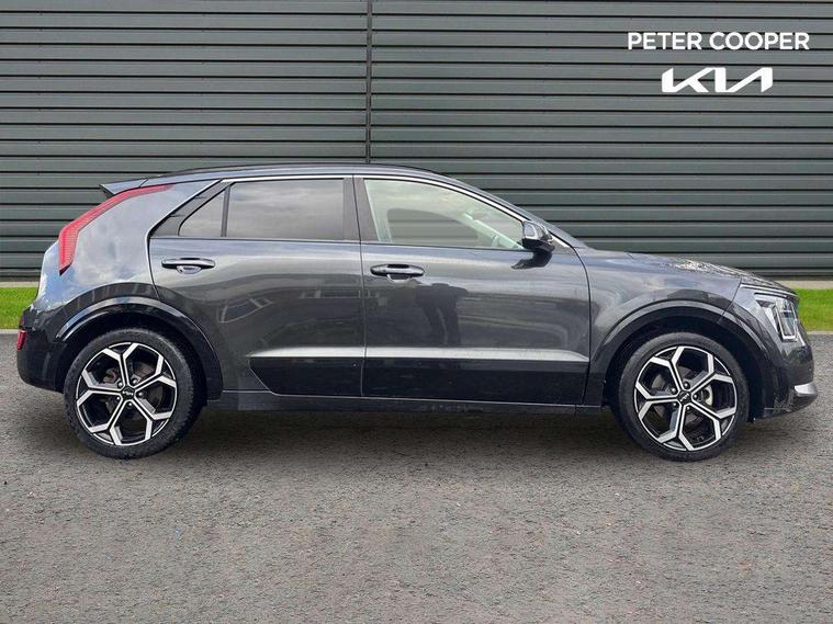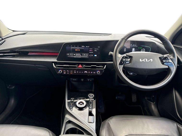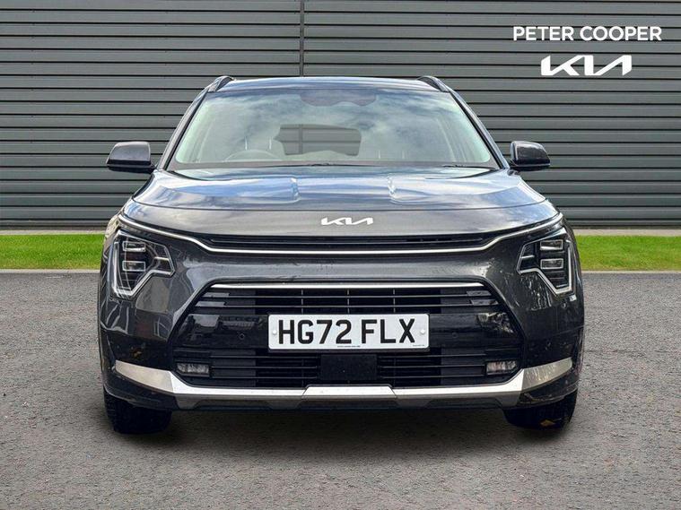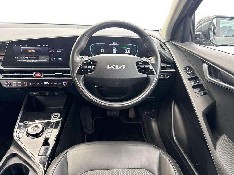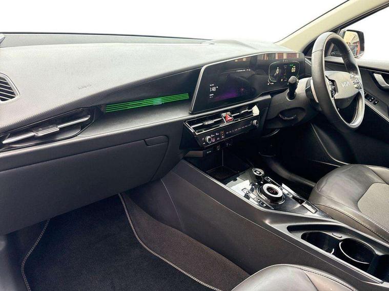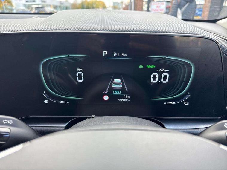 10.25" touchscreen satellite navigation, 4.2" supervision colour cluster display, Adaptive smart cruise control function (SCC) with stop and go, Apple car play/Android Auto with voice control, Blind spot collision avoidance assist, Drive mode select (Eco, sport), E-call, Emergency stop signalling system, Forward Collision-Avoidance Assist (FCA) 1.5 - City/Pedestrian/Cyclist/Junction turning, Front parking sensors, Highway Driving Assist (HDA), Kia Connect (UVO), Lane Following Assist (LFA), Lane keep assist, Motor driven power steering, Rear cross traffic alert, Rear parking sensors, Reversing camera with dynamic guide lines, Safe exit warning (SEW), Speed limit assist, Tailgate, Trip computer with distance/fuel consumption/average speed, Wireless Smartphone charger, 220v AC Inverter, 'Shark fin' mobile antenna, 2 type C USB ports on front seats, 2 USB ports in centre console including 1 type C, 6 speakers, Bluetooth with music streaming, DAB Digital radio, Steering wheel mounted controls, Acoustic windshield, All round electric windows with drivers and front passenger auto up/down and safety function, Auto dimming rear view mirror, Automatic defog system, Automatic headlight control system, Black beltline mouldings, Black grille with chrome surround, Body colour bumpers, Body colour exterior door handles, Dual LED headlights (low and high projection), Electric heated door mirrors, Electrically folding door mirrors, Front and rear chrome skid plates, Front fog lights, Heated rear window with timer, High gloss black cladding, High gloss black door mirrors, LED daytime running lights, LED rear combination lights, LED third brake light, Privacy glass - Rear windows and tailgate, Rain sensing front wipers, Rear fog lights, Rear side wing doors, Rear spoiler, Rear wiper, Roof rails, Solar glass windscreen, Welcome and follow-me home light functionality, Windscreen Washer Level Warning, 12v socket in front, 12V socket in luggage compartment, 3 seat bench in 2nd row, 60/40 split/folding 2nd row of seats, All-round height adjustable headrests, Artificial leather centre console storage box, Artificial leather steering wheel, Bulb overhead console, 2nd row and luggage lamp, Centre console cupholder, Chrome coating interior door handles, Cloth / Artificial leather upholstery, Driver's power adjustable seat, Driver/passenger sunvisors with illuminated vanity mirrors, Drivers seat power lumbar support, Dual zone automatic air conditioning, Front and rear door storage, Heated front seats, Heated steering wheel, Illuminated glovebox, Interior door lock/unlock function, ISOFIX Child seat top tethers and anchor fixings, Luggage area load cover, Luggage board, Paddle shifts, Passenger seat height adjuster, Rear armrest, Seatback pocket - driver, Seatback pocket - front passenger, Shift by wire SBW, Single front passenger seat, Tilt/telescopic adjustable steering wheel, Ventiliation ducts to rear compartment, Towing pack - Niro, 3 point seatbelts on all seats, ABS, Automatic unlocking of doors in case of impact, Centre side front airbags, Curtain and side airbags, Drivers knee airbag, Dual shell horn, Electric parking brake with auto hold function, Electronic stability control, Front passenger airbag deactivation, Height adjustable front seatbelts, Hill start assist control (HAC), Manual rear child locks, Rear seat alert system, Traction control, Tyre pressure monitoring system, Alarm system and engine immobiliser, Deadlocks, Engine Start/Stop Button with Smart Entry System, Locking wheel nuts, Visible vehicle identification number, Warranty - 7 Years/ 100, 000 miles, Centre fascia chopped carbon, 18" Alloy wheels, Tyre mobility kit,