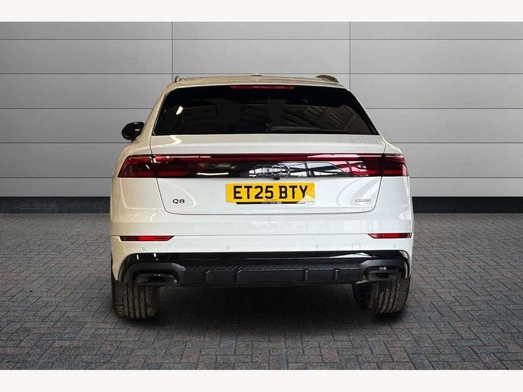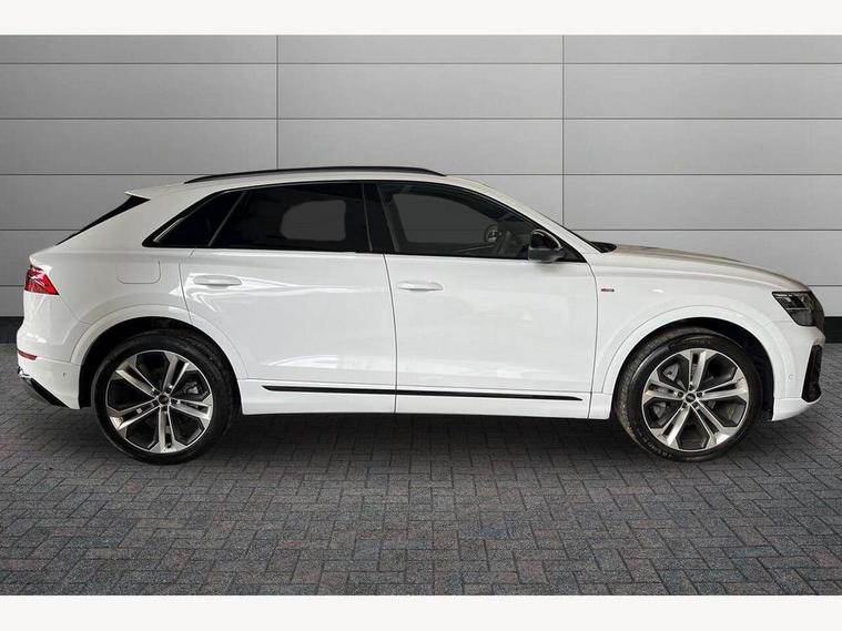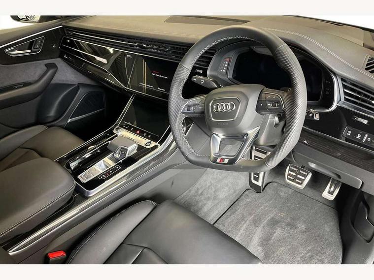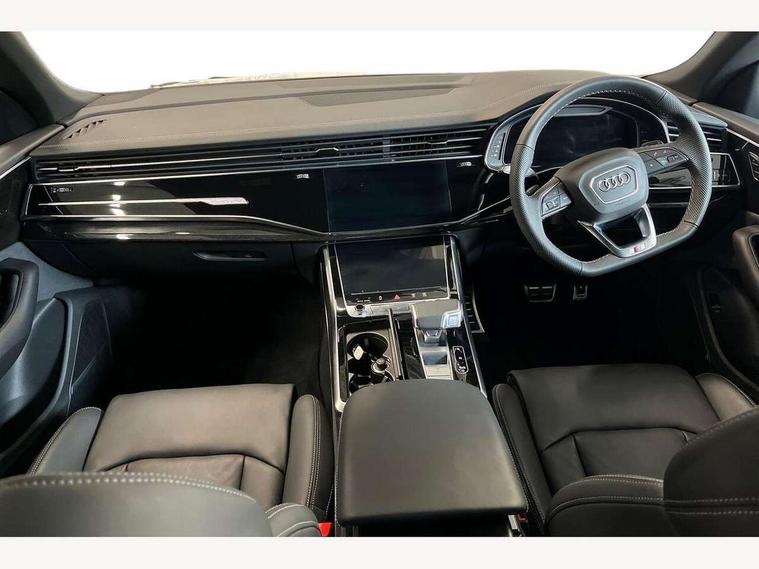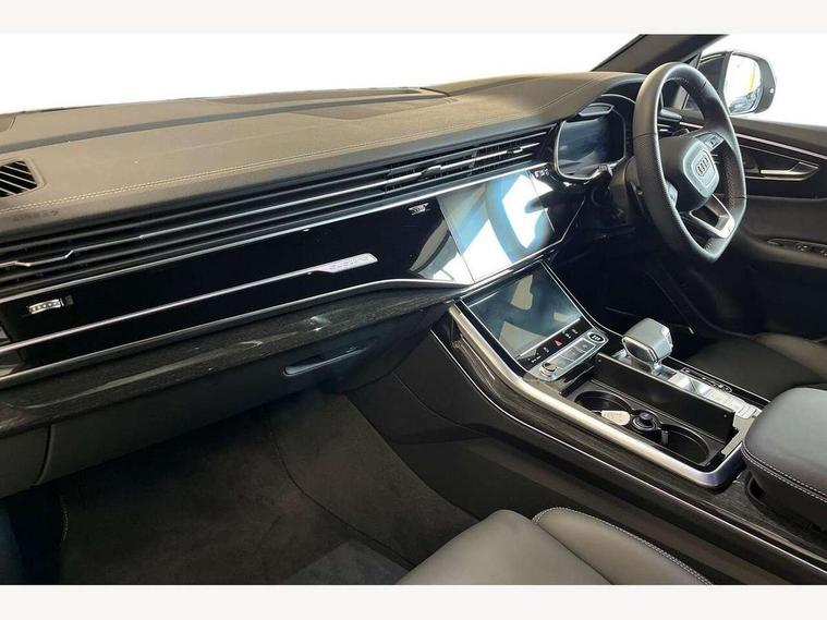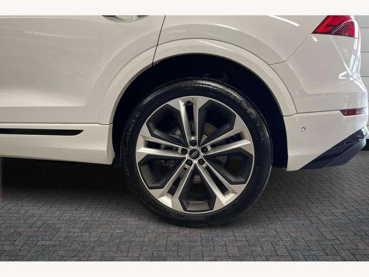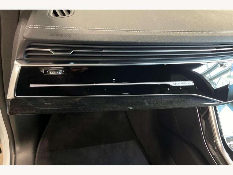10.1" and 8.6" Dual colour touchscreens, Audi application store, Audi connect safety and service (e-call), Audi connect with Amazon Alexa Integration, Audi drive select, Audi parking system plus includes 360 degree display with front and rear sensors, Audi phone box light with wireless charging, Audi virtual cockpit - 12.3" high resolution LCD display with fully customisable instrument cluster, Automatic start/stop system, Bluetooth, Electro-mechanical PAS, Low washer fluid indicator, MMI navigation plus with MMI touch, Natural voice recognition, On board computer, Operating buttons in black, glass look with haptic feedback, Power operated tailgate, Rear view camera, Service interval indicator, Smartphone interface includes wireless Apple carplay/Android Auto, 48V Mild hybrid technology, Adaptive sport air suspension, Diesel particulate filter, Quattro all wheel drive with self locking centre differential, Audi music interface with 2 USB ports with charge and data functions, Audi sound system with 6 channel amplifier, 180 watt amplifying capacity and 10 loudspeakers including subwoofer, Aux-in socket, DAB Digital radio, 3rd brake light, Audi beam, Auto dimming frameless rear view mirror, Black exhaust tailpipes, Black single frame mask, Coming/leaving home lighting function, Electric front+rear windows, Electrically folding auto dimming/adjustable/heated door mirrors with memory function, LED side indicators and kerb view function for passenger side, Headlight washers, Heat insulating glass in windshield, LED rear light plus, LED signature daytime running lights, Loading edge protection in stainless steel, Matrix LED headlights with dynamic front and rear indicators, Platinum grey front spoiler lip and diffuser insert with honeycomb grille in black, Privacy glass - dark tinted rear and rear side windows from B-pillar backwards, Rain and light sensors, Rear side wing doors, Rear wiper, Singleframe grille surround in matte platinum grey, 2 zone automatic climate control, 3 bench rear seats in 2nd row, 4-way lumbar support for front seats, 40:20:40 split folding rear bench seat, Black cloth headlining, Comfort front centre armrest, Driver seat memory function, Electrically adjustable front seats, Front head restraints, Front/rear floor mats, Heated front seats, ISOFIX child seat mounting for front passenger seat and 2 outer rear seats with top tether child seat mounting for all 3 rear seats, LED interior ambient lighting, Luggage compartment sill protection in stainless steel, Rear centre armrest with 2 cupholders, Rear headrests, Seat cushion displaceable by 100mm in the ratio 60:40, Single front passenger seat, Stainless steel pedals, Sunvisors with illuminated vanity mirrors, Black styling pack plus - Q8, 3 point seatbelts on all seats, Audi pre sense front, Convenience key with safelock, Driver and front passenger, front side and curtain airbags, Electromechanical parking brake, Electronic Stability Control (ESC) including ABS, ASR and EDL, Front passenger airbag deactivation, Hill descent control, Hill hold assist, Predictive pedestrian protection, Seatbelt monitoring, Traction control, Tyre pressure loss indicator, Warning triangle and first aid kit, Anti theft alarm with tow away protection, Anti-theft wheel bolts and wheel loosening detection, Electronically operated child lock, Immobiliser, Keyless go with remote central locking, Polished oak trim with grey finish inlay, Tool kit, Tyre repair kit,