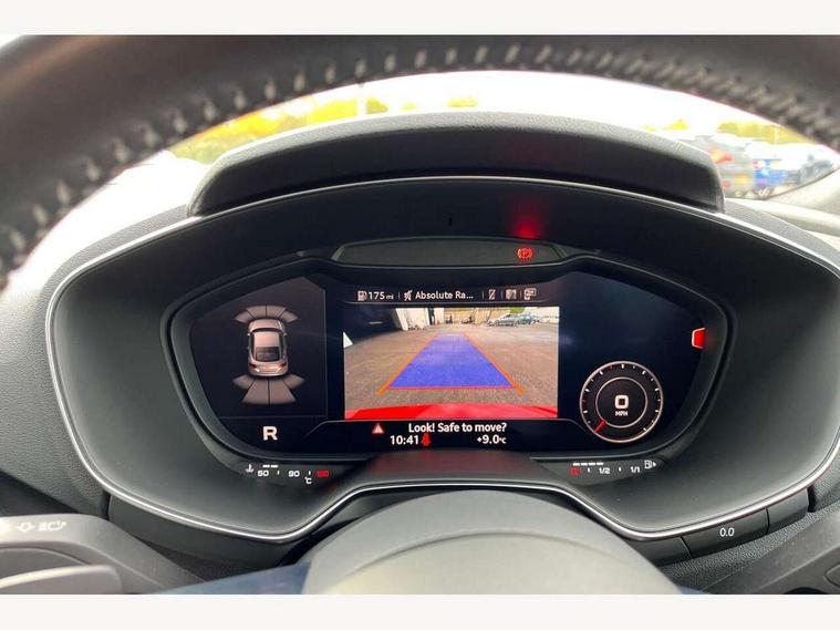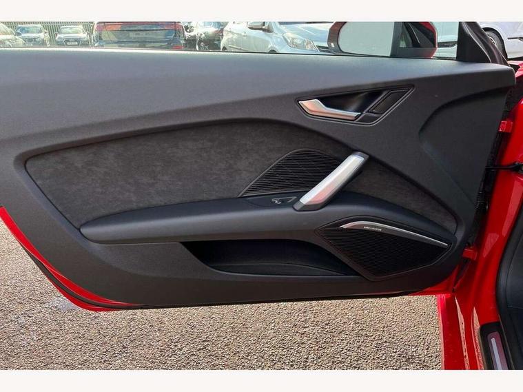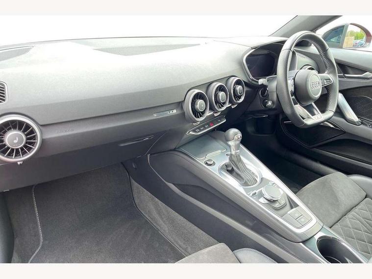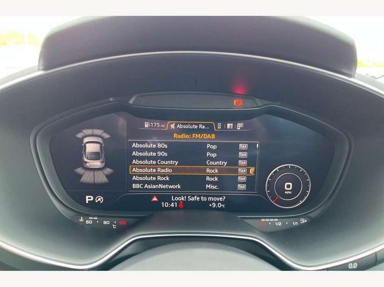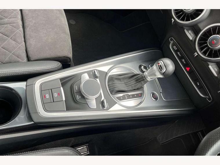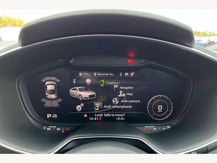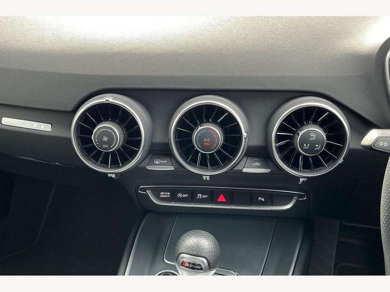 Audi drive select with 4 Pre configured modes, Audi smartphone interface, Audi virtual cockpit - 12.3" high-resolution LCD display with fully customisable instrument cluster, Cruise control + speed limiter, Emergency call service, MMI touch panel, Mobile phone preparation with bluetooth interface, Progressive power assisted steering, Service interval indicator, Start/Stop system with energy recuperation, TP memo, Sports suspension, AM/FM radio, Bluetooth audio streaming, DAB Digital radio, MMI Radio with CD player and SD/XC card slot, Auto dimming rear view mirror, Auto headlight range control, Black chrome tailpipe, Dark privacy glass from B-pillar backwards, Electric folding door mirrors, Electric front windows, Electrically adjustable and heated door mirrors with integrated LED side indicators, Front fog lights, Green tinted heat insulating glass, LED 3rd brake light, LED daytime running lights, LED headlights with LED rear lights + dynamic rear indicators, Light and rain sensors, Rear boot, Sunband for windscreen, 12V socket, 2 rear seats, 3 spoke flat bottomed high multi-function leather sport steering wheel with gearshift paddles, 4 way electric lumbar support for driver and front passenger, Black headlining, Contrasting silver stitching in steering wheel, Door sill trims, Extended aluminium look with stainless steel pedals, Front centre armrest, Front passenger seat, Front super sports seats, Heated front seats, Height adjustable driver's seat, Height adjustable front head restraints, Height/reach adjust steering wheel, ISOFIX child seat mounting for front passenger seat with airbag deactivation, Manual adjustment of seat height, fore/aft position, seat angle, seat depth and backrest angle, Perforated leather gearknob in black, Rear head restraints, Rear top tether child seat ISOFIX attachment, Split folding rear seat, Tool kit, Black styling pack - TT, Non smoking pack - TT/TT RS, 3 point front seat belts, ABS, ASR traction control, Curtain airbags, Driver and front passenger airbag with front passenger airbag deactivation, EDL traction control, Electromechanical parking brake, ESP, First aid kit, Front side airbags, Head airbags, Hill hold assist, Seatbelt warning, Tyre pressure loss indicator, Warning triangle, Anti theft alarm, Anti theft wheel bolts, Immobiliser, Keyless Go, Remote central locking, Matt brushed aluminium inlays, Tyre repair kit,