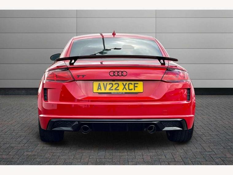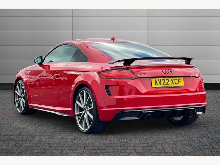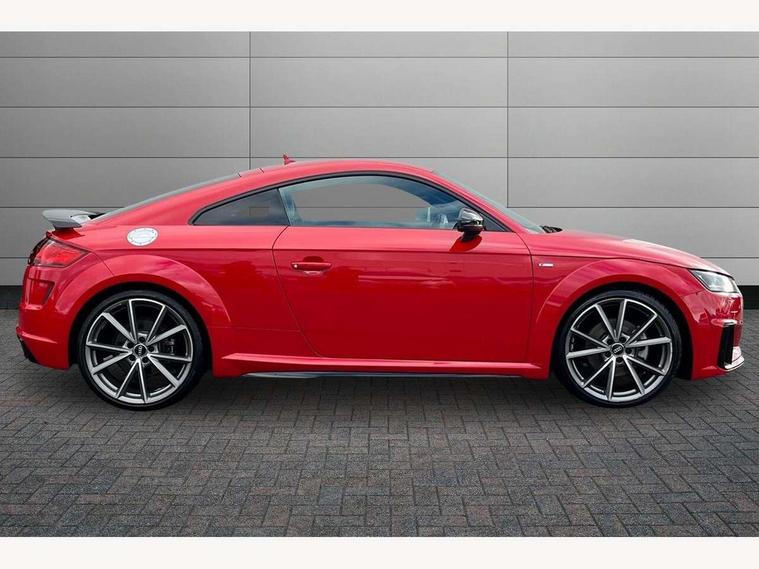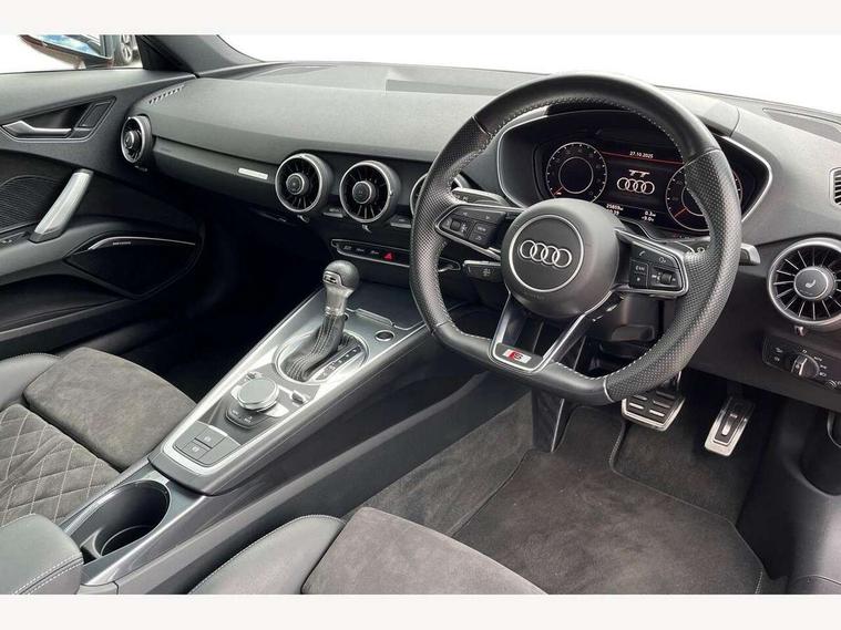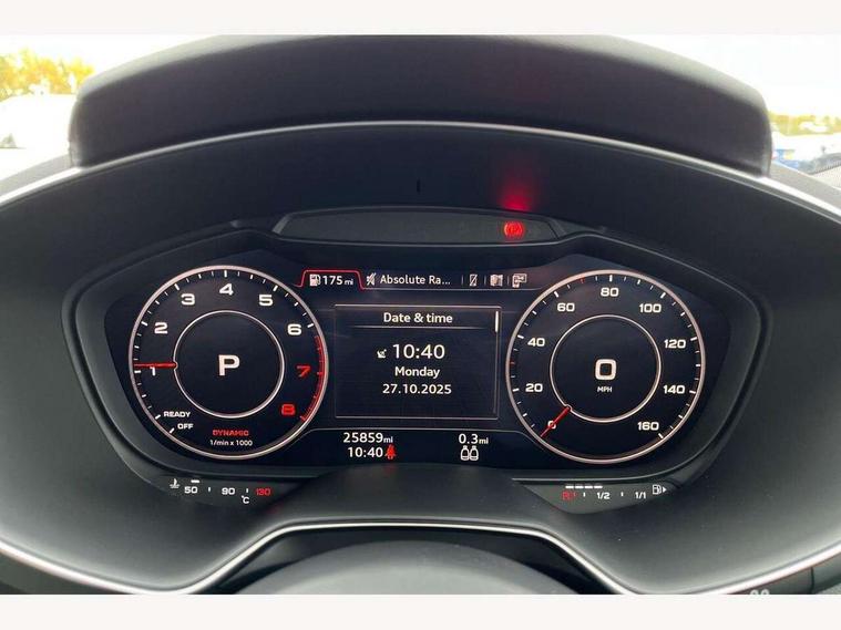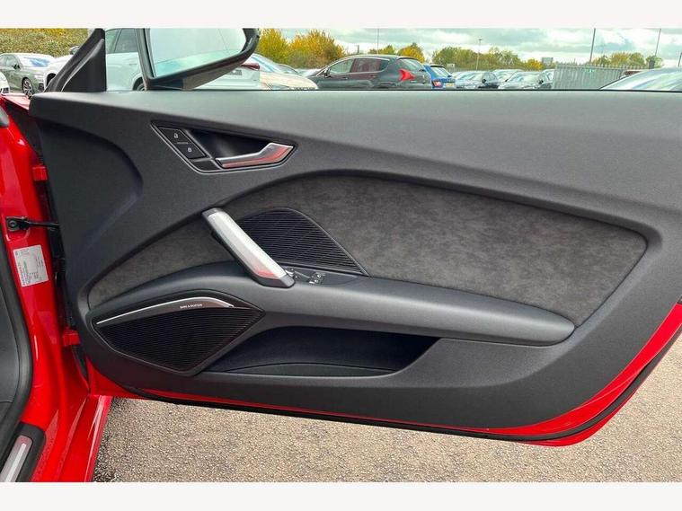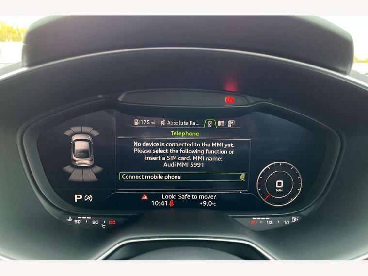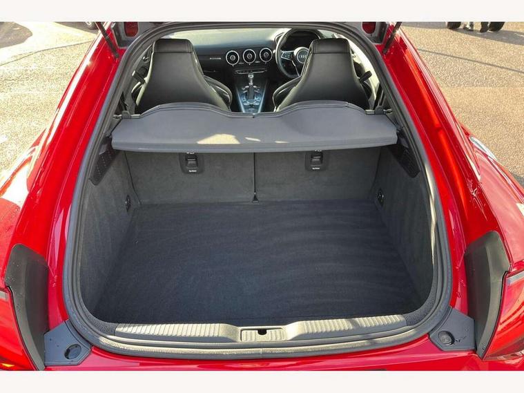 Audi drive select with 4 Pre configured modes, Audi smartphone interface, Audi virtual cockpit - 12.3" high-resolution LCD display with fully customisable instrument cluster, Cruise control + speed limiter, Emergency call service, MMI touch panel, Mobile phone preparation with bluetooth interface, Progressive power assisted steering, Service interval indicator, Start/Stop system with energy recuperation, TP memo, Sports suspension, AM/FM radio, Bluetooth audio streaming, DAB Digital radio, MMI Radio with CD player and SD/XC card slot, Auto dimming rear view mirror, Auto headlight range control, Black chrome tailpipe, Dark privacy glass from B-pillar backwards, Electric folding door mirrors, Electric front windows, Electrically adjustable and heated door mirrors with integrated LED side indicators, Front fog lights, Green tinted heat insulating glass, LED 3rd brake light, LED daytime running lights, LED headlights with LED rear lights + dynamic rear indicators, Light and rain sensors, Rear boot, Sunband for windscreen, 12V socket, 2 rear seats, 3 spoke flat bottomed high multi-function leather sport steering wheel with gearshift paddles, 4 way electric lumbar support for driver and front passenger, Black headlining, Contrasting silver stitching in steering wheel, Door sill trims, Extended aluminium look with stainless steel pedals, Front centre armrest, Front passenger seat, Front super sports seats, Heated front seats, Height adjustable driver's seat, Height adjustable front head restraints, Height/reach adjust steering wheel, ISOFIX child seat mounting for front passenger seat with airbag deactivation, Manual adjustment of seat height, fore/aft position, seat angle, seat depth and backrest angle, Perforated leather gearknob in black, Rear head restraints, Rear top tether child seat ISOFIX attachment, Split folding rear seat, Tool kit, Black styling pack - TT, Non smoking pack - TT/TT RS, 3 point front seat belts, ABS, ASR traction control, Curtain airbags, Driver and front passenger airbag with front passenger airbag deactivation, EDL traction control, Electromechanical parking brake, ESP, First aid kit, Front side airbags, Head airbags, Hill hold assist, Seatbelt warning, Tyre pressure loss indicator, Warning triangle, Anti theft alarm, Anti theft wheel bolts, Immobiliser, Keyless Go, Remote central locking, Matt brushed aluminium inlays, Tyre repair kit,