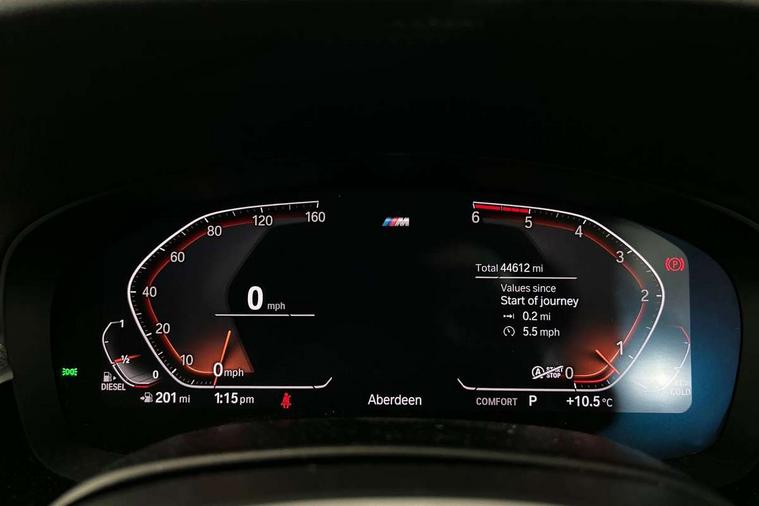 20GB hard disc drive (HDD) memory, Average speed gauge, BMW Live Cockpit Professional sat nav system including 10.25" high resolution display and Intelligent Voice Assistant, BMW Online services, BMW remote services, BMW Teleservices, Brake force display, Control display - 10.25" colour touch sensitive display screen, Fuel consumption and range, iDrive touch controller with shortcut buttons, Journey computer, Navigation System Professional Multimedia, Oil sensor for level and grade, On board computer, On-board diagnosis - OBD, Outside temperature display, Personal Profile, Powered tailgate operation, Real time traffic information, Service interval indicator, Voice control system, Anti roll bar front and rear, Diesel particulate filter, Drive performance control with ECO PRO comfort + sport mode, M sport suspension, Sport automatic transmission, Variable vane geometry, Auxiliary input socket, Bluetooth audio streaming, BMW professional radio with MP3 + DVD playback capability, DAB Digital radio, Favourite buttons, Acoustic glazing, Active air stream kidney grille, All round anti-corrosion system, Auto dimming rear view mirror, Body colour door handles, Body coloured bumpers, Body coloured door mirrors, Body coloured side sills, Door handle illumination, Dynamic brake lights with LED technology, Electric front and rear windows with fingertip open/close + anti-trap facility and comfort closing function, Electrically adjustable and heated exterior mirrors includes integrated direction indicators, Follow me home headlights, Heated windscreen washer jets, Independent opening for tailgate window, Interior rear view electrochromatic mirror with automatic anti dazzle function, LED daytime running lights, LED fog lights, Left and right single chrome quadrilateral exhaust tailpipes, M aerodynamic bodystyling, Rain sensor with automatic headlight activation, xDrive designation on tailgate, 12V power socket in front and rear, 12V socket in luggage compartment, 3 Spoke M sports leather steering wheel, 40/20/40 split folding rear seats with additional mechanism in luggage compartment, Ambient interior lighting with 6 selectable light designs, Anthracite headlining, Automatically retracting and lowering load cover, Battery in luggage with jump start facility, Door sill finishers with BMW designation, Front and rear armrests integrated in door trim + centre console includes storage compartment and rear centre armrest includes 2 cupholders, Front and rear cupholders x 2, Front and rear door sill inlays with illuminated BMW M designation, Front and rear footwell lights, Gearshift paddles, Height and length adjustable steering column and activation via lateral lever on the steering column, Lockable glove compartment with light, M specific floor mats, M specific key, M specific pedals, M specific steering wheel, Multi-function controls for steering wheel, Rear headrests, Retractable luggage compartment dividing net, Through load system, 3x3 point rear seatbelts, Anti-lock braking system (ABS), Automatic Stability Control (ASC), BMW emergency call, Brake assist function, Brake energy regeneration, Child seat ISOFIX attachment rear outer seats, Cornering brake control (CBC), Crash Sensor - activation of central locking release, hazard warning light and interior lighting, Deformation zones front and rear with door reinforcements and bumpers that regenerate, Driver/front passenger, rear and side airbags, Driver/Passenger airbags (Impact dependent), DSC - Dynamic Stability Control, Dynamic brake control, Dynamic Traction Control - DTC, Electromechanical parking brake with automatic drive away release and auto hold function, Electronic brake force distribution, Engine drag torque control, Front head restraints with anti-whiplash, Front passenger airbag deactivation, Head airbags for first and second row seats, Hill start assist, M Sport braking system, Seat belts front inertia reel with pyrotechnical belt latch tensioner, belt force limiter and belt restrainer, Side impact protection, Three inertia reel rear seatbelts, Two tone horn, Tyre pressure monitoring system, Warning triangle and first aid kit, Alarm system with remote control and engine immobiliser, Locking wheel bolts, Remote central locking,