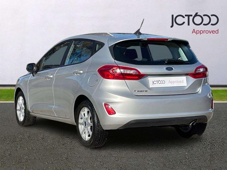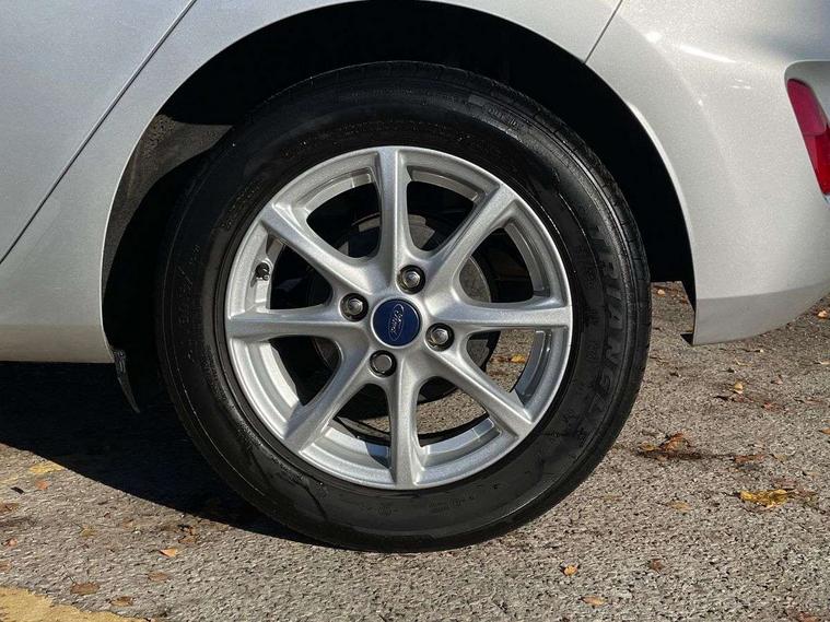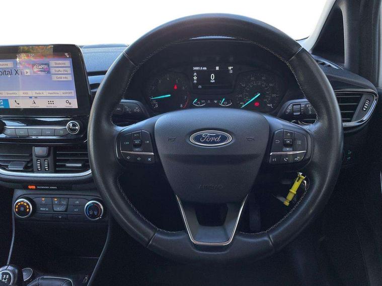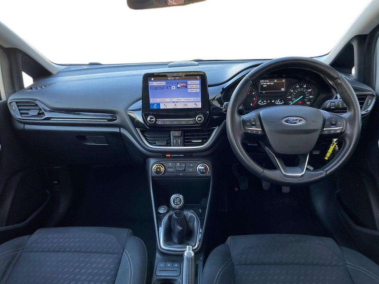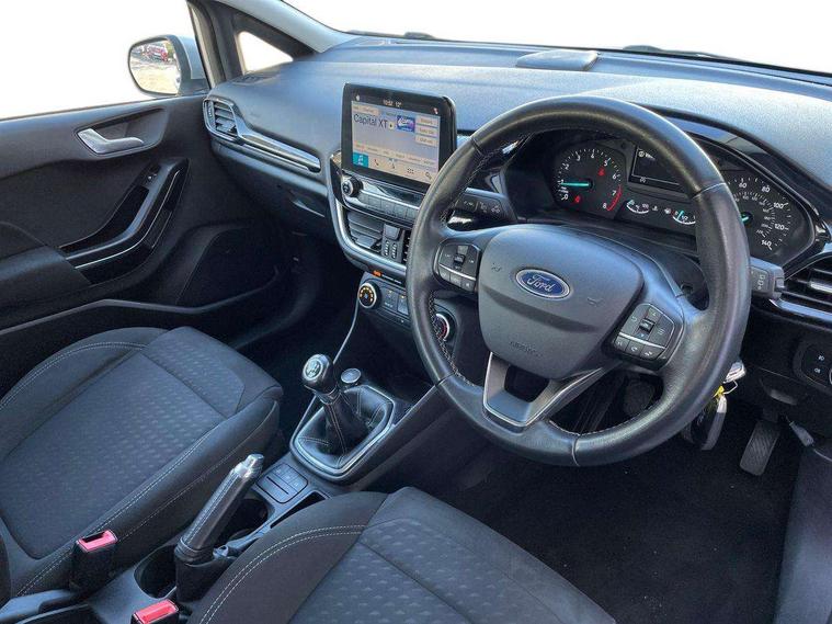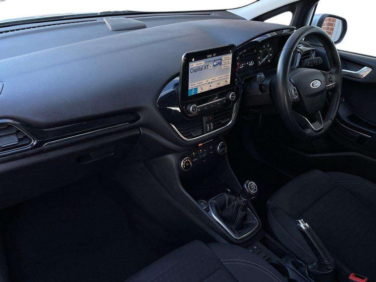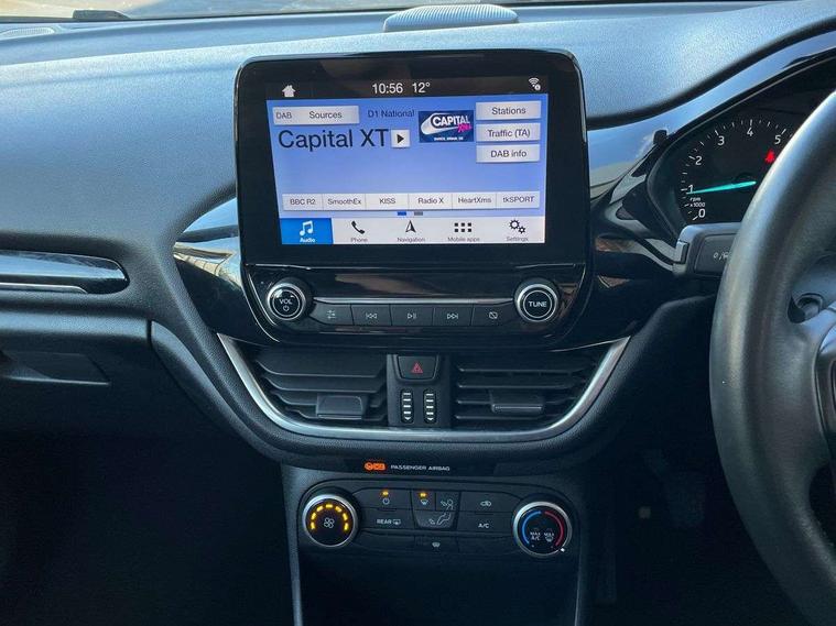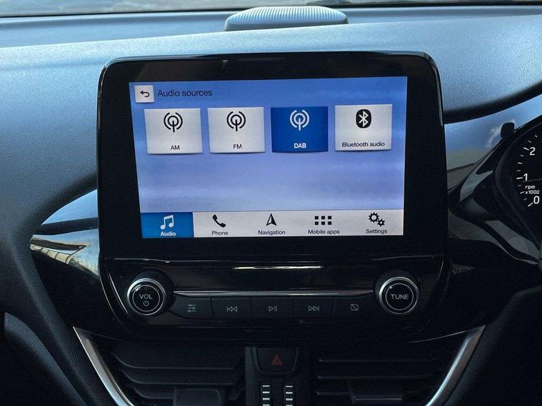 Bluetooth system, Electric power steering, Ford easy fuel, Trip computer, 2 USB ports, Auxiliary input socket, DAB Digital radio, Steering wheel mounted controls, Automatic headlights, Body colour bumpers, Body colour door handles, Body colour electric adjustable heated door mirrors with integral indicators, Body colour rear spoiler, Chrome beltline trim, Cornering front fog lights, Electric front windows/one touch facility, Halogen projector style headlights with static cornering lights + LED daytime running lights, Quickclear heated windscreen, Rear wiper, Tinted glass, Upper front grille chrome surround, 12V Accessory socket in centre console, 3 spoke leather trimmed steering wheel with audio control, 60/40 split folding rear seat, Adjustable head restraints, Boot carpet, Chrome inner door handles, Cloth upholstery, Footwell illumination, Front map reading lights, Front seat and rear pockets, Height adjustable driver's seat, Illuminated glovebox, Leather gear knob, Leather trimmed handbrake handle, Load area light, Luxury woven headliner, Manual air conditioning, Overhead console with sunglasses holder, Pollen filter, Rake/reach adjustable steering wheel, Rear centre head restraint, NCAP Pack - Fiesta, 3 point seatbelts on all rear seats, ABS+EBA, Curtain airbags, Driver and passenger airbags, Drivers knee airbag, Electronic stability control with hill start assist, Front passenger airbag deactivation, Front side airbags, Seatbelt warning, Tyre pressure monitoring system, MyKey system, Remote central locking & engine immobiliser, Thatcham Cat.1 alarm,