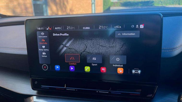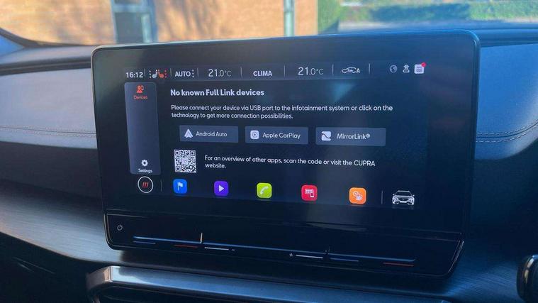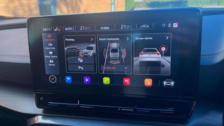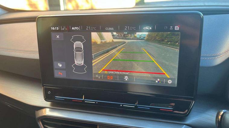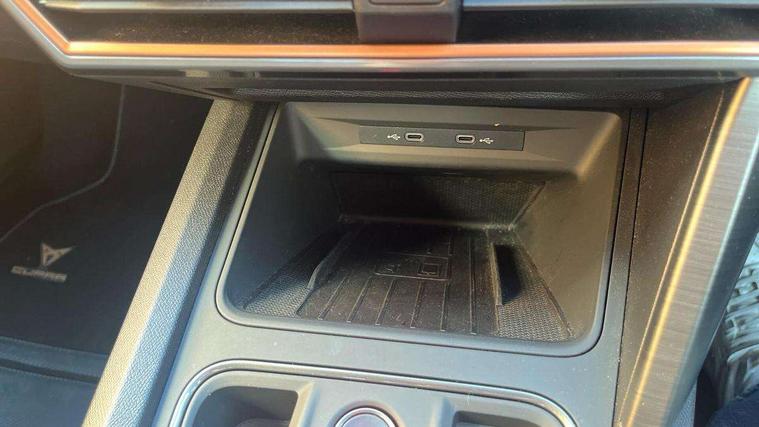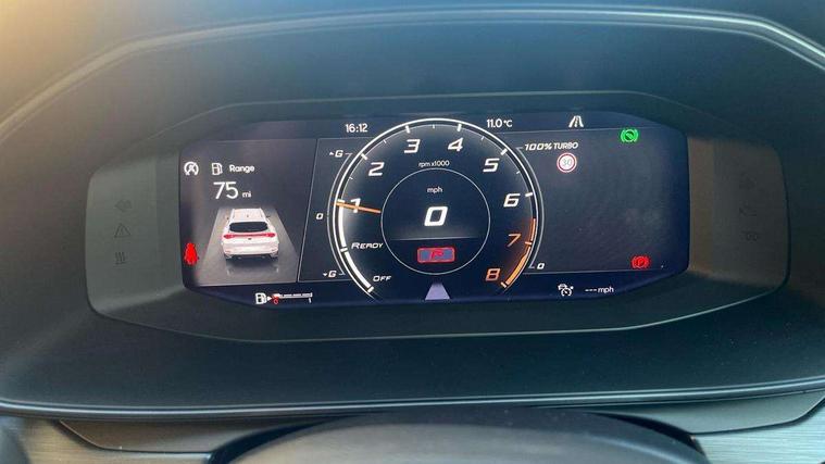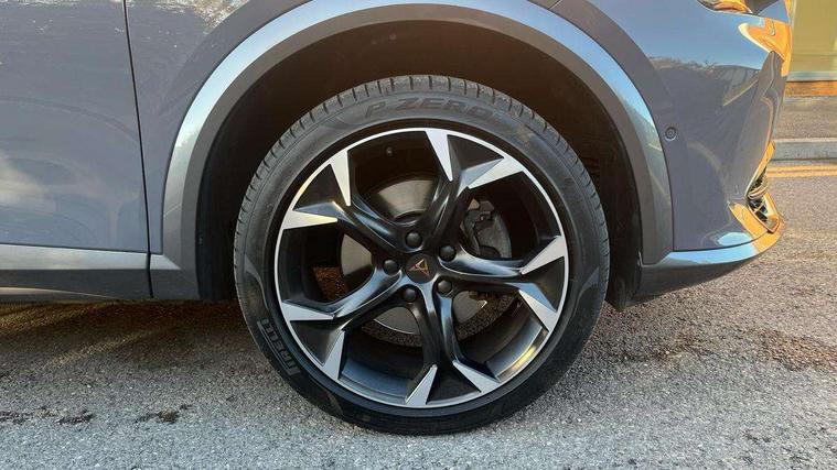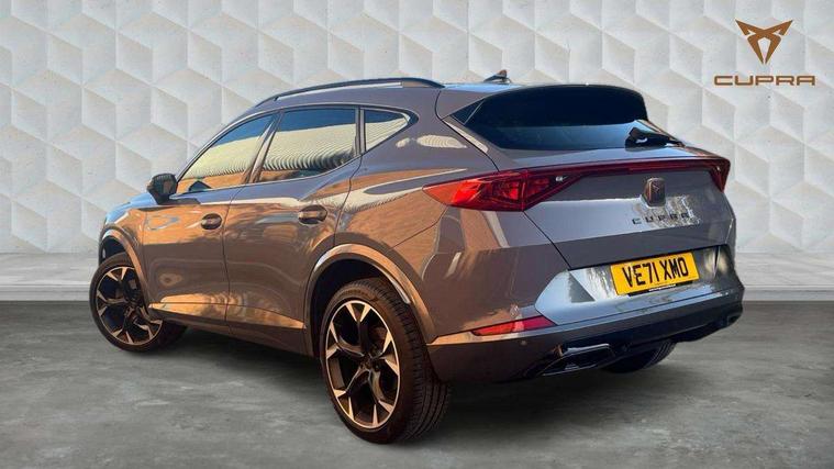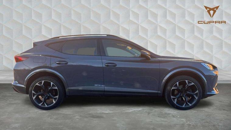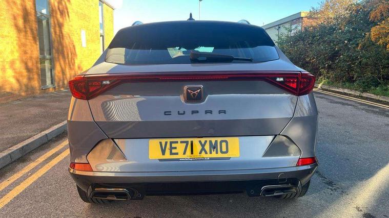 Digital cockpit and configurable dashboard, Driver alert system, Driving profile selection, E-call, Forward collision warning with automatic braking, Lane assist, Park assist (inc front/rear parking sensors), PAS, Predictive adaptive cruise control with speed limiter, Rear view camera, RPM, trip computer, outside temp gauge, instrument light brightness, low fuel warning light, lights on reminder, gearshift indicator, Service interval indicator, Start/stop system with regenerative braking, Wireless apple carplay, Wireless phone charger, Electronic locking differential and dynamic traction support, Standard suspension, 2 front and 2 rear USB type C sockets, Auxiliary input socket, DAB radio, Auto dimming rear view mirror, Body colour door handles, Body coloured bumpers, Dark grey wing mirror, Daytime running light with automatic headlight control and coming home feature, Dynamic headlight range control, Electric front/rear windows, Electrically adjustable heated and folding door mirrors with memory function, Front fog lamps with cornering function, Gloss black roof rails and window surrounds, LED Headlights, LED Taillights with dynamic indicator, Rain sensing wipers, Rear diffuser with black simulated exhaust pipes, Rear side wing doors, Rear wash/wipe, Third brake light, Tinted rear windows, Welcome lights, 12v power supply in centre console, 12V socket, 12v socket in loadspace, 2 front and 2 rear reading lights, 230V socket, 3 seat bench in 2nd row, 60/40 split rear bench seat with armrest and mechanical seat release, Dust/pollen filter, Front and rear head restraints, Front centre armrest, Height/reach adjust steering wheel, Illuminated interior front door sills, Illuminated sunvisor with mirror, Isofix, Leather multi function heated steering wheel with gear shift paddles, Luggage tie-down hooks, Single front passenger seat, Three zone climate control with control panel in rear, Variable luggage/load compartment floor, Wraparound lighting, Genuine Nappa leather Pack - Cupra, Navigation system pack with 10" navigation system - Formentor, 3 point seatbelts on all rear seats, ABS, Brake control system - ESC and brake booster, Child proof door locks, Driver and front passenger airbags with front passenger airbag de-activation, Electronic parking brake, Front and rear disc brakes, Front side curtain airbags, Hill hold control, Seat belt reminder for front and rear seats, Tyre pressure monitoring system, Anti theft alarm system, Keyless entry and start system (KESSY), Locking wheel bolts, Copper and aluminium interior detailing, 19" 'Exclusive' machined sport matte black and silver alloy wheels,