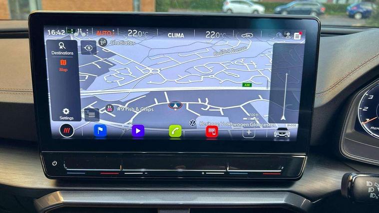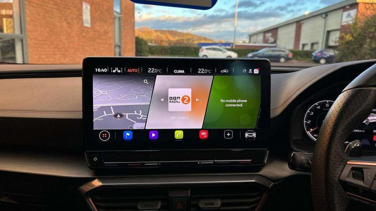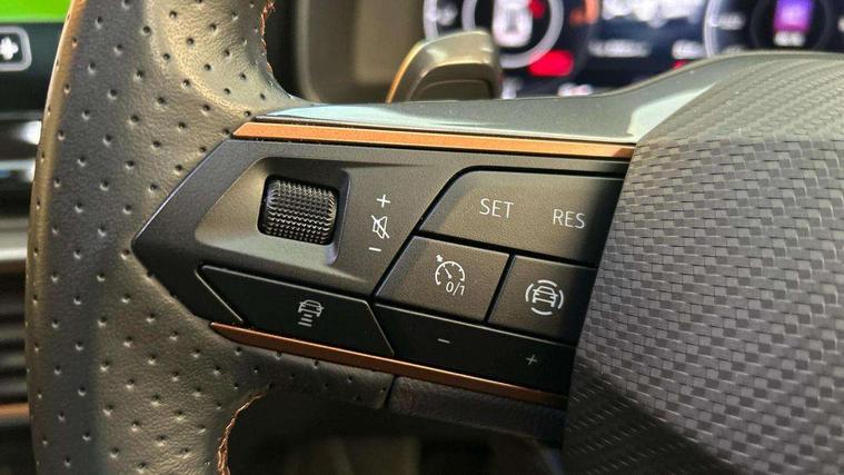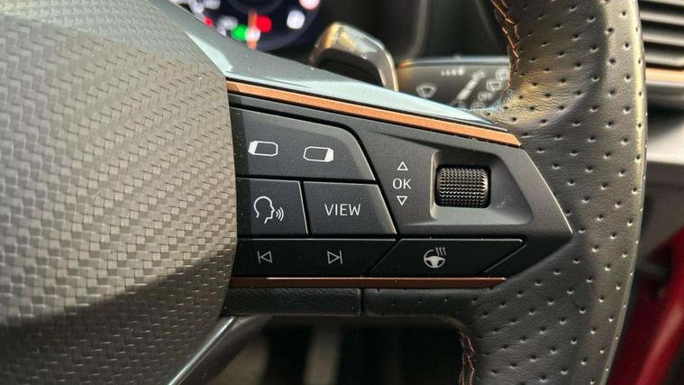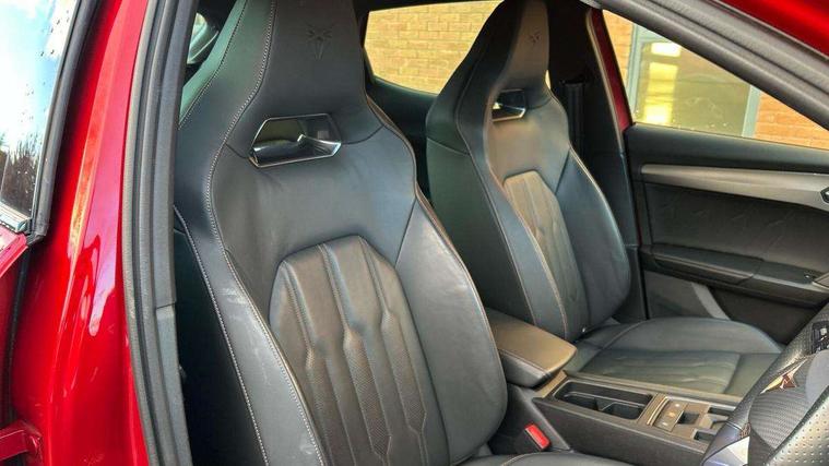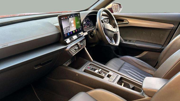 Digital cockpit and configurable dashboard, Driver alert system, Driving profile selection, Forward collision warning with automatic braking, Lane assist, Navigation system with 12'' Touchscreen Display, Park assist (inc front/rear parking sensors), PAS, Predictive adaptive cruise control with speed limiter, Rear view camera, RPM, trip computer, outside temp gauge, instrument light brightness, low fuel warning light, lights on reminder, gearshift indicator, Service interval indicator, Start/stop system with regenerative braking, Voice control system, Wired Android Auto, Wireless apple carplay, Wireless phone charger, Electronic locking differential and dynamic traction support, Standard suspension, 2 front and 2 rear USB type C sockets, Auxiliary input socket, DAB radio, Auto dimming rear view mirror, Body colour door handles, Body coloured bumpers, Dark grey wing mirror, Daytime running light with automatic headlight control and coming home feature, Dynamic headlight range control, Electric front/rear windows, Electrically adjustable heated and folding door mirrors with memory function, Front fog lamps with cornering function, Gloss black roof rails and window surrounds, LED Headlights, LED Taillights with dynamic indicator, Rain sensing wipers, Rear diffuser with black simulated exhaust pipes, Rear side wing doors, Rear wash/wipe, Third brake light, Tinted rear windows, Welcome lights, 12v power supply in centre console, 12V socket, 12v socket in loadspace, 2 front and 2 rear reading lights, 230V socket, 3 seat bench in 2nd row, 60/40 split rear bench seat with armrest and mechanical seat release, Black headlining, Dust/pollen filter, Front and rear head restraints, Front centre armrest, Height/reach adjust steering wheel, Illuminated interior front door sills, Illuminated sunvisor with mirror, Isofix, Leather multi function heated steering wheel with gear shift paddles, Luggage tie-down hooks, Single front passenger seat, Three zone climate control with control panel in rear, Variable luggage/load compartment floor, Wraparound lighting, Genuine Nappa leather Pack - Cupra, 3 point seatbelts on all rear seats, ABS, Brake control system - ESC and brake booster, Child proof door locks, Driver and front passenger airbags with front passenger airbag de-activation, Electronic parking brake, Front and rear disc brakes, Front side curtain airbags, Hill hold control, Public e-call, Seat belt reminder for front and rear seats, Tyre pressure monitoring system, Anti theft alarm system, Keyless entry and start system (KESSY), Locking wheel bolts, Copper and aluminium interior detailing, 19" 'Exclusive' machined sport matte black and silver alloy wheels,