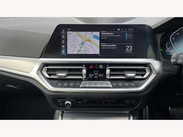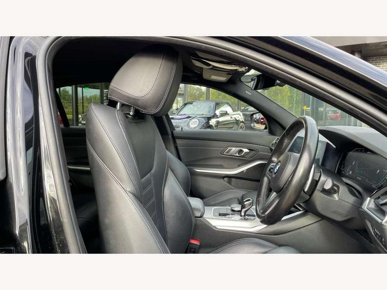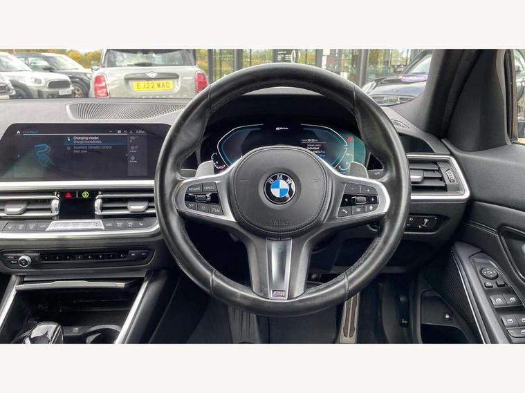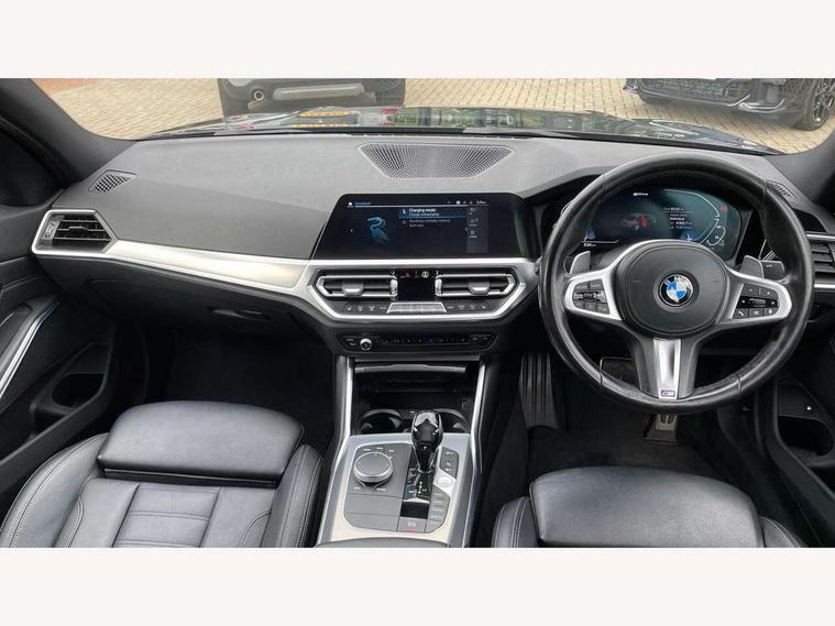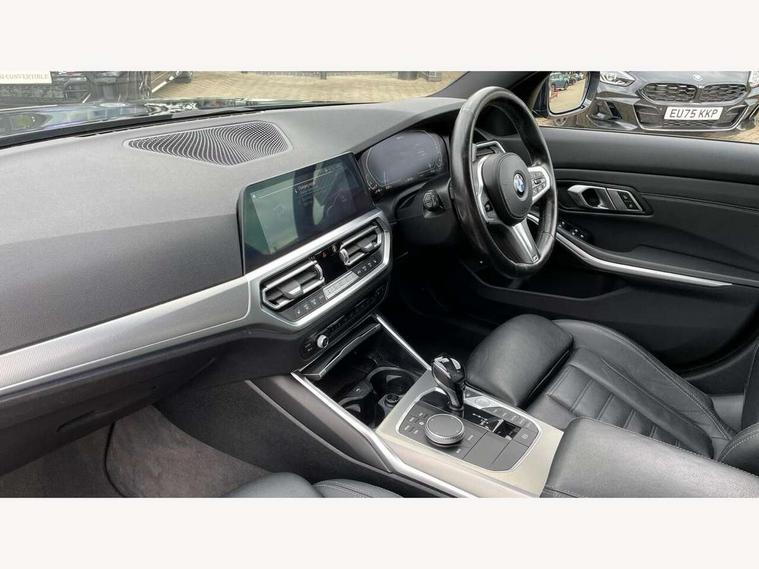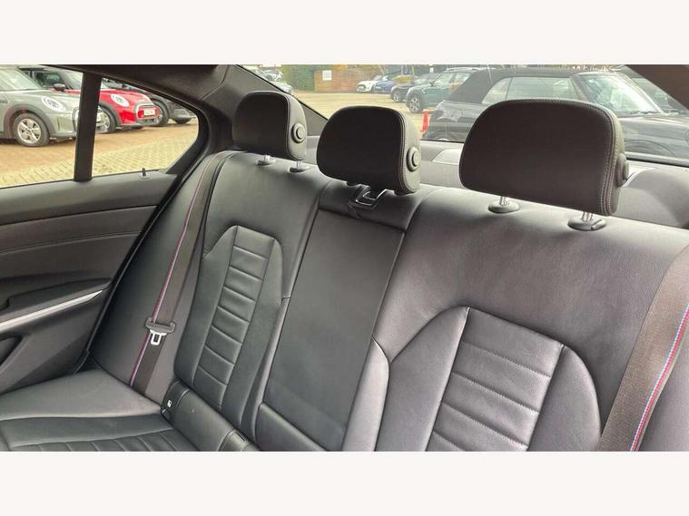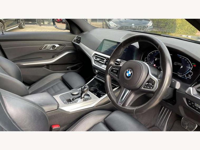 Active guard plus, Attentiveness assist, Auto start-stop, BMW Live Cockpit Professional Nav with 12.3" instrument display + 10.25" display, Intelligent Voice Assist, BMW OS 7, HDD, 2USB, 4G LTE connect, BMW service history, BMW Teleservices, Brake pad wear indicator in front and rear, Check Control warning system for monitoring of lights and door/luggage compartment open warning, Condition based service, Electric power steering with Servotronic steering optimised at all speed ranges, iDrive controller on centre console, Instrument cluster with speedometer with mph readout, tachometer, fuel gauge and oil temperature gauge, Integrated owners handbook, Oil sensor for level and grade, warning by check control system, On board computer - average speed+fuel consumption, service interval, clock/date, odometer/trip meter, outside temperature display and ice warning, Optimum shift indicator, Personal Profile - automatic lock when driving away selectable, Balanced 50/50 weight distribution, Battery cut-out switch, Drive performance control - ECO PRO, comfort and sport modes, Petrol Particulate Filter, Stroke dependent dampers, DAB tuner, Electronic service booklet, Acoustic glazing, Active airstream chrome frame kidney grille with 8 high gloss black vertical slats, Automatic headlight beam throw control with load dependent regulating reaction, dynamic compensation of braking dive and acceleration squat, Black roof mouldings, Body colour door handles, Body colour front and rear bumpers, Body colour fuel filler flap, Body colour mirror caps with bottom segment in matt black, Dynamic brake lights, Electric windows - front and rear, with open/close fingertip control, anti-trap facility and comfort closing, Exhaust tailpipe - split left and right, Exterior mirrors - electrically folding with anti-dazzle, Fading support, Front and rear bumper system with replaceable deformation elements, Front black door sill finishers with BMW designation, Green tinted heat protection glazing, High gloss shadow line exterior trim, Interior rear view electrochromatic mirror with automatic anti dazzle function, LED daytime running lights, LED front fog lights, Lightweight engineering, M designation on front side panels, left and right, Matt black exterior B pillar, Model designation on right side of tailgate, Rain sensor with automatic headlight activation, Shark fin antenna, Two part LED tailights in L-shape with components in smoked glass, brake light, LED turn indicator and rear fog light, Visible VIN plate, Welcome lights in interior and door handle area, Windscreen wipers with integrated washing jets, 12V power socket in front storage compartment, 2 front cupholder in centre console with clamping elements and matt black inlay, 3 rear seats with non folding headrests with 3 point seat belts, 3 zone automatic air conditioning, 4 pieces lashing eyelets in luggage compartment, 40:20:40 split folding rear seat with loading system, Ambient lighting with welcome carpet light, Anthracite headlining, Armrest integrated in front and rear door trim + front centre console armrest, Centred top Luggage compartment lights, Four grab handles integrated in roof lining, Front and rear door exit lighting (left / right), Front and rear door pockets, Front and rear reading lights, Front and rear velour floor mats, Front head restraints, Front sport seats, Heated driver and front passenger seats, Height adjustable mechanically and infinitely variable steering column, Illuminated armrest storage compartment, Illuminated glove compartment with separate small compartment, Interior lighting - front centre over interior mirror with soft light, rear centre and front and rear footwell lighting, M sport leather steering wheel, Make-up mirror lights, Rear centre armrest with 2 cupholders, Rear centre console with storage compartment and ventilation grille, Sunvisors with vanity mirrors and ticket pocket, Toolkit located in luggage compartment, Connected pack professional - 3 Series Saloon/Touring, M sport exterior styling pack - 3 Series Saloon/Touring, 2 tone horn, BMW emergency call, Brake energy regeneration, Braking pre-tensioning, Child proof locking system in rear door, Child seat ISOFIX attachment rear outer seats, Coasting in idle in ECO PRO mode, Crash sensor activating of airbags, Unlocking doors, hazard warning lights, fuel cut off, interior lighting+activation of safety battery terminal clamp, Driver and front passenger side airbags, integrated in the door side seat backrest bolsters for all seat variants, Driver/Front Passenger airbags, Dry braking, Dynamic brake control, Dynamic stability control + (DSC+) - Anti-lock Braking System (ABS) with brake assist and cornering brake control + Automatic Stability Control (ASC), Dynamic Traction Control - DTC, Electromechanical parking brake including automatic hold function and automatic release of the parking brake when pulling away, Electronic differential lock control (EDLC), Front passenger manual airbag deactivation, Head airbags for all 4 outer seats, Hill start assist, Seat belt security check for driver and front passenger, Side impact protection, Three 3 point seat belts on all seats including front belt stopper, pyrotechnic belt tensioners and belt force limiters, Tyre pressure monitoring with three level warning strategy, Ventilated front and rear disc brakes, Warning triangle and first aid kit, Alarm system (Thatcham 1) with remote control and electronic engine immobiliser, Central locking switch for all doors, fuel filler cap and luggage compartment, Remote control with integrated key one button open/close vehicle and windows, sole opening of the luggage compartment lid and panic mode, Start/stop button with Comfort Go keyless engine start and auto Start/stop deactivation button, Vehicle key with M specific designation, Reduced rolling resistance tyres,