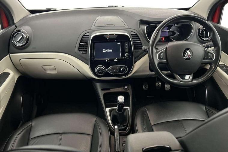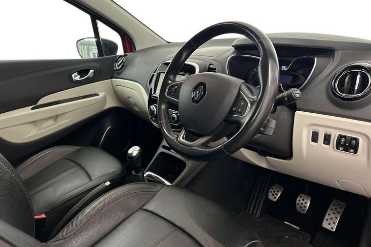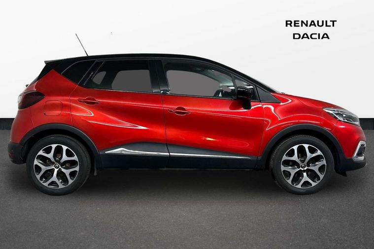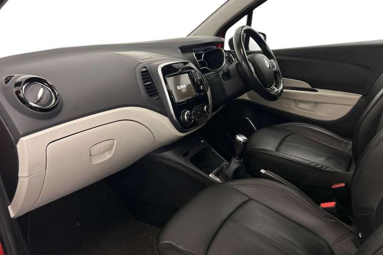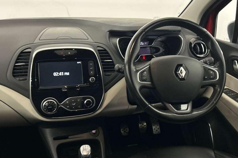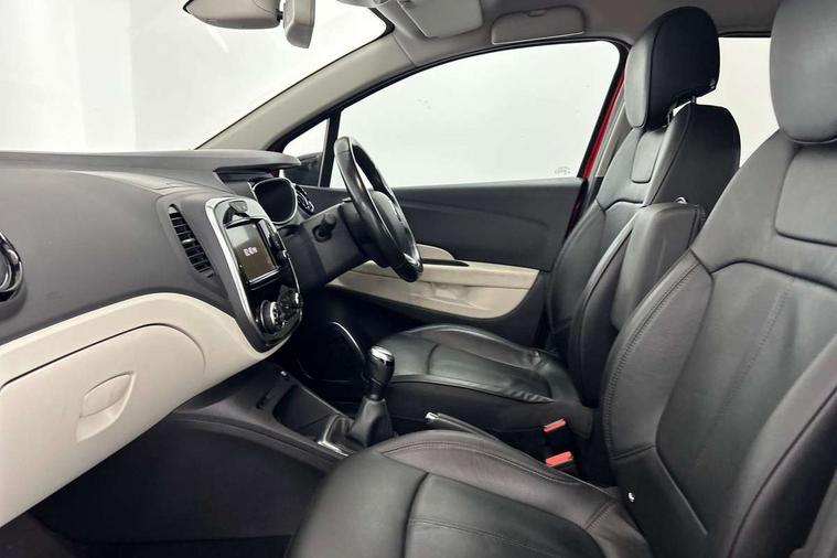 Exterior touch pack Chrome - Captur, Interior touch pack Chrome - Captur, Premium pack - Captur, Techno pack with front and rear parking sensors - Captur, 17" Emotion alloy wheels with black insert, Automatic door locking, Deadlocking system, Hands free access with keycard and start button, RAID (Renault Anti-Intruder Device) with automatic door locking, Remote central locking, Thatcham Cat 2 engine immobiliser, Auxiliary input socket, 3 point seatbelts on all rear seats, ABS+EBA, Driver/Front Passenger airbags, ESC - Electronic Stability Control + traction control, Front passenger airbag deactivation, Front side airbags(head+thorax), Hill start assist, Rear door child safety locks, Seatbelt warning, Tyre pressure monitor, Body colour door handles, Body coloured bumpers, Electric adjustable/heated/folding door mirrors, Electric front windows + one touch + anti-pinch, Electric rear windows, Extra tinted glass in rear windows and tailgate, Grey front and rear skid plate, LED daytime running lights, LED front fog lights with static cornering light function, Rain sensitive wipers + automatic lighting, Rear wiper, Variable intermittent front wash/wipe, 12V Accessory socket, 3 rear headrests, 60/40 split folding rear seat bench, Automatic climate control with one touch demist function, Centre console storage tray, Compartment in glovebox, Front centre armrest, Front cupholder, Front seat backrest storage nets, Heated front seats, Heating system with pollen filter, Height adjustable driver's seat, Height adjustable front headrests, Height/reach adjust steering wheel, ISOFIX on front passenger and rear outer seats, Leather steering wheel and gear knob, Light harmony dashboard and door panels, Part leather/cloth upholstery, Removable storage between driver and passenger, Reversible boot floor, Storage area on top of dashboard, Storage compartments in doors, Storage space near handbrake, Variable boot floor, Cruise control + speed limiter, Eco mode, Handsfree parking with side moulding and blind spot warning, Smartphone cradle, Trip computer, Variable PAS,