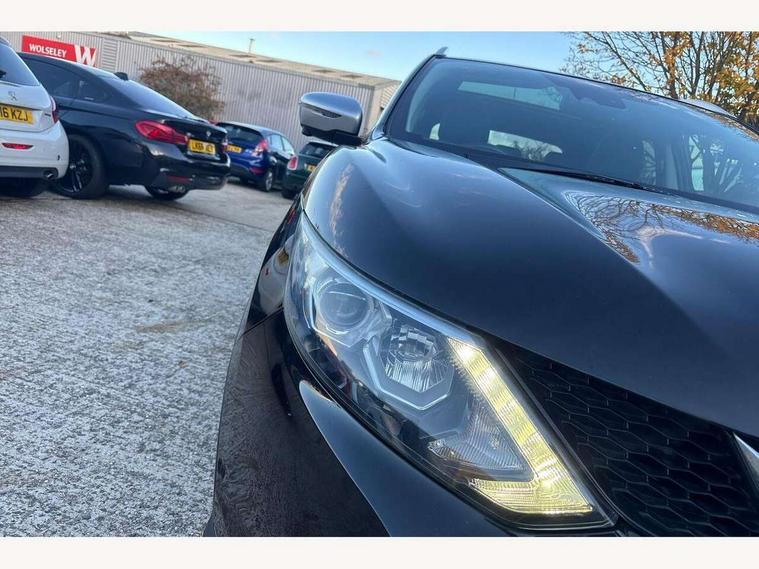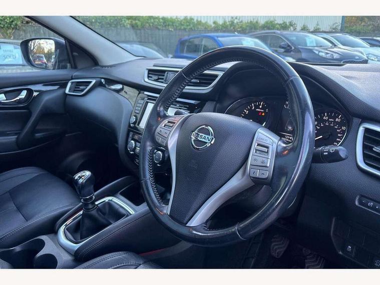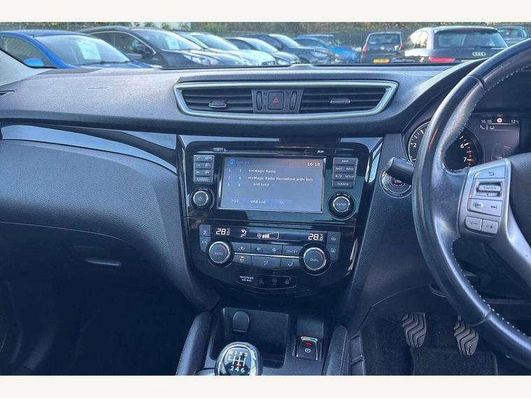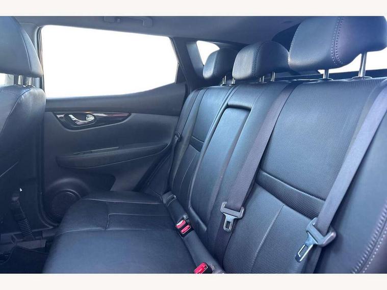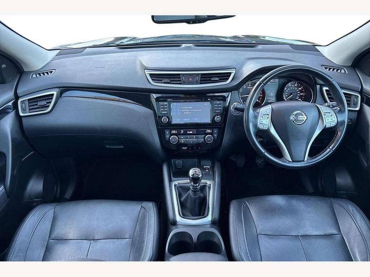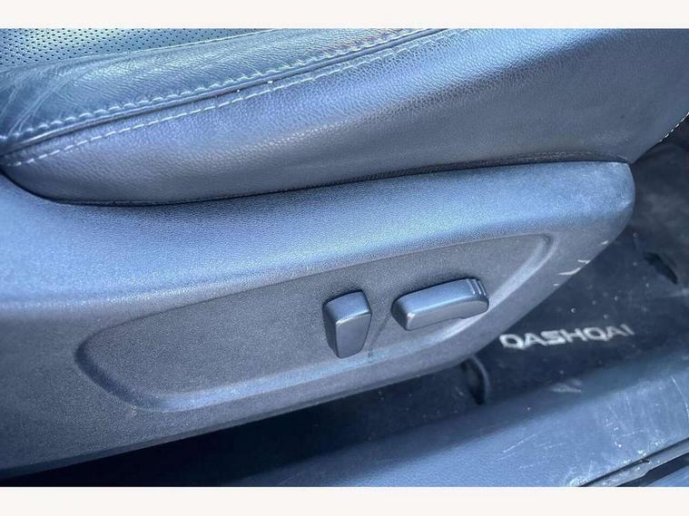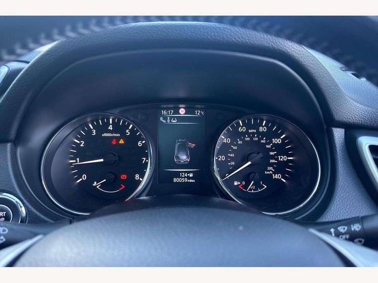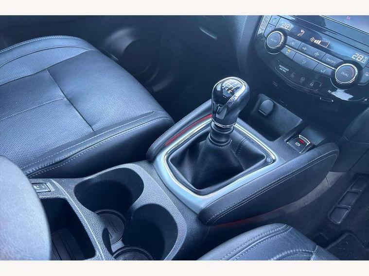 5" TFT driver information centre, Around View Monitor, Blind spot monitoring, Bluetooth phone integration system, Cruise control, Fatigue detection system, Front and rear parking sensors, Intelligent parking assist, Lane departure warning system, Moving object detection, Nissan connect sat nav system, PAS, Push button starter, Service interval indicator, Speed limiter, Traffic sign recognition, Trip computer, 6 speakers, DAB radio/CD player, Steering wheel mounted audio controls, USB/aux input socket, 2 speed wipers+variable intermittent wipe, Automatic headlamp activation, Bi LED headlights with auto levelling, Black honeycomb front grille, Body colour bumpers, Body colour door mirrors and handles, Chrome window surround, Electric folding and heated door mirrors, Electric front/rear windows, Front fog lights with chrome surrounds, Heated windscreen, High beam assist, Interior mirror with auto anti dazzle, LED daytime running lights, Privacy glass, Rain sensor windscreen wipers, Rear privacy glass, Rear wiper, Satin silver roof rails, 12V socket, 60/40 split folding rear seat, Ambient interior lighting, Driver/passenger front seatback pockets, Dual zone climate control, Electric front seats for height/ manual lumbar adj, Footwell ambient lighting, Front armrest, Front cupholders x 2, Front headrests, Front seat belt pre-tensioners with load limiters, Heated front seats, Illuminated glovebox, Isofix child seat preparation, Leather gearknob, Leather steering wheel, Leather upholstery, Luggage area divider, Map reading lamp, Pollen filter, Rake/reach adjustable steering wheel, Rear armrest with 2 cupholders, Rear headrests, ABS, brake assist and EBD, Child locks on rear doors, Curtain airbags, Driver/front passenger airbag, Electronic parking brake, ESP + traction control, Forward emergency braking, Height adjustable front seatbelts, Hill start assist, Side airbags, Three 3 point rear seatbelts, Tyre pressure monitoring system, Alarm, Immobiliser, Intelligent Key, Remote central locking, Tyre puncture repair kit,