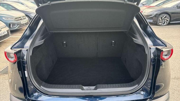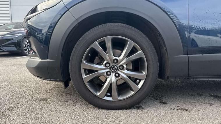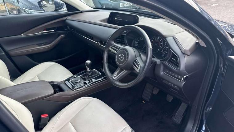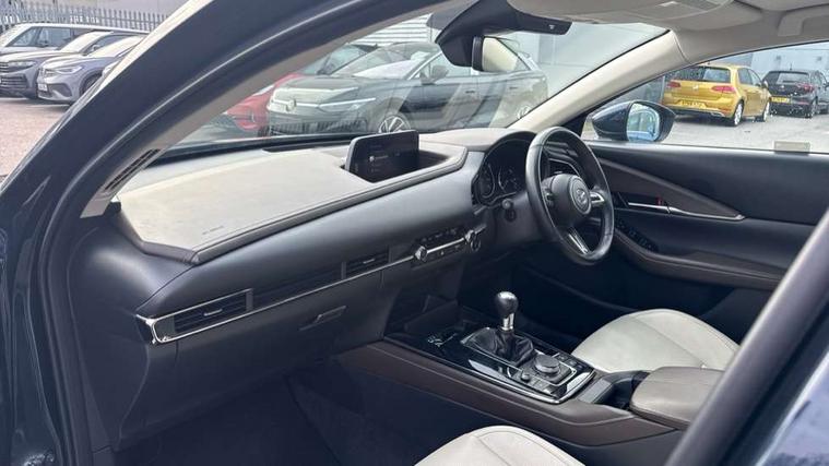 360 View Monitor, 7" TFT Colour driver instrument panel display, 8.8" Colour centre touch screen display with Mazda Connect infotainment, Adaptive cruise control (Mazda radar cruise control), Apple car play/Android Auto, Blind spot monitoring with rear cross traffic alert, Cruising Traffic Support, Driver attention alert system, Driver monitoring system, E-call with GPS, Emergency stop signalling system, Engine start/stop button, Front and rear parking sensors, Front Cross Traffic Alert, Integrated bluetooth, Integrated Mazda navigation system, Intelligent speed assist, Lane keep assist system (LAS) with Lane departure warning system (LDWS), Mazda connected services, PAS, Power lift gate, Service indicator, Tailgate, Traffic sign recognition, Trip computer, Windscreen projected colour active driving display (HUD), i-stop, 2 USB charging ports in front inner central armrest, AM/FM and DAB radio, Bose surround sound system with 12 Speaker, Bose center point, Bass match and audio pilot technology, Multimedia Commander including separate volume dial, Steering wheel mounted audio/bluetooth controls, Adaptive LED Headlights, Auto dimming driver's door mirror, Auto headlight levelling, B-pillar and C-pillar garnishes in piano black finish, Body coloured, electrically adjustable, heated auto power folding door mirrors with integrated indicators, Chrome finish signature wing in front grille, Coming/leaving home lighting function, Door mirrors with adjustable memory and tilt-down function when reversing, Dual chrome exhaust, Dusk sensing headlights, Electric front/rear windows with one touch auto up/down, Frameless auto dimming interior rear view mirror, Front kodo turn signal, Gloss black front grille, Gloss black rear roof spoiler, High beam assist, LED signature daytime running lights, Privacy glass (rear side windows and rear screen), Rain sensing front wipers with adjustable speed and intermittent wipe, Rear fog lights, Rear side wing doors, Rear wiper, Signature LED rear combination lights, Third brake light, 12V power outlet in centre console, 3 seat bench in 2nd row, 60/40 split fold down rear seats, Chrome horn pad ring, Chrome interior trim accents with steering wheel centre bezel, surround of engine start / stop button and glove box handle, Dashboard, door cards and front centre armrest in rich brown leather, Driver and front passenger visors with covered vanity mirror and driver ticket holder, Driver's seat, power tilt, slide, recline, height and lumbar adjustment, Driver, front passenger and two rear door storage, Driver, Front passenger and two rear grab handles with coathooks, Dual zone climate control air conditioning with rear air vents, Folding rear centre armrest with two cup holders, Front and rear (x3) head restraints, Front and rear LED lighting, Front armrest, Front centre storage with two cupholders with lid, Front passenger seatback pockets, Front passengers seat manual slide, recline and height adjustment, Gear shift indicator, Glovebox illumination, Heated front seats with 3 stage setting, Heated steering wheel, ISOFIX child seat anchorage points attached on outer rear seats, Leather wrapped gear shift knob, Leather wrapped steering wheel with telescopic and tilt adjustment, LED luggage compartment lighting, Light roof headlining and pillars, Rear armrest inner material in cloth, Roof mounted sunglasses holder, Single front passenger seat, 3 point ELR front seat belts x2 with pretensioners, 3 point ELR rear seat belts, Anti-lock braking system (ABS), Drivers knee airbag, DSC - Dynamic Stability Control, Electronic parking brake with auto disengage function and auto hold function, Front and rear curtain airbags, Front and rear smart city brake support, Front dual stage driver and single stage front passenger airbags, Front passenger airbag cut-off switch, Front side airbags, G-Vectoring control plus, Hill launch assist, Manual child lock in rear doors, Mild Hybrid system with regenerative braking, Rear cross traffic braking, Seatbelt reminder for driver/front passenger and rear seats, Traction control system (TCS), Tyre pressure monitoring system (TPMS), Remote central locking with deadlocking and automatic door lock when driving, Smart keyless entry, Thatcham accredited alarm and immobiliser, Dark vinyl door panel inserts, 18" Bright alloy wheels, Emergency tyre repair kit,