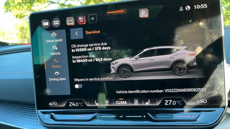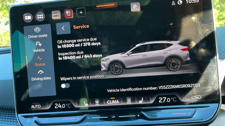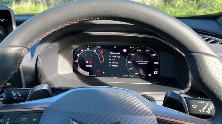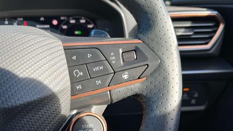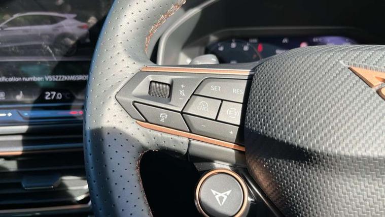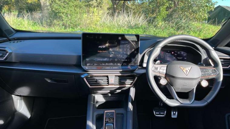 10.25" digital cockpit and configurable dashboard, Adaptive cruise control with follow-to-stop and speed limiter, Advanced driver alert system, Advanced lane assist with semi-automatic vehicle control in a medical emergency and traffic jam assist, Dynamic chassis control with driving profile selection (Comfort, Sport, CUPRA, Individual), Dynamic road sign display, Emergency steering support with turn assist, Forward collision warning with automatic braking, Front cross traffic assist, Full link phone integration, Intelligent park assist, RPM, trip computer, outside temp gauge, instrument light brightness, low fuel warning light, lights on reminder, gearshift indicator, Service interval indicator, Side and exit assist, Speed sensitive power steering, Start/stop system with regenerative braking, Top view camera, Virtual pedal and electric tailgate, Voice control system, Wired Android Auto, Wireless apple carplay, Wireless phone charger, Adaptive chassis control with continuous operation, CUPRA sport suspension, Electronic locking differential and dynamic traction support, 2 front and 2 rear USB type C sockets, Media system with navigation, 12.9" touchscreen display, voice control, DAB, steering wheel mounted controls, Auto dimming rear view mirror, Body colour door handles, Body coloured bumpers, Dark grey wing mirror, Daytime running light with automatic headlight control and coming home feature, Door panel ambient lighting, Dynamic headlight range control, Electric front/rear windows, Electrically adjustable heated and folding door mirrors with memory function, Gloss black roof rails and window surrounds, High beam assist, LED 3rd brake light, LED front fog lamps with cornering function, LED Taillights with dynamic indicator, Matrix Ultra HD headlights, Rain sensing wipers, Rear diffuser with twin exhaust pipe on each side, Rear fog lights, Rear side wing doors, Rear wash/wipe, Tinted rear windows, Welcome lights (within exterior mirror housing), 12V socket, 2 front and 2 rear reading lights, 3 seat bench in 2nd row, 60/40 split rear bench seat with armrest and mechanical seat release, Black headlining, Black interior roof lining, Cupra sports pedals, Dust/pollen filter, Electrically adjustable front seats with lumbar support and memory function, Front and rear head restraints, Front centre armrest, Heated front seats, Heated supersports multifunction leather steering wheel with satellite buttons and gear shift paddles, Height/reach adjust steering wheel, Illuminated aluminium doorsteps, Illuminated interior front door sills, Illuminated sunvisor with mirror, Isofix, Leather dashboard, door insert and side trim panel, LED smart wraparound lighting, PVC/Leather upholstery, Satellite steering wheel, Single front passenger seat, Storage pockets on rear of front seats, Three zone climate control with control panel in rear, Variable luggage/load compartment floor, 3 point seatbelts on all rear seats, ABS, Brake control system - ESC and brake booster, Child proof door locks, Driver and front passenger airbags with front passenger airbag de-activation, Electronic parking brake, Front and rear disc brakes, Front side curtain airbags, Hill hold control, Pre-crash front and rear seat belt tensioner, window closure and hazard lights, Public e-call, Seat belt reminder for front and rear seats, Tyre pressure monitoring system, Anti theft alarm system, KESSY Advanced - Keyless start, keyless entry with SAFELOCK, Locking wheel bolts, Warranty - 5 years/90, 000 miles, Copper and aluminium interior detailing, 19" Artic machined sport black and silver alloy wheels, Breakdown and tool kit,