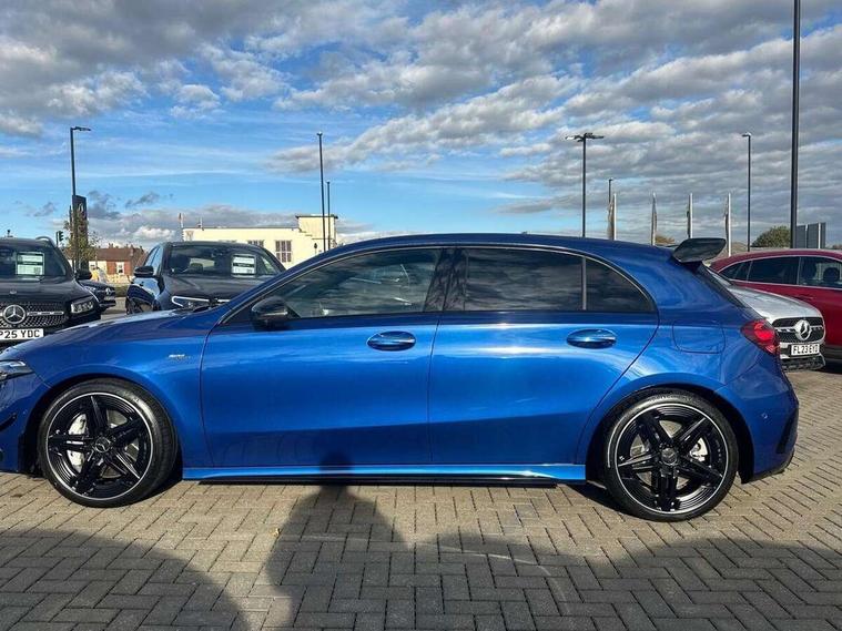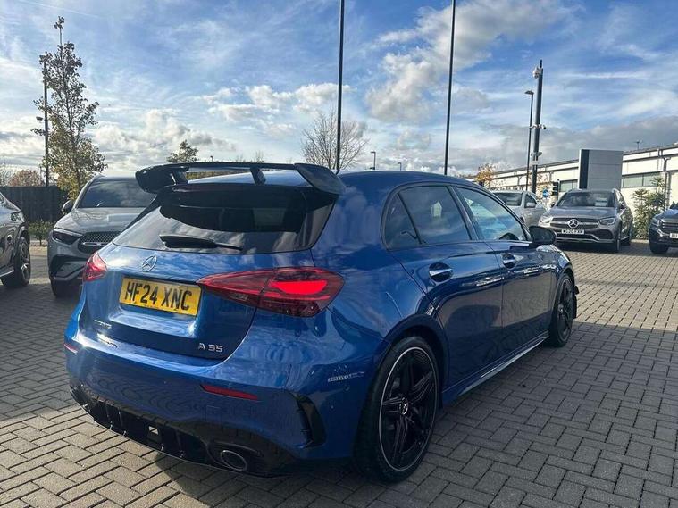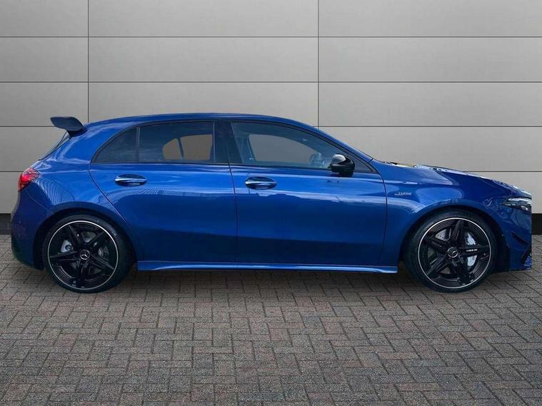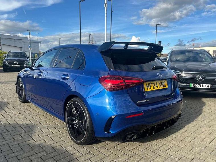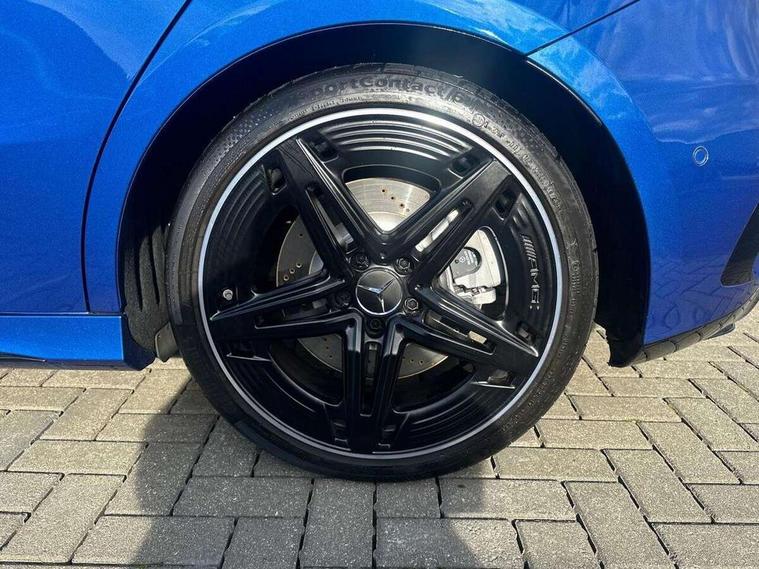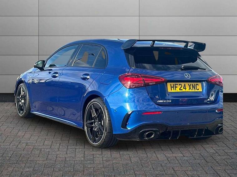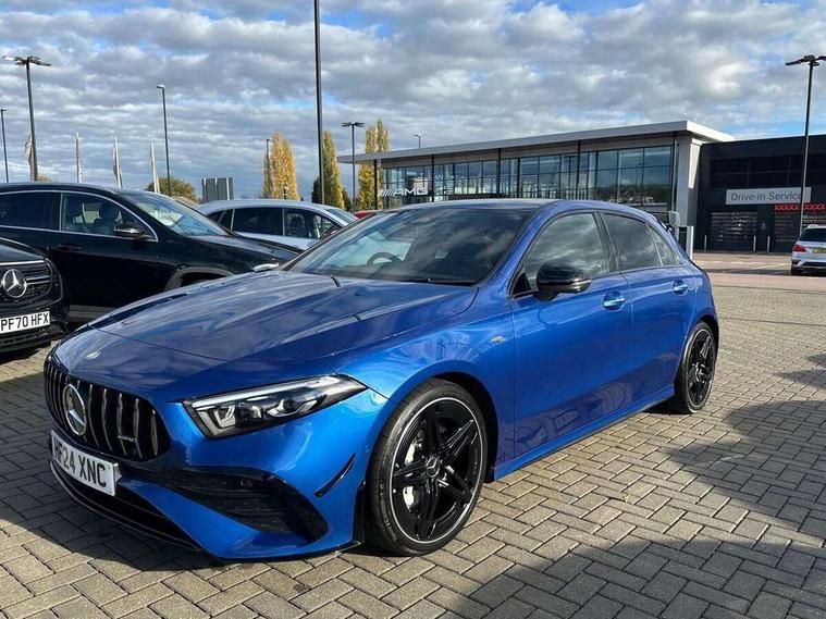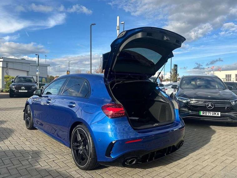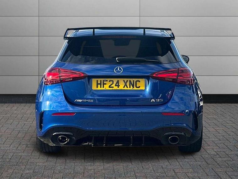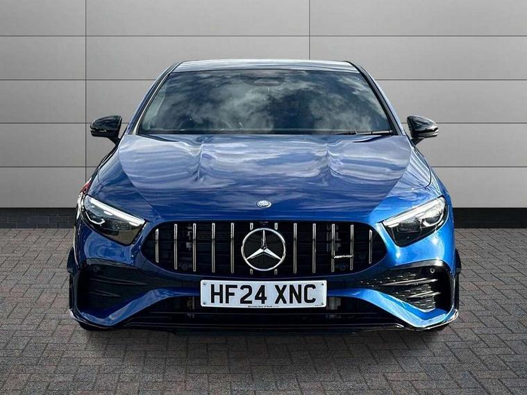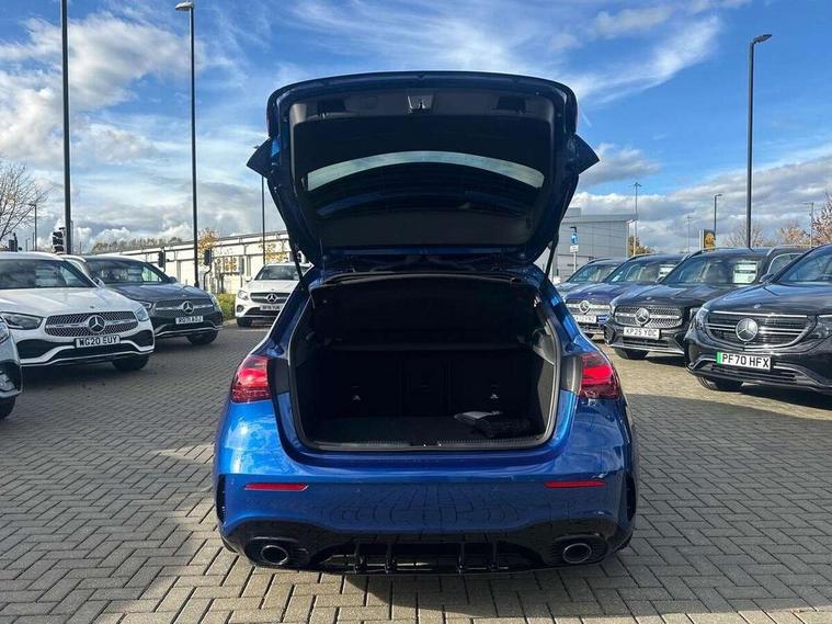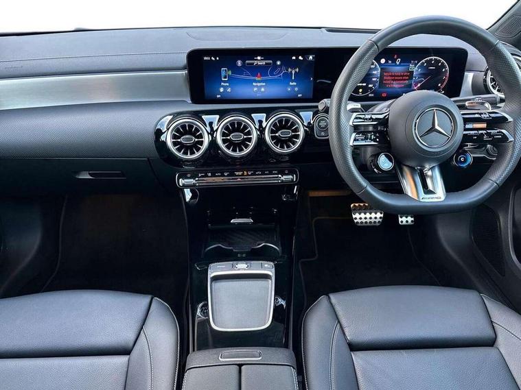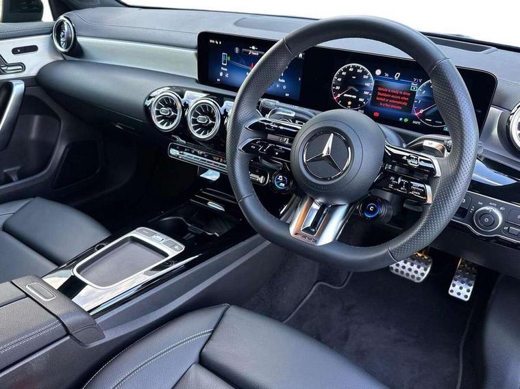 10.25 inch touchscreen central media display, 10.25" Digital instrument cluster display screen, Attention assist, Brake pad wear indicator warning light, Car wash mode, Direct steering, Direction indicators with lane change function, Dual bluetooth interfaces, DYNAMIC SELECT with driving programs (Slippery, Comfort, Sport, Sport+ and Individual), Easy pack tailgate hands-free access, ECO start/stop function, Engine start/stop button, Fluid level warning indicator for fuel, oil, coolant and washer fluid, Fluorescent jacket for driver, Hard-disk navigation, Head up Display, Hey Mercedes Voice activation, Lamp failure indicator, MBUX augmented reality for navigation, MBUX Interior assistant, Mercedes me connect including emergency call system, accident recovery, breakdown and maintenance management, Mercedes me remote services, Outside temperature gauge, Owners manual in English, Pre-installation of private car share, Preinstallation for Mercedes Benz link, Remote boot closing, Service indicator (ASSYST), Smartphone integration with Apple CarPlay and Android auto, Speed sensitive power steering, Tailgate, Traffic sign assist, Trip computer in multifunction display with current consumption indicator, Wireless charging, AMG suspension, Suspension with adaptive damping system, DAB Digital radio, MBUX multimedia system, Mercedes Benz advanced sound system (225 W) with 10 speakers, 1 central speaker, speakers on doors, a tweeter on door, one sub woofer + boost amplifier, 4 Electric Front and Rear windows, Adaptive brake lights, AMG body styling - AMG front apron with front splitter and AMG rear apron and visible exhaust tailpipe trim elements, AMG Front apron with flics as air deflector elements on the outer air intakes, AMG radiator grille with twin blade lamella and AMG Lettering, AMG Rear apron with specific diffuser look with four vertical fins and two round chrome plated tailpipe trim elements with a diameter of 90 mm, AMG spoiler lip on roof, Beltline strips in High gloss Black, Body colour bumpers, Body colour door handles with chrome inserts, Body colour side skirt, Electric adjustable and heated door mirrors with integrated LED side indicators, Front splitter and trim elements on the louvres in the outer air inlets, Front wings wheel arches with TURBO 4MATIC lettering, Headlamp assist automatic headlamp activation, Heat insulating dark tinted rear and rear side windows, Heated glass rear windscreen + timer control, LED daytime running lights, LED High level third brake light, LED tail lamp, Multibeam LED headlamps with adaptive highbeam assist and cornering function, Panoramic sliding sunroof, Privacy glass, Radio aerial, Rain sensing windscreen wipers with two sensitivity settings, Rear fog lights, Rear side wing doors, Rear windscreen wiper, Surround lighting with logo projection, Wider wheel arches for AMG wheels, Window line trim strip in black, 3 seat bench in 2nd row, 40:20:40 split folding rear seats, Air conditioning - Two zone thermotronic luxury automatic climate control with display, AMG floor mats, AMG Performance steering wheel in nappa leather, Automatic child seat recognition sensor, Black air vents with surround in silver chrome, Black roof lining, Brushed stainless steel sports pedals with rubber studs, Electrically adjustable front memory seats including lumbar support and backrest inclination, Front centre armrest with stowage, Front seat backs luggage nets, Heated front seats, Height/reach adjustable steering column, Illuminated AMG front door sills with changeable cover, Interior lighting - 64 colour Ambient lighting, Interior mirror with reading lamps in black and frameless, Rear armrest with 2 cupholders, Seat occupancy sensor for front passenger seat, Silver coloured aluminium gear shift paddles on steering wheel, Single front passenger seat, Sports seats with integrated headrests, Stowage compartment in centre console with retractable cover, Sunvisors with illuminated vanity mirrors, Twin front cupholders, Aerodynamic pack - A Class, AMG night pack - A Class, Light and sight pack - A Class, Mirror package - A Class, Parking pack with 360 degree camera - A Class, Seat comfort pack - A Class, USB pack plus - A Class, 3 rear 3 point seatbelts, ABS with Brake Assist, Active bonnet, Adaptive brake assist with hold function and hill start assist, Black seatbelts, Bonnet with power domes, Childproof locks manually operated for rear doors and electrically operated for rear power windows, Crash responsive emergency lighting, Driver and passenger head and side airbags, Drivers knee airbag, Dual stage driver/passenger airbags, Electronic parking brake, ESP curve dynamic assist, ESP with ASR, Exit warning, Front and rear seatbelt reminder, Front brake calipers with AMG lettering, ISOFIX and top tether child seat fixing points in two outer rear seats, Tyre pressure monitoring system, Warning triangle and first aid kit, Window airbags, Alarm system/interior protection/immobiliser, Guard 360 degree vehicle protection, Keyless entry lock/unlock, Keyless Go, Remote central locking and crash sensor with emergency opening function, Light longitudinal grain aluminium trim, 19" AMG 5 twin spoke light alloy wheels aerodynamically optimised painted in matt black with high sheen rim flange, Summer tyres, Tirefit sealant kit,