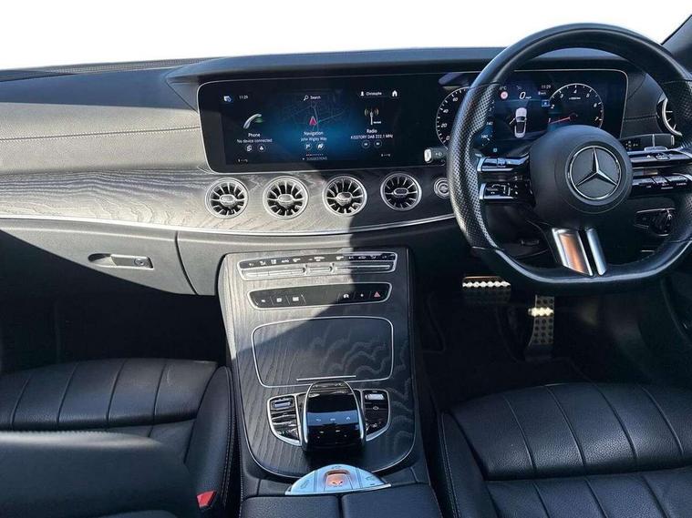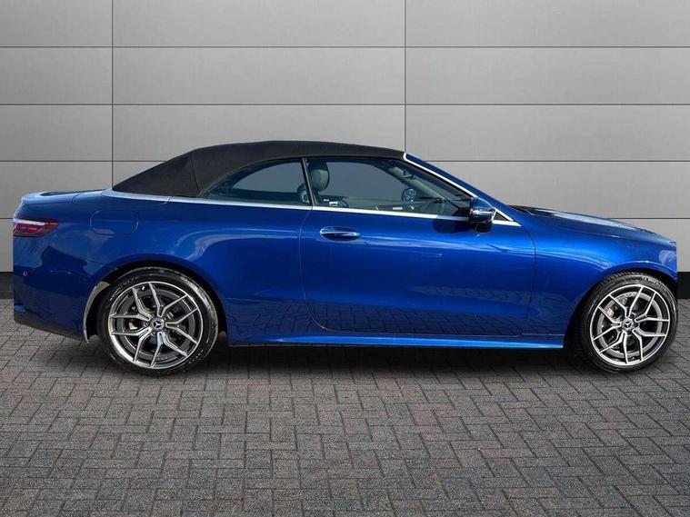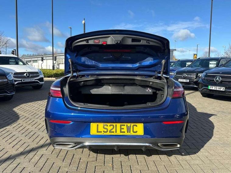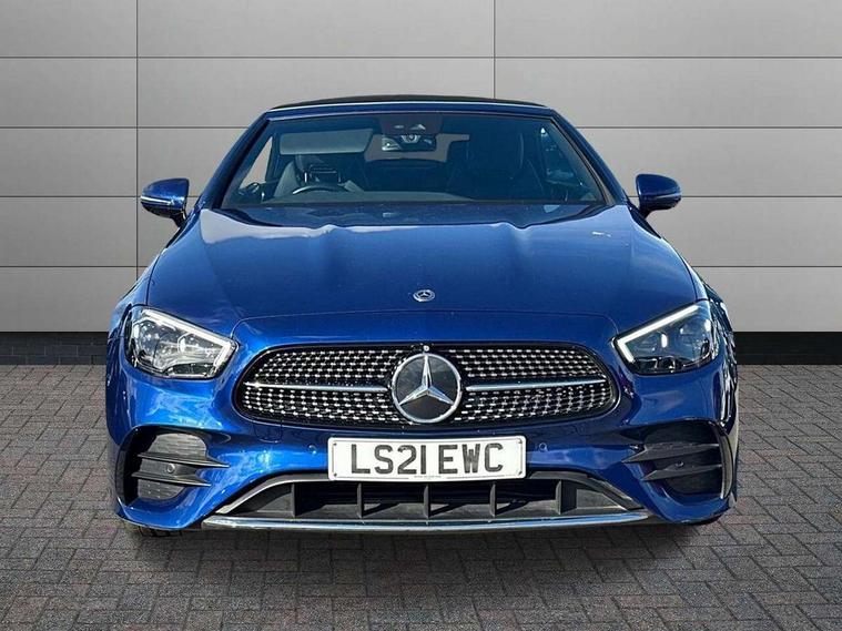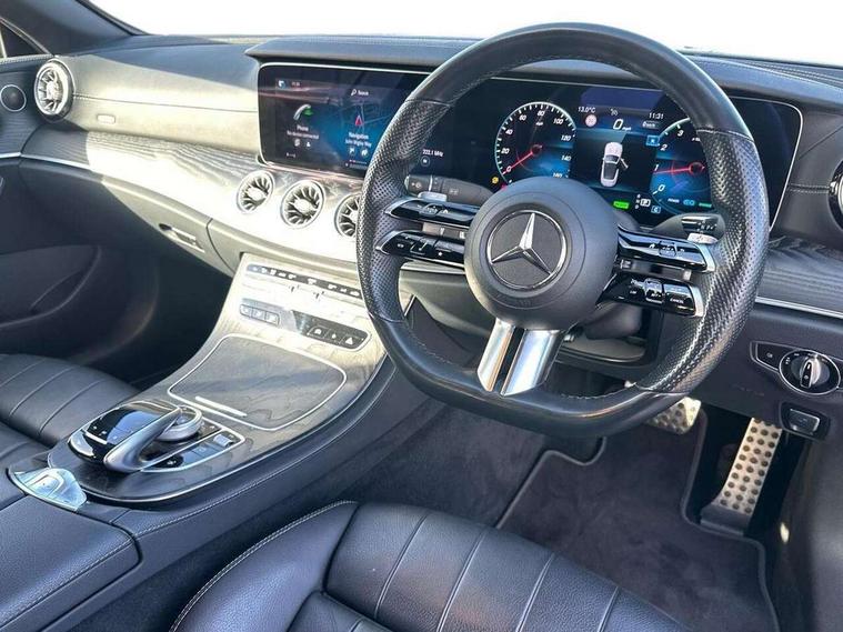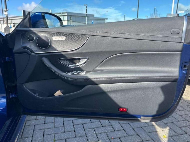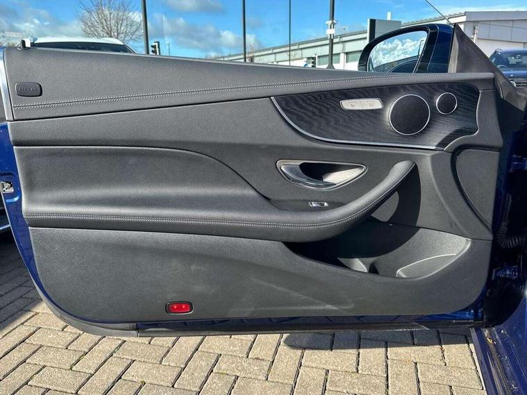 360 degree parking camera, Active parking assist including front and rear parking sensors, Analogue clock, Attention assist, Automatic boot separator, Blind spot assist, Brake wear warning display, Cockpit display 12.3" widescreen digital instrument cluster, Collision prevention assist plus, Cruise control with variable speed limiter, Direct steer speed sensitive steering, DYNAMIC SELECT with a choice of driving modes (ECO, Comfort, Sport, Sport+ and Individual), ECO start/stop function, Hey Mercedes Voice activation, High resolution 12.3" multimedia colour display, MBUX augumented reality for navigation, Mercedes connect me, Outside temperature display, Pre-installation for Vehicle Monitoring, Pre-installation for Vehicle Setup, Remote boot release, Service indicator (ASSYST), Status display for rear seat belts in instrument cluster, Touchpad with controller, Traffic sign assist, Trip computer in multifunction display showing current fuel consumption, Wireless charging, 66 litre fuel tank, 9G TRONIC 9 speed automatic transmission, Agility control sports suspension with selective damping system, 2 USB ports in centre console, 2 USB ports in the rear, MBUX multimedia system with DAB digital radio and touchpad including satellite navigation, Smartphone integration via Android Auto/Apple CarPlay, Media Interface, USB and Bluetooth interface and touchpad with control wheel, Acoustic soft-top with enhanced climate and noise comfort, Adaptive brake lights, AIRCAP wind deflector and draught stop, AMG bodystyling front and rear aprons in polished aluminium, AMG boot lid spoiler in body colour, Body colour door handles, Body coloured bumpers, Electric windows with one touch opening/closing and obstruction sensors, Exterior mirrors heated and electronically adjustable, Illuminated front door sill panels with Mercedes-Benz lettering, Magic Vision Control heated windscreen wiper system, Multibeam LED Intelligent Light System with Adaptive Highbeam Assist, Radiator grille with integral star and 2 louvres in matt iridium silver with chrome trim, Radio aerial integrated into rear window, Rain sensing windscreen wipers, Rear LED lights, Top surround of side windows in polished aluminium, Visible twin pipe exhaust system integrated into bumper, Waistline in polished aluminium, 3-spoke flat bottom multifunction AMG steering wheel with Touch Control buttons, trimmed in black nappa leather, 50/50 split folding rear seat, Airscarf - neck level heating, Artico man-made leather upper dashboard and beltlines with contrast stitching, Automatic child seat recognition sensor, Belt feeder driver and front passenger seat belt automatically positioned within easier reach, Black door pins, Black roof lining, Central stowage compartment with 12 V socket in centre console, Central stowage compartment with USB socket for use with Android Auto and Apple CarPlay, Centre armrest and door handle illumination, Floor mats with AMG lettering, Front and rear door pockets, Front centre armrest with stowage compartment, Front footwell lights, Glasses compartment in overhead control panel, Glove compartment - lockable, air conditioned and illuminated, Head restraints for driver and front passenger (four-way adjustability) and in rear (two-way), Heated front seats, Interior lighting - 64 colour Ambient lighting, Interior rear light/integral reading lights, Isofix rear child seat fastenings, Leather upholstery, Multi contour front sports seats, Seat occupancy sensor for front passenger seat, Sports pedals in brushed stainless steel with black rubber studs, Steering column manually adjustable for height and reach, Steering wheel gearshift paddles, Sunvisors with illuminated vanity mirrors, THERMOTRONIC automatic climate control system with 3 climate zones, Keyless Go comfort pack - E Class, Mirror pack - E Class, Seat comfort pack - E Class, Stowage pack - E Class, 2 x 3-point rear seatbelts, Active bonnet pedestrian safety measure which detects an impact and raises bonnet, Active brake assist, Adaptive brake system with HOLD function and brake drying in the wet, Adaptive driver and front passenger airbags, Airbags - sidebag for driver and front passenger with combined thorax/pelvis bag, Anti-lock braking system (ABS), Drivers knee airbag, Electric parking brake, Electronic Stability Programme, Front and rear window airbags, Head airbags, Hill hold function, Perforated front brake discs with "Mercedes-Benz" lettering, Pre-Safe anticipatory safety system, Seatbelt warning, Tyre pressure monitoring system, Warning triangle and first aid kit, Alarm system/interior protection/immobiliser, Central locking with interior switch, automatic locking and crash sensor with emergency opening function, Chrome surround in electric key, Keyless Go starting function, Black open pore ash wood trim and centre console in black open pore ash wood, 19" AMG 5 twin spoke alloy wheels in tantalite grey with high sheen finish (RZI), Run flat tyres,