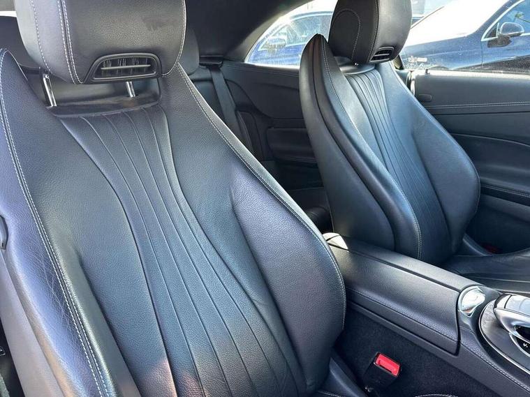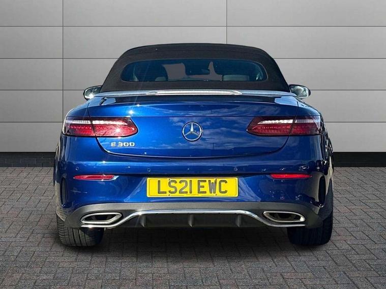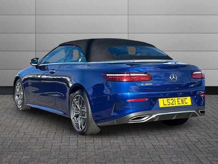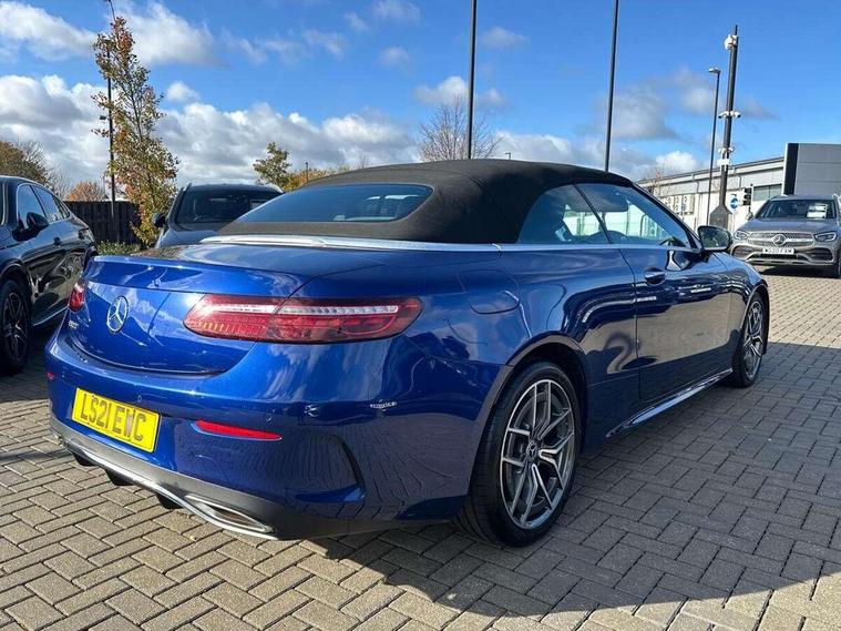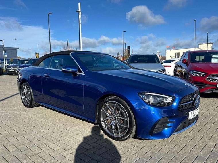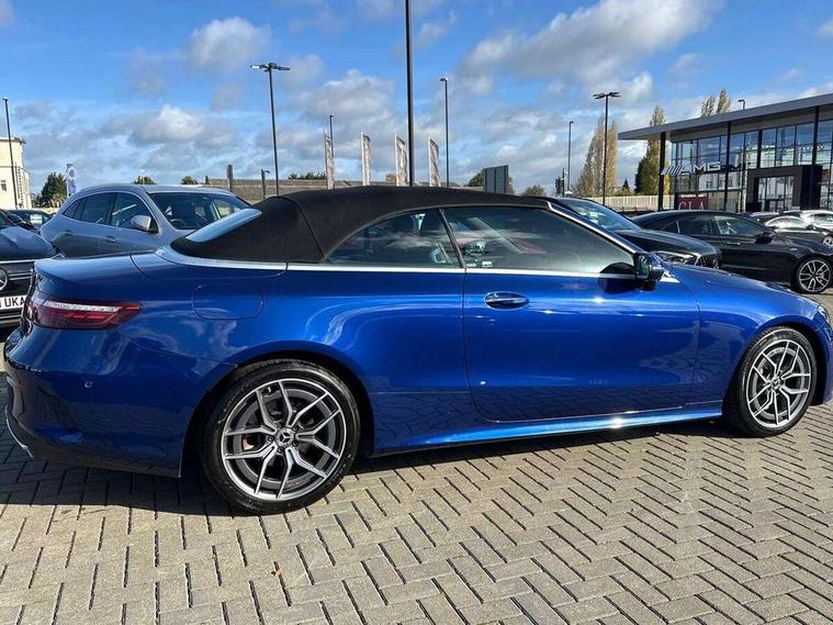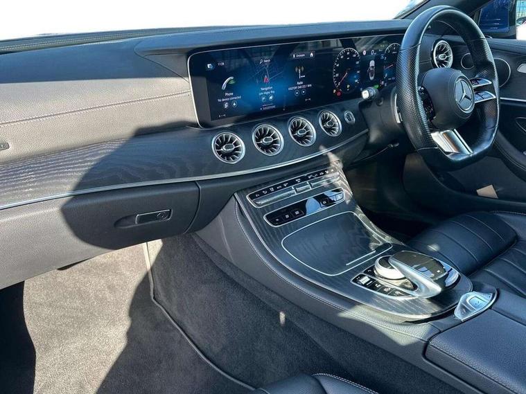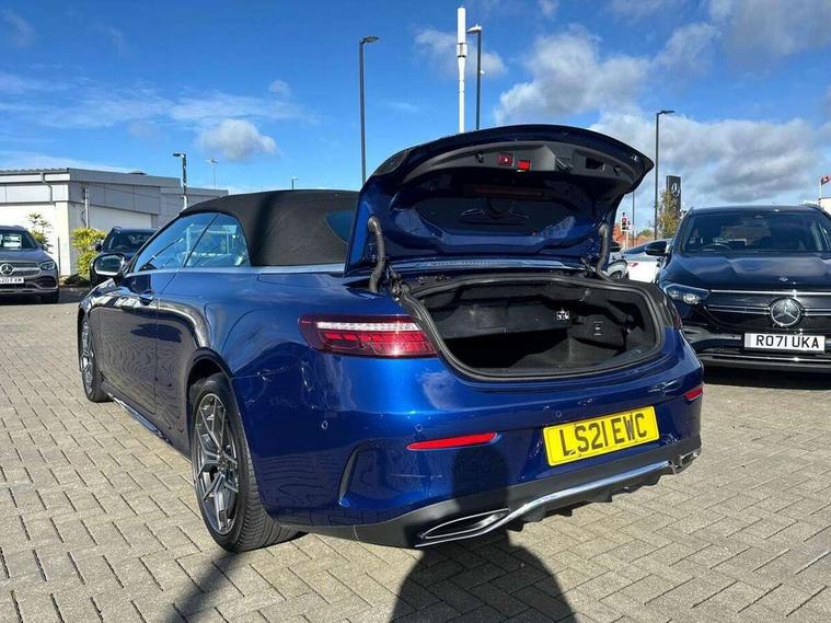 360 degree parking camera, Active parking assist including front and rear parking sensors, Analogue clock, Attention assist, Automatic boot separator, Blind spot assist, Brake wear warning display, Cockpit display 12.3" widescreen digital instrument cluster, Collision prevention assist plus, Cruise control with variable speed limiter, Direct steer speed sensitive steering, DYNAMIC SELECT with a choice of driving modes (ECO, Comfort, Sport, Sport+ and Individual), ECO start/stop function, Hey Mercedes Voice activation, High resolution 12.3" multimedia colour display, MBUX augumented reality for navigation, Mercedes connect me, Outside temperature display, Pre-installation for Vehicle Monitoring, Pre-installation for Vehicle Setup, Remote boot release, Service indicator (ASSYST), Status display for rear seat belts in instrument cluster, Touchpad with controller, Traffic sign assist, Trip computer in multifunction display showing current fuel consumption, Wireless charging, 66 litre fuel tank, 9G TRONIC 9 speed automatic transmission, Agility control sports suspension with selective damping system, 2 USB ports in centre console, 2 USB ports in the rear, MBUX multimedia system with DAB digital radio and touchpad including satellite navigation, Smartphone integration via Android Auto/Apple CarPlay, Media Interface, USB and Bluetooth interface and touchpad with control wheel, Acoustic soft-top with enhanced climate and noise comfort, Adaptive brake lights, AIRCAP wind deflector and draught stop, AMG bodystyling front and rear aprons in polished aluminium, AMG boot lid spoiler in body colour, Body colour door handles, Body coloured bumpers, Electric windows with one touch opening/closing and obstruction sensors, Exterior mirrors heated and electronically adjustable, Illuminated front door sill panels with Mercedes-Benz lettering, Magic Vision Control heated windscreen wiper system, Multibeam LED Intelligent Light System with Adaptive Highbeam Assist, Radiator grille with integral star and 2 louvres in matt iridium silver with chrome trim, Radio aerial integrated into rear window, Rain sensing windscreen wipers, Rear LED lights, Top surround of side windows in polished aluminium, Visible twin pipe exhaust system integrated into bumper, Waistline in polished aluminium, 3-spoke flat bottom multifunction AMG steering wheel with Touch Control buttons, trimmed in black nappa leather, 50/50 split folding rear seat, Airscarf - neck level heating, Artico man-made leather upper dashboard and beltlines with contrast stitching, Automatic child seat recognition sensor, Belt feeder driver and front passenger seat belt automatically positioned within easier reach, Black door pins, Black roof lining, Central stowage compartment with 12 V socket in centre console, Central stowage compartment with USB socket for use with Android Auto and Apple CarPlay, Centre armrest and door handle illumination, Floor mats with AMG lettering, Front and rear door pockets, Front centre armrest with stowage compartment, Front footwell lights, Glasses compartment in overhead control panel, Glove compartment - lockable, air conditioned and illuminated, Head restraints for driver and front passenger (four-way adjustability) and in rear (two-way), Heated front seats, Interior lighting - 64 colour Ambient lighting, Interior rear light/integral reading lights, Isofix rear child seat fastenings, Leather upholstery, Multi contour front sports seats, Seat occupancy sensor for front passenger seat, Sports pedals in brushed stainless steel with black rubber studs, Steering column manually adjustable for height and reach, Steering wheel gearshift paddles, Sunvisors with illuminated vanity mirrors, THERMOTRONIC automatic climate control system with 3 climate zones, Keyless Go comfort pack - E Class, Mirror pack - E Class, Seat comfort pack - E Class, Stowage pack - E Class, 2 x 3-point rear seatbelts, Active bonnet pedestrian safety measure which detects an impact and raises bonnet, Active brake assist, Adaptive brake system with HOLD function and brake drying in the wet, Adaptive driver and front passenger airbags, Airbags - sidebag for driver and front passenger with combined thorax/pelvis bag, Anti-lock braking system (ABS), Drivers knee airbag, Electric parking brake, Electronic Stability Programme, Front and rear window airbags, Head airbags, Hill hold function, Perforated front brake discs with "Mercedes-Benz" lettering, Pre-Safe anticipatory safety system, Seatbelt warning, Tyre pressure monitoring system, Warning triangle and first aid kit, Alarm system/interior protection/immobiliser, Central locking with interior switch, automatic locking and crash sensor with emergency opening function, Chrome surround in electric key, Keyless Go starting function, Black open pore ash wood trim and centre console in black open pore ash wood, 19" AMG 5 twin spoke alloy wheels in tantalite grey with high sheen finish (RZI), Run flat tyres,