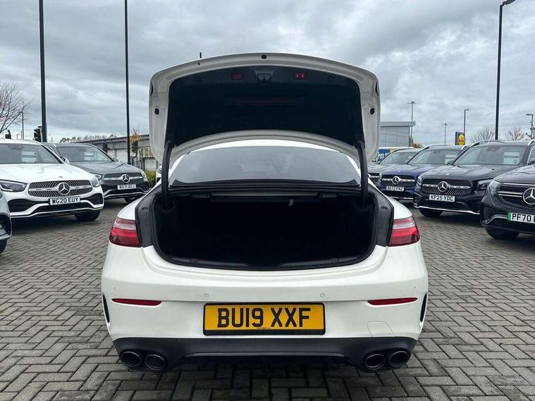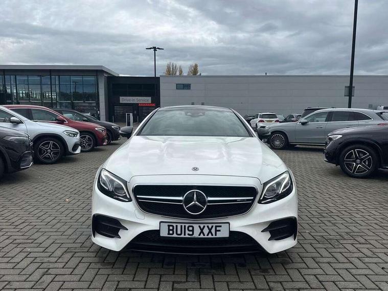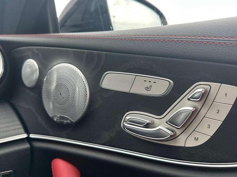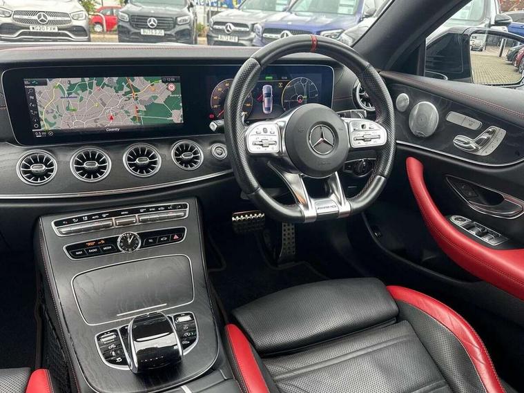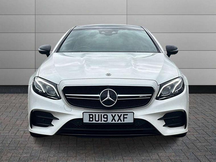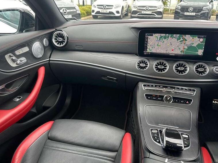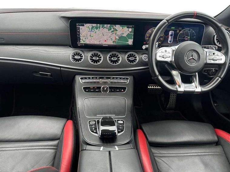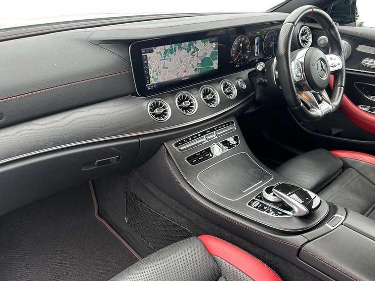 360 degree parking camera, Active parking assist including front and rear parking sensors, AMG DYNAMIC SELECT with a choice of driving modes (ECO, Comfort, sport, sport+ and Individual), Analogue clock, Attention assist, Blind spot assist, Bluetooth interface for hands free telephone, Brake wear warning display, Cockpit display 12.3" widescreen digital instrument cluster, Collision prevention assist plus, COMAND online HDD navigation with Radio/Media interface, linguatronic + smartphone integration/Apple CarPlay/Android Auto and 12.3" Cockpit display, Direct steering, ECO start/stop function, Engine start/stop button, Instrument cluster with AMG menu including RACETIMER and AMG start-up display, Mercedes connect me, Multi function trip computer, Outside temperature display, Remote boot release, Service indicator (ASSYST), Status display for rear seat belts in instrument cluster, Touchpad with control wheel, Traffic sign assist, Wireless charging, 66 litre fuel tank, AMG ride control+ sports suspension based on Air body control air suspension with Adaptive damping system, EQ Boost starter alternator, 2 USB ports in centre console, DAB Digital radio, Smartphone integration via Android Auto/Apple CarPlay, Media Interface, USB and Bluetooth interface and touchpad with control wheel, Adaptive brake lights, AMG bodystyling front and rear aprons, side skirts, AMG boot lid spoiler in body colour, AMG front, rear apron and side skirts, Badging BITURBO 4MATIC+ lettering on front wings, Body colour door handles, Body coloured bumpers, Chrome pins diamond radiator grille with integrated stars, Electric windows with one touch opening/closing and obstruction sensors, Exterior mirrors heated and electronically adjustable, Illuminated front door sill panels with "AMG" lettering, Magic Vision Control heated windscreen wiper system, Multibeam LED Intelligent Light System with Adaptive Highbeam Assist, Pre-installation for roof rail systems, Privacy glass Includes rear side windows and rear windscreen, Rain sensing windscreen wipers, Rear LED lights, Top surround of side windows in polished aluminium, Visible two twin pipe exhaust system integrated into the bumper, 3-spoke flat bottom steering wheel in silver chrome trim with "AMG" lettering, aluminium gearshift paddles, 12 o'clock mark and Touch Control buttons, 4 way adjustable front head restraints and 2 way rear head restraints, 40:20:40 split folding rear seats, Aluminium gear shift paddles, AMG sports seats, Artico man-made leather upper dashboard and beltlines with contrast stitching, Automatic child seat recognition sensor, Automatic two zone climate control, Bag hook in luggage compartment, Belt feeder driver and front passenger seat belt automatically positioned within easier reach, Black roof lining, Central stowage compartment with USB socket for use with Android Auto and Apple CarPlay, Centre armrest and door handle illumination, Chrome door pins, Easy entry seats, Electric height/reach adjustable steering column, Floor mats with AMG lettering, Front and rear door pockets, Front centre armrest with stowage compartment, Front footwell lights, Glasses compartment in overhead control panel, Glove compartment - lockable, air conditioned and illuminated, Heated front seats, Interior lighting - 64 colour Ambient lighting, Interior rear light/integral reading lights, Isofix rear child seat fastenings, Multi function steering wheel, Nappa leather upholstery, Rear centre armrest with 2 cupholders + storage, Seat occupancy sensor for front passenger seat, Sports pedals in brushed stainless steel with black rubber studs, Steering column electrically adjustable for height and reach, Steering wheel gearshift paddles, Steering wheel touch control buttons for audio and onboard settings, Storage net in luggage compartment, Sunvisors with illuminated vanity mirrors, Twin front cupholders, Memory pack - E Class, Mirror pack - E Class, Stowage pack - E Class, Active bonnet, Active brake assist, Adaptive brake system, Adaptive driver and front passenger airbags, Anti-lock braking system (ABS), Crash sensor (auto door unlocking), Drivers knee airbag, Electric parking brake, Electronic Stability Programme, Front and rear window airbags, Front seatbelt pretensioners, Front side airbags, Head airbags, Hill hold function, Perforated front brake discs and anodised silver brake calipers with "AMG" lettering, Red seat belts, Seatbelt warning, Three point rear seat belts, Tyre pressure monitoring system, Warning triangle and first aid kit, Alarm system/interior protection/immobiliser, Central locking with interior switch, automatic locking and crash sensor with emergency opening function, Chrome surround in electric key, Keyless entry go starting function, Black open pore ash wood, Open pore black ash wood centre console, TIREFIT with tyre inflation compressor,