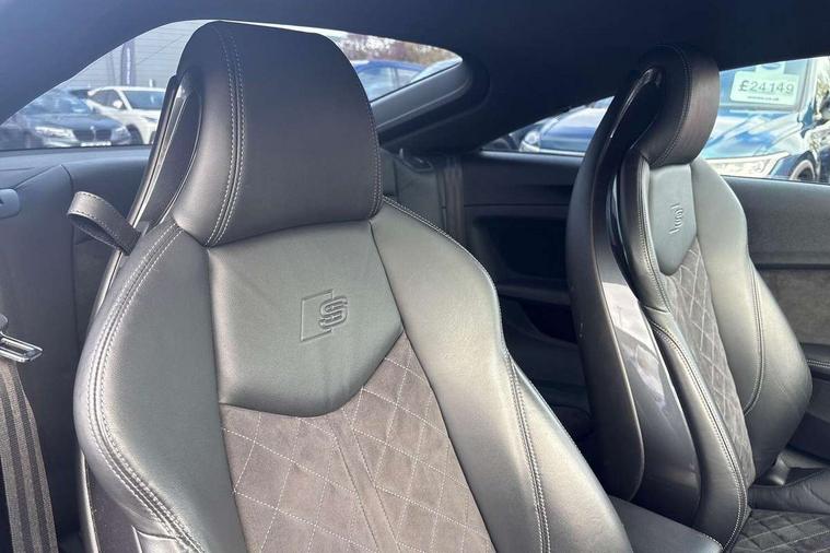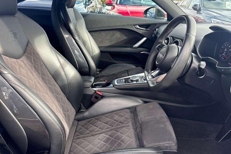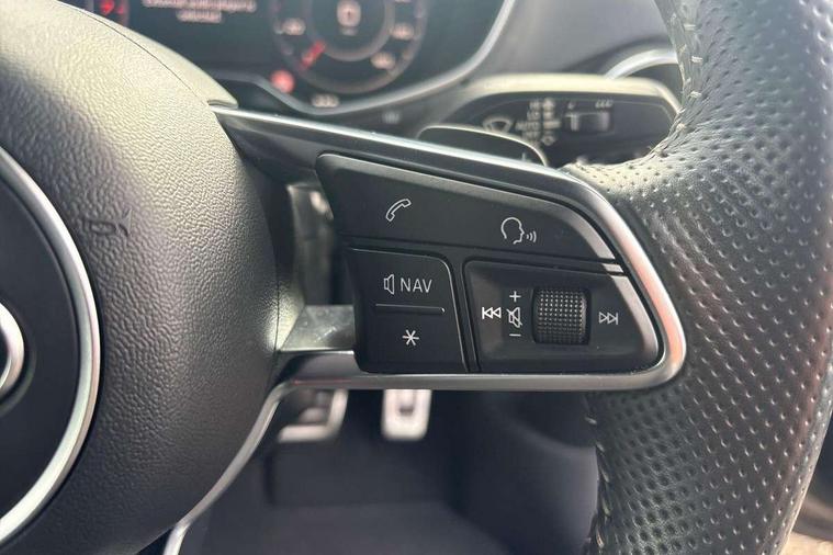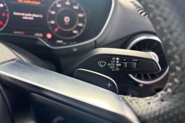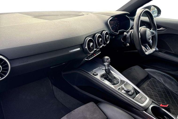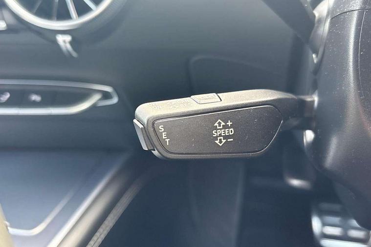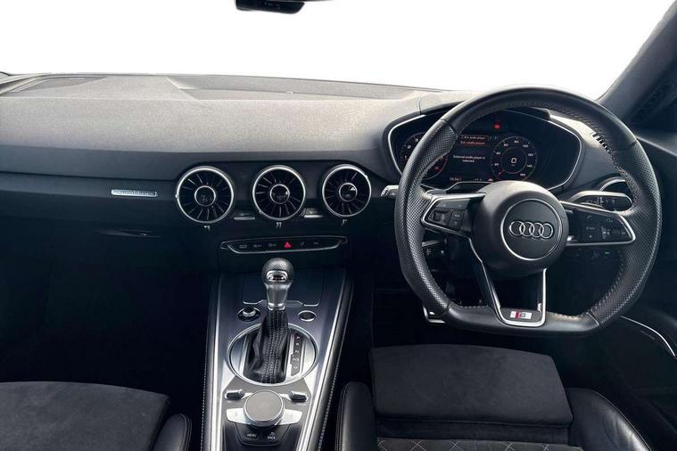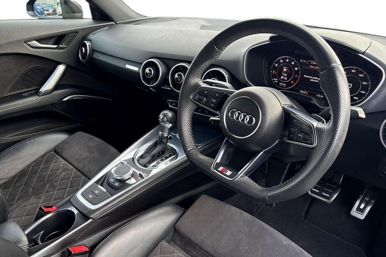 Audi active lane assist, Audi drive select with 4 Pre configured modes, Cruise control + speed limiter, MMI touch panel, Progressive power assisted steering, Rear parking sensors, Service interval indicator, Start/Stop system with energy recuperation, TP memo, 8 speakers, AM/FM radio, Audi music interface, Bluetooth audio streaming, DAB Digital radio, MMI Radio with CD player and SD/XC card slot, Auto dimming rear view mirror, Auto headlight range control, Body colour bumpers, Dynamic rear indicators, Electric front windows, Front fog lights, Green tinted heat insulating glass, Headlight wash system, High gloss black radiator grille, LED daytime running lights, Light and rain sensors, Retractable rear spoiler, S line badges on front wings, S Line body styling, S Line front and rear bumpers, S line rear diffuser with platinum grey insert, S line sill plates, Sunband for windscreen, 12V socket, 3 spoke flat bottomed high multi-function leather sport steering wheel with gearshift paddles, 4 way electric lumbar support for driver and front passenger, Black headlining, Door sill trims with S line logo, Extended aluminium look with stainless steel pedals, Front centre armrest, Front super sports seats, Heated front seats, Height adjustable driver's seat, Height adjustable front head restraints, Height/reach adjust steering wheel, ISOFIX child seat mounting for front passenger seat with airbag deactivation, Perforated leather gearknob, Rear top tether child seat ISOFIX attachment, S Line badge on steering wheel, Split folding rear seat, Tool kit, Top tether anchor plate for isofix child seat, Non smoking pack - TT/TT RS, 3 point front seat belts, ABS, ASR traction control, Brake energy regeneration, Curtain airbags, Driver and front passenger airbag with front passenger airbag deactivation, EDL traction control, Electromechanical parking brake, ESP, First aid kit, Front side airbags, Head airbags, Hill hold assist, Seatbelt warning, Tyre pressure warning, Warning triangle, Anti theft alarm, Anti theft wheel bolts, Immobiliser, Keyless Go, Remote central locking, Matt brushed aluminium inlays, Tyre repair kit,