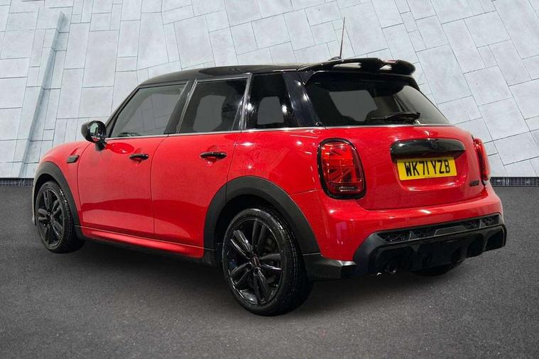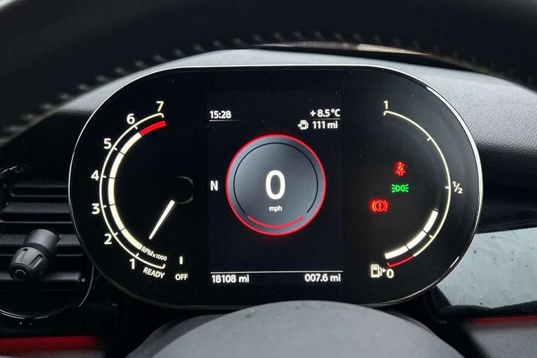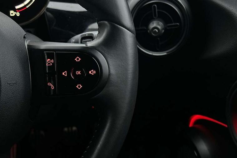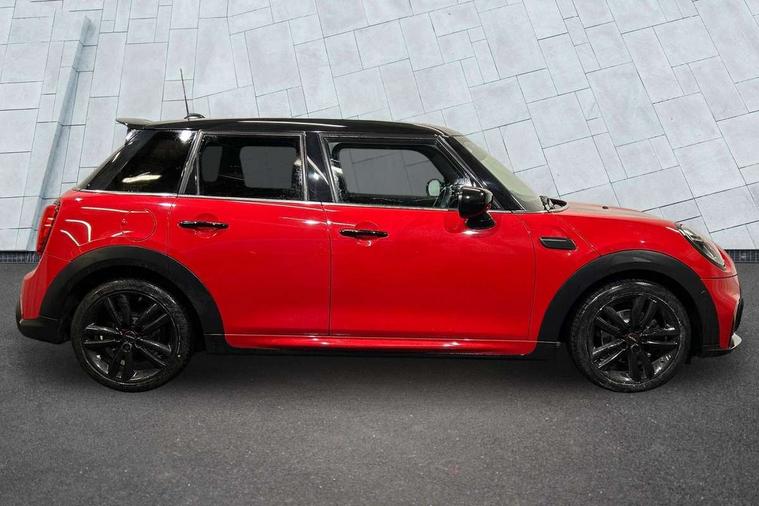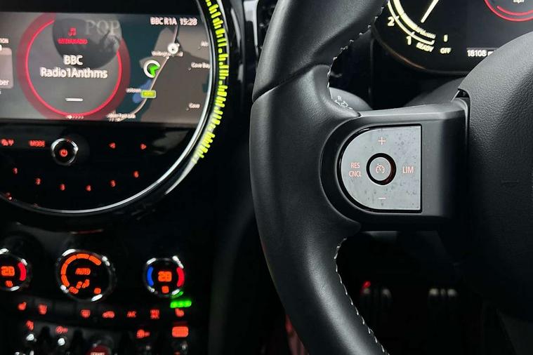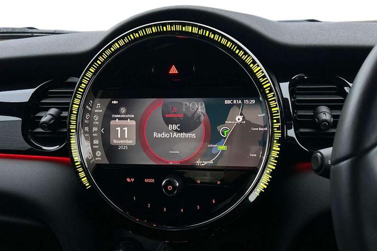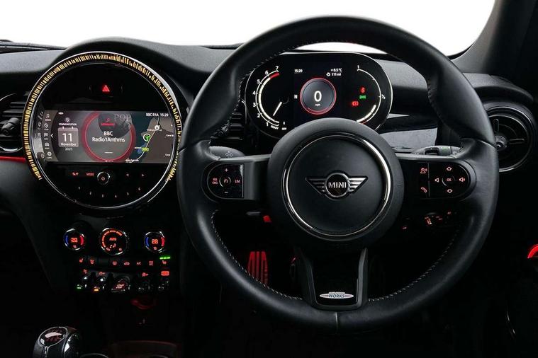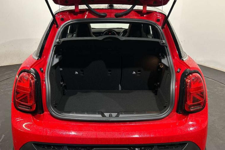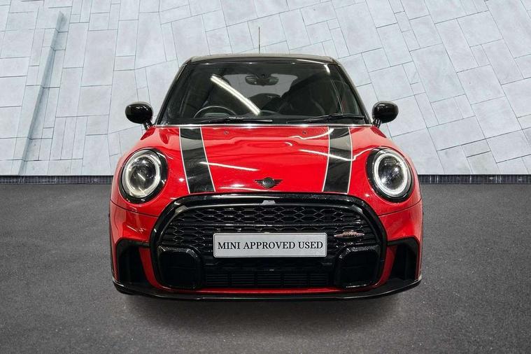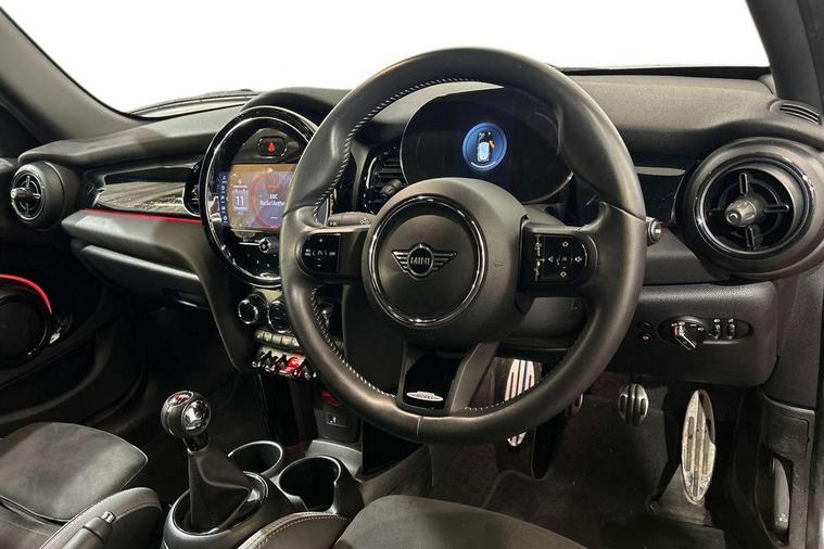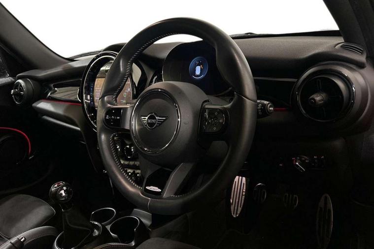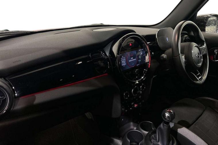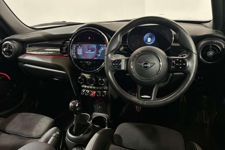 Automatic start/stop function with brake energy recuperation, Compatible mobile phone bluetooth with audio streaming, Cruise control with brake assist, Electro-mechanical speed dependant steering assistance, Flexible car sharing preparation, Instrument cluster, MINI Driving Modes - centre toggle switch to control driving setting (sport, mid and green), Mini E-call, MINI TeleServices, On board computer, Rear park distance control, Service interval indicator, 6 Speed manual transmission including gear change indicator display, Adaptive suspension, Double Vanos system, Fully variable valve control, High precision injection, Performance Control, 6 speakers in front door trims and underneath front seats, 8.8" touchscreen with LED ring, FM tuner and DAB digital radio, Automatic headlight activation switch, Body colour fuel filler cap, Chrome border high gloss black slats radiator grille, Dynamic brake lights, Electric front+rear windows, Exhaust tailpipe on left with chrome finisher, Heated rear window, Heated windscreen washer jets, JCW Aerodynamic kit - Front and rear bumpers with sporty JCW styling and part-painted side sills with MINI John Cooper Works door sill finishers, John Cooper Works rear spoiler, LED headlight with closed ring and daytime driving lights, Metal door sill strips with MINI imprint, Model logo Cooper on right of tailgate, Rain sensor window wipers, Rear fog lights, Rear LED lights with union jack design, Rear window wiper, Side scuttle panel with integrated indicator, Sun/heat protection glass, White indicator lenses, 12V Accessory socket in centre console, 4 lashing eyes in luggage compartment, 60/40 split folding rear seat, Anthracite headliner including grab handles and clothes hooks, Carbon black colour line - Knee roll and door armrest, Chrome interior highlights, Cupholders, Front and rear isofix with front passenger airbag deactivation, Glove compartment, Height and length steering column adjustment, Interior lighting with 12 different colours across the dashboard, underneath door bezel with illuminated laser-engraved design on central display, JCW Sport seats with integrated headrests, adjustable thigh support and John Cooper Works logo, Leatherette gearshift lever and handbrake gaiters, LED reading lights, vanity mirror lights, front foot well light and spotlight on front seats, Manual air conditioning, Mechanical seat adjustment - forward/back & backrest for front seats and driver seat height adjust, Multifunction steering wheel, Storage compartments in doors, Sunvisors with vanity mirrors, Velour floor mats, Walknappa leather steering wheel with grey seam and John Cooper Works badge on Piano Black lower steering wheel spoke, Piano black exterior pack - Mini Hatchback Cooper, 3 point seatbelts on all five seats, 6 Airbags - front, side, head and seat belt tensioners, Anti-lock braking system (ABS), DSC - Dynamic Stability Control, Front and rear disc brakes, Hill start assist, Single tone fanfare horn, Tyre pressure monitoring system, Alarm system with tilt sensor, monitoring doors, bonnet interior and tailgate, Electronic vehicle immobiliser, Start/stop toggle with keyless go, Piano black interior trim, Tool kit,