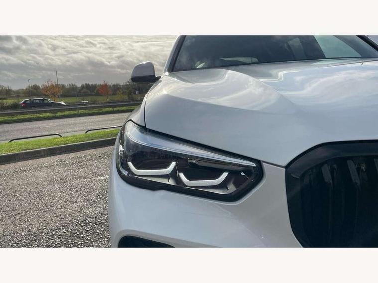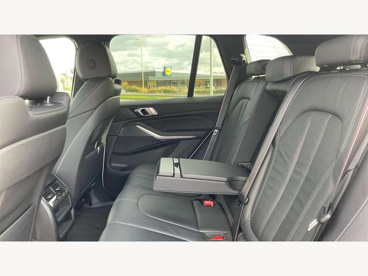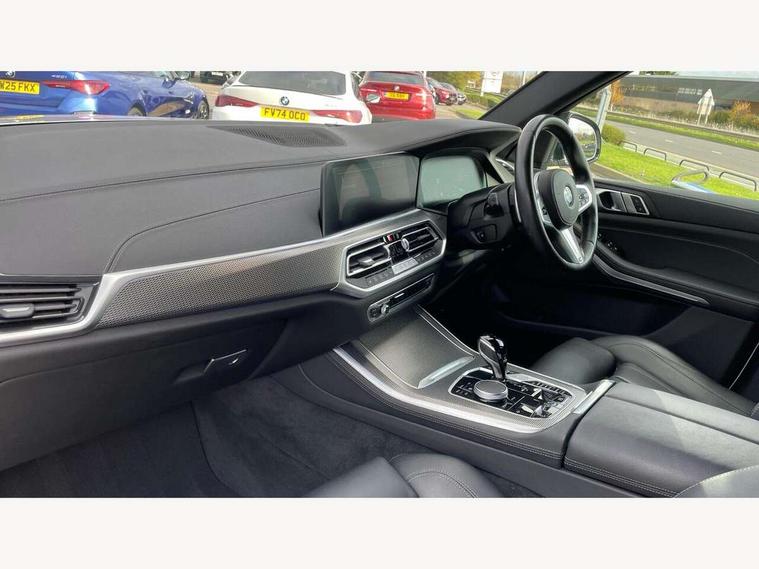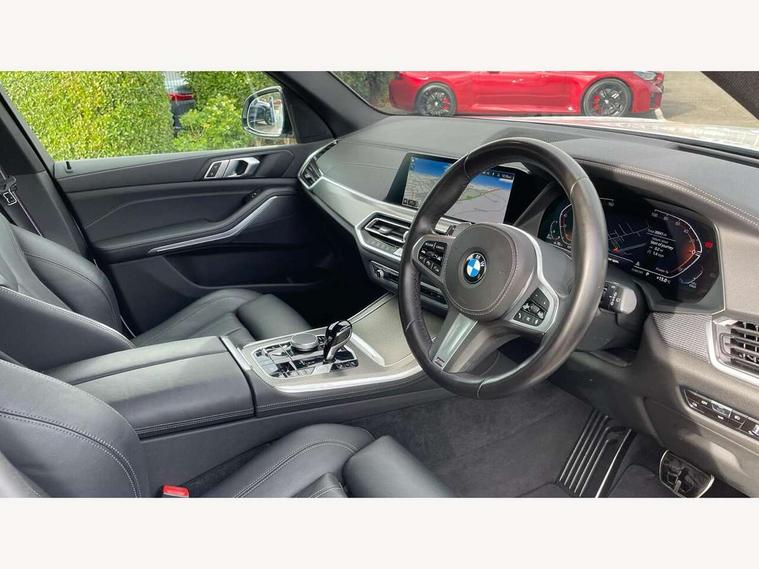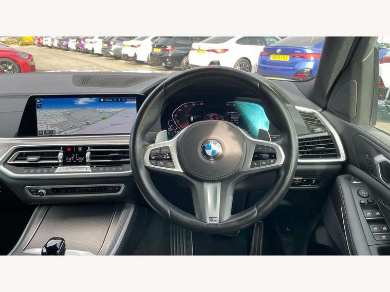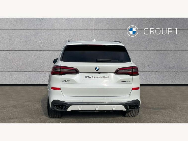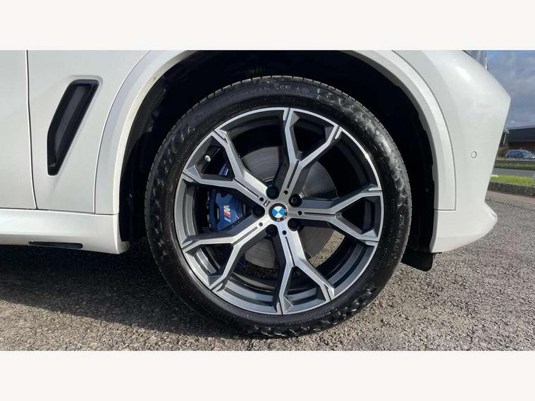 20GB hard disc drive (HDD) memory, Active guard plus, Attentiveness assist, Automatic tailgate with top hinged section open and manual bottom hinged section, BMW ConnectedDrive online services, BMW digital live cockpit professional - 12.3" digital instrument panel and 12.3" CID, with touch/voice command, BMW legal emergency call, BMW Teleservices, Brake force display, Brake pad wear indicator warning light, Cruise control with brake assist, Enhanced bluetooth with wireless charging, Front/rear park distance control, iDrive touch controller with shortcut buttons, Lights on warning, Oil sensor for level and grade, On board computer inc. average speed, fuel consumption, liquid crystal Info display, journey computer, outside temperature display, personal profile, Service interval indicator, Speed limit info display, Speed limiting function, Wi-Fi hotspot, 48V Mild hybrid technology, Adaptive 2-axle air suspension, Common rail technology, Diesel particulate filter, Double wishbone front axle, Drive performance control with ECO PRO comfort + sport mode, Eight speed steptronic sport automatic transmission and gearshift paddles on the steering wheel, Safety battery terminal clamp, Variable vane geometry, DAB Tuner enables digital radio reception, Favourite buttons, Hi-Fi loudspeaker system, USB connection, USB type A 1.5A in cupholder, USB Type C 3A in centre armrest, Active Air Stream kidney grille with high-gloss chrome, Adaptive air flap control bar in high-gloss black, Automatically dimming rear view mirror, BMW Individual high gloss black shadow line roof rails, Body colour bumpers, Body colour door handles, Dynamic brake lights with LED technology, Exhaust tailpipes - single, left and right with Chrome finisher, Follow me home headlight function, Front and rear electric windows with open and close fingertip control, anti trap facility and comfort closing, Heated windscreen washer jets, High beam assistant, High gloss black outer and central air intakes on front bumper with pearlescent chrome finish, High gloss black Side elements, LED daytime running lights, LED rear lights, M aerodynamic body styling, M designation on left and right front side panels, Pearlescent chrome front grille bars, Rain sensor with automatic headlight activation and windscreen wiper control, Rear side wing doors, Satin aluminium side window graphic, Third brake light in rear spoiler, Variable intermittent rear wash/wipe, Welcome light carpet, X5 on left tailgate, xDrive designation on right tailgate, 12V - Power sockets with 2x centre console and 1x luggage compartment, 3 seat bench in 2nd row, 40:20:40 split folding rear seats, Ambient interior lighting with 6 pre-designed selectable lights including dynamic function, Centre and rear interior light, Child seat ISOFIX attachment with rear outer seats includes top tether, Compartment in front of cupholder, Electric front seat adjustment with driver and front passenger memory function, Electrical steering column with adjustable height and length with activation and control on the steering column, Foldable rear centre armrest with 2 cupholders and storage compartment, Front and rear cupholders x 2, Front and rear door pockets, Front and rear door sill inlays with illuminated BMW M designation, Front and rear side armrest integrated into door trim, Front footwell lights, Front reading lights, Light inside glove compartment, Lockable glove compartment, Luggage compartment floor panel with integral storage tray, Luggage compartment lighting, M leather steering wheel, M specific key, M specific steering wheel, M specific velour floor mats, Make-up mirror lights, Multifunction controls for leather steering wheel, Multifunctional hooks, Rear head restraints, Seat back with flap pocket, Securing rings in luggage compartment, Single front passenger seat, Storage bins on all doors, Storage tray and compartment with cover in centre console, Sunvisors with illuminated vanity mirrors, Toolkit located in luggage compartment, Connected Package Professional - X5, Expanded exterior mirror pack - X5/X5 M, Non-smokers pack - X5, Airbags - driver/front passenger, rear and side, first and second row seats head airbags, front passenger seat airbag deactivation + knee airbag, Anti-lock braking system (ABS), Automatic Stability Control (ASC), Brake drying, Brake energy regeneration, Brake fade compensation, Braking pre-tensioning, Cornering brake control (CBC), Crash sensor activating central locking release, hazard warning lights, fuel cut off, interior lighting + activation of safety battery terminal clamp, Deformation zones - front and rear with door reinforcements and bumpers up to 2.5 mph, DSC - Dynamic Stability Control, Dynamic brake control, Dynamic Traction Control - DTC, Electromechanical parking brake with automatic drive away release and auto hold function, Electronic brake force distribution, Front and rear seatbelts with seatbelt stopper, seatbelt tensioner for front and outer rear seats and belt force limiter, Front head restraints with anti-whiplash, Height adjustable front seatbelts, Hill start assistant, Integrated brake system, M Sport braking system in blue high gloss + blue painted brake calipers with M designation, Mechanical child proof lock on rear doors, Passive protection for pedestrians, Seat occupancy detection for driver and passenger side, Side impact protection, Three 3 point inertia reel seatbelts, Two tone horn, Tyre pressure monitoring system, Ventilated front and rear disc brakes, Warning triangle and first aid kit, Closing system with central locking, Driver and front passenger door centre lock switch, Locking wheel bolts, Thatcham 1 alarm system with remote control and engine immobiliser, Start/stop toggle diamond shaped trim finisher in pearl chrome,