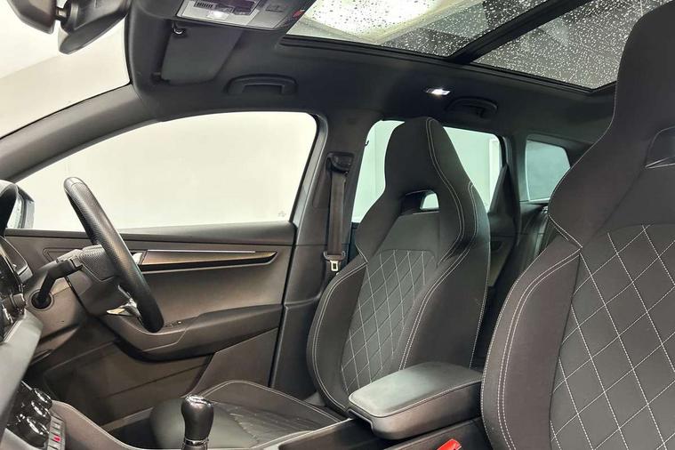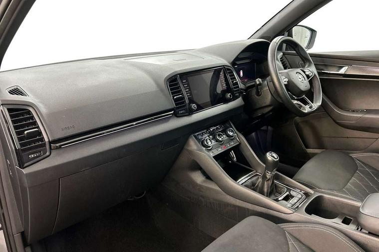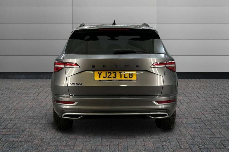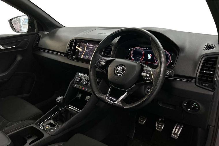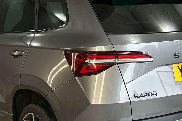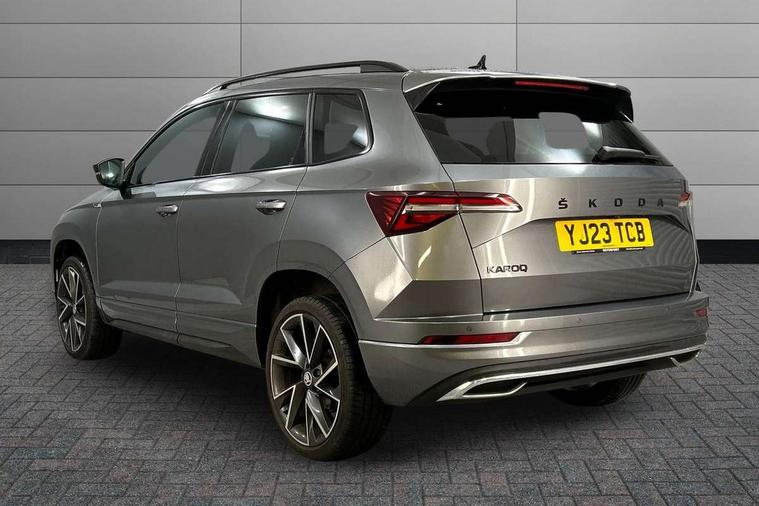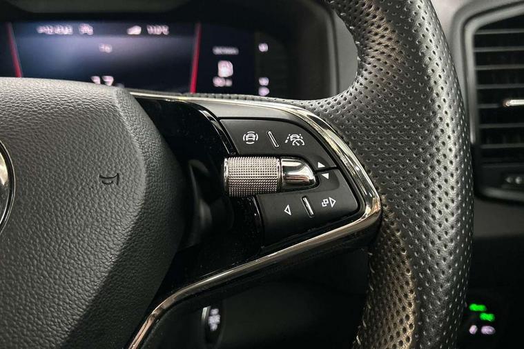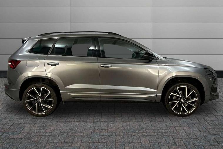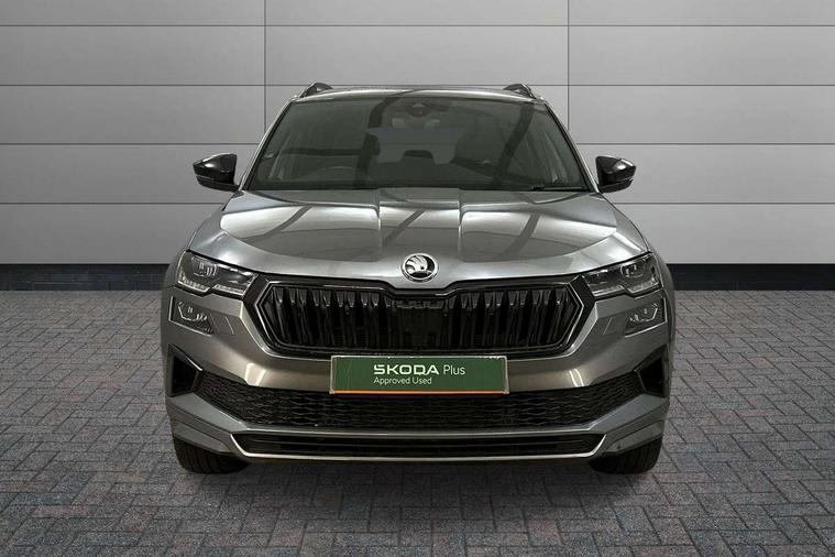 8" Digital display, Care connect, Driver fatigue sensor, Emergency services call system, Outside temperature gauge, Service interval indicator, SmartLink wireless for Apple and wired for Android, Start/stop system with regenerative braking, USB C Port x 2 in front centre console, Virtual cockpit, Virtual pedal with electrically operated boot door, 8 speakers, DAB radio with Bluetooth, USB connection, Wireless charging without wireless aerial connection, Acoustic glass, Aero front windscreen wipers with intermittent function, Auto dimming rear view mirror with light and rain sensors, Black door mirrors, Black electric window control buttons, Black radiator grille, Black roof rails, Body colour door handles, Electric front and rear windows with child proof lock, Front door steps with SportLine logo, Heated rear windscreen, LED daytime running lights, LED rear lights with high functionality welcome effect and dynamic indicators, Light assistant (coming/leaving home/tunnel light), Panoramic sliding sunroof, Plastic scuff plates, Privacy glass, Protective door side sills in body colour, Rear diffuser, Rear side wing doors, Rear spoiler, Rear window wiper with washer system and intermittent control, Safety reflectors on front doors, Skoda lettering on tailgate in black, Sportline badge on front fender, Sportline decorative inserts with badging, Sports front and rear bumpers, 1.5 litre bottle holders in driver and front passenger door panels, 12V socket in boot, 12v socket in front centre armrest with storage compartment and rear air vents, 3 rear height adjustable headrests, 3 seat bench in 2nd row, 3 spoke leather sports multifunction steering wheel and silver stitching, 4 foldable roof handles with rear coat hooks, Black floor carpet, Black roof headlining, Chrome inner door handles, Double sided boot floor, Foldable hooks in the boot, Front head restraints, Height adjustable front three point seats belts with tensioners, Height/reach adjust steering wheel, Ice scraper, Illuminated glovebox, Illuminated luggage compartment, Isofix child seat preparation outer rear, Manual lumbar support for front seats, Pen holder, Pollen filter, Rear boot cover, Rear reading lights, Rear seats fixed folding and divided 60:40, Rubbish bin door, Safety vest holder, Single front passenger seat, Storage box in upper central dashboard closed, Sunvisors with illuminated vanity mirrors, Textile floor mats, Ticket holder, Titan black interior ceiling, Tool kit, Welcome animation with sportline logo, Boot pack - Karoq, Light Pack - Karoq, Parking pack - Karoq, Automatic door unlocking in case of crash, Automatic fuel cut off in case of crash, Child locks on rear doors, Driver airbag, Electronic parking brake with auto hold function, Emergency rear braking signal, ESC including ABS, MSR, ASR, EDS, HBA, DSR, RBS, MKB and traction control, Front side airbags, Hill hold control, Knee airbags, Passenger airbag with switch-off function, Pedestrian monitor, Seatbelt reminder signalisation and pretensioner for all seats, Three point seatbelts rear, Two tone horn, Tyre pressure display, Tyre pressure monitor, Alarm with interior monitoring, back up horn and tilt sensor with safe function, Electronic engine immobiliser, Keyless entry and start/stop, Remote central locking with 2 remote folding keys, Black air vent surround, Black centre console, Satin black dashboard, Satin black door trim, 19" Sagitarius anthracite alloy wheels with matt black aero inserts, Anti-theft wheel bolts protection, Matt black aero hub caps, Storage on wheel cover,