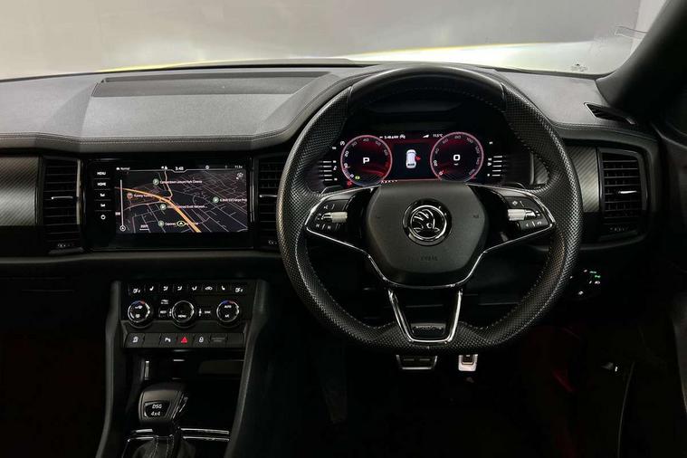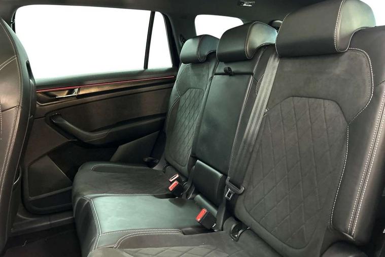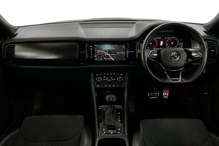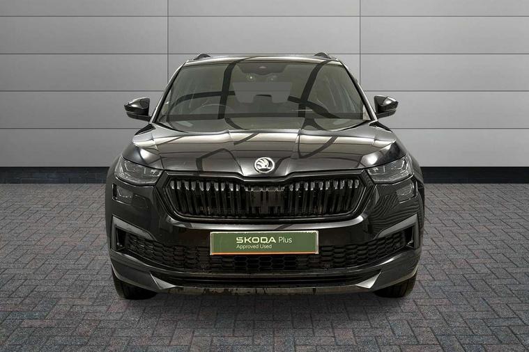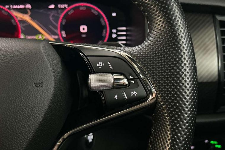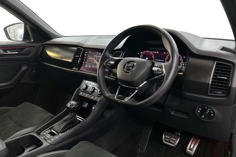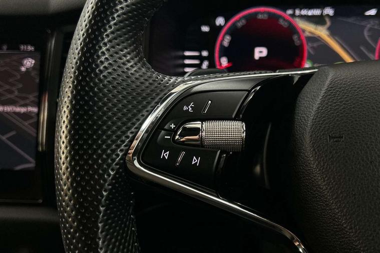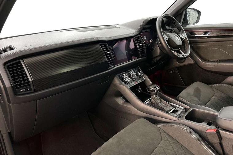 Bluetooth system, Columbus satellite navigation with 9.2" touchscreen, integrated Wi-Fi, web radio, Digital voice enhancement, E-call, ECO Stop/start function, Exterior temperature indicator, Progressive steering, Rear view camera, Smartlink wireless for apple carplay and wired for android auto, Speed limiter, USB C Port x 2 in front centre console, Wireless charging, 8 speakers, DAB Digital radio, Aero front windscreen wipers with intermittent function, Aero rear window wiper, Auto dimming rear view mirror, Black roof rails, Black sports styling including front grille and window surrounds, Black wheel arch surrounds, Body colour bumpers, Body colour door handles, Electric adjustable/heated/folding door mirrors, driver side auto dimming with boarding sports and memory function, Electric front and rear windows, Extended rear spoiler with finlets in gloss black, Front fog lights, Full LED matrix headlights with AFS (adaptive front light system), cornering function and AWL (all weather lighting system), Gloss black door mirrors, Headlight washers, Heated rear window, Invisible tailpipe, LED daytime running lights, LED rear fog light, LED third brake light in rear spoiler, Light assistant (coming/leaving home/tunnel light), Off-road style lower front bumper element, Privacy glass, Rain and light sensors, Rear diffuser, Rear LED lights (high functionality) with welcome effect and dynamic indicators, Rear side wing doors, Safety reflectors on front and rear doors, Sportline badge on front fender, Sports front and rear bumpers including lower rear chrome strip, Tailgate lettering in Black, Window control switches with black trim, Without engine designation, 12V socket in boot, 2 rails with 2 hooks, 2 seat bench in 3rd row, 3 seat bench in 2nd row, 4 foldable roof handles with rear coat hooks, 60:40 foldable rear seat with sliding adjustment and backrest angle adjustment, Aluminium pedals, Black roof headlining, Bottle holders in door panel in the 1.5 litre front and 1 litre rear, Cargo storage compartments, Chrome headlight control button, Chrome interior door handles, Coat hooks on B pillar, Covered storage compartment on driver side, Front centre armrest with storage compartment, cup holder and 12V socket, Front courtesy lights, Gear shift lever with chrome frame and black gloss insert, Grey stitching in front and rear armrests and door armrests + door inserts, Height adjustable front headrests, Illuminated and cooled glovebox, Illuminated luggage compartment, Isofix child seat fittings in outer rear seats with top tether, Manually adjustable steering column, Microsuede door panels, Net programme in boot (1x horizontal Net, 2x vertical Nets), Overhead glasses storage compartment, Pollen filter, Rear centre armrest with cupholders, Single front passenger seat, Sliding trunk cover, Small Bags on the inner sides of the front backrests, Sports seats, Sunvisors with illuminated vanity mirrors, Three rear height adjustable headrests, Ticket holder on A Pillar, Umbrella in door panel, Variable boot floor, LED Interior light pack - Kodiaq, Auto door release and activation of warning lights, Child locks on rear doors, Driver and front passenger airbag with knee airbag and front passenger airbag deactivation, Electronic parking brake with hill start assist, Emergency rear braking signal, ESC (incl. ABS+MSR+ASR+EDS+HBA+DSR+RBS+MKB), Front assist with autonomous emergency braking, Front side airbags with curtain airbags, Fuel cut off safety device, Height adjustable front 3 point seatbelts + pretensioners, Hill hold control, Rear disc brakes, Safety vest holder in door, Seat belt reminder for all seats, Tailgate unlocking from outside, Three point rear seat belts, Two tone horn, Tyre pressure monitor, Alarm with interior monitoring and tilt sensor with safe function, Anti-theft wheel bolts, Immobiliser, Keyless entry and start system (KESSY), Remote central locking with 2 keys, Black air vent surround, Carbon finish dashboard and door inserts, Grey stitching in dashboard, 20" Vega Anthracite alloy wheels, Temporary spare wheel (space saver),