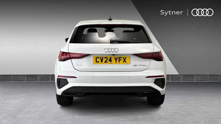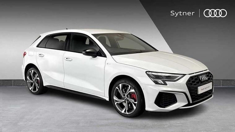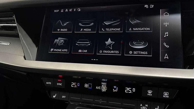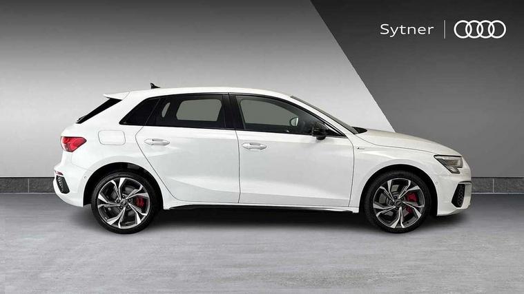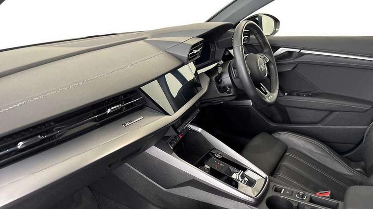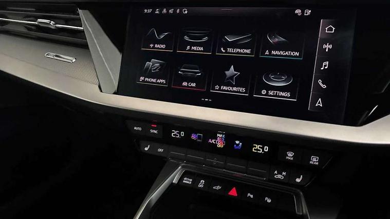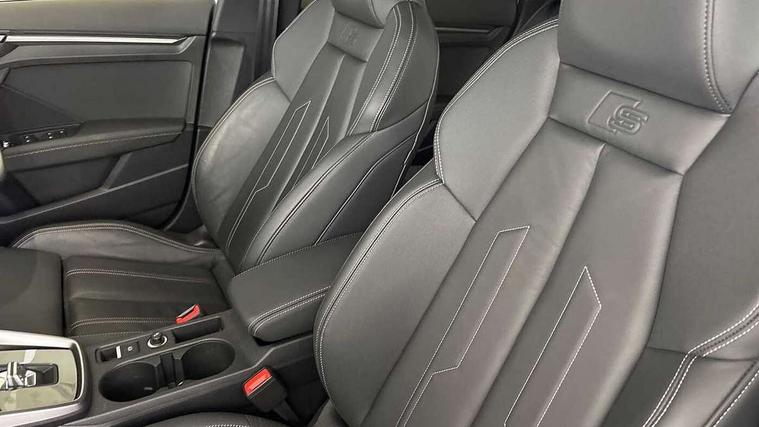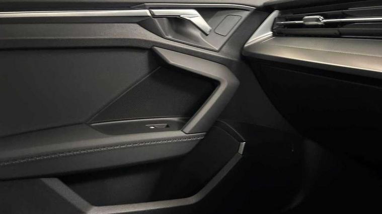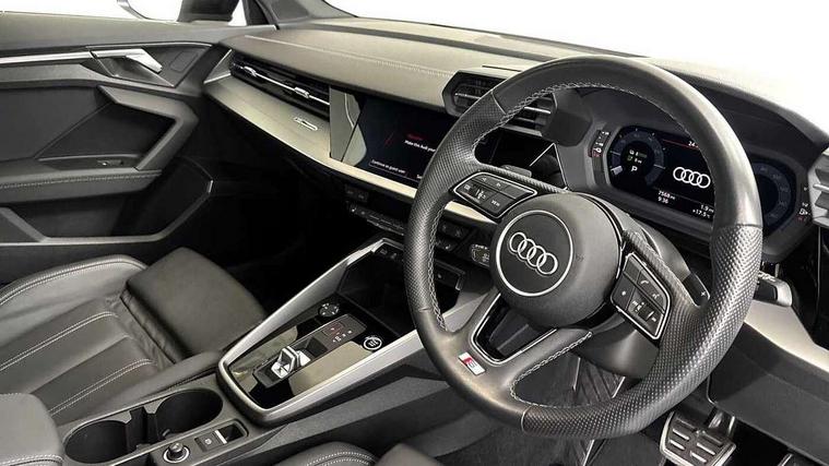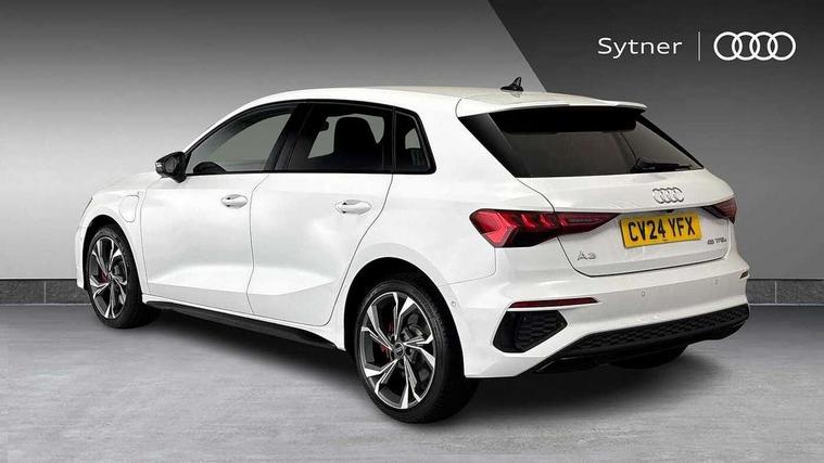 Audi drive select (Auto, Comfort, Dynamic, Efficiency and Individual), Audi smartphone interface, Audi Virtual Cockpit - 10.25" digital and colour instrument cluster, Automatic start/stop system with recuperation, Bluetooth interface, Camera based traffic sign recognition, Collision avoidance assistant, e-Call (emergency call), Electromechanical power speed sensitive steering, Lane departure warning system, MMI Navigation Plus with high resolution 10.1" colour touch screen display, Service indicator, Trip computer, Voice control system with natural language interaction, 2.9 kW On-board charger, 3 pin 10 amp domestic charging cable, Sports suspension, Type 2 mode 3 32 amp charging cable, Type 2 socket for AC charging, 2xUSB-C connection with data and charging functions, 6 passive loudspeakers, DAB Digital radio, 3rd brake light, Acoustic glass windscreen, Auto dimming frameless rear view mirror, Electrically adjustable/heated/folding/dimming door mirrors with kerb view includes integrated LED indications + kerb view function for passenger side, Front electric windows, Illuminated door sills with aluminium inserts at the front with S logo, LED daytime running lights, LED headlights with LED rear lights and dynamic rear indicators, Light and rain sensors, Privacy glass - dark tinted rear window, rear door and side windows, Rear electric windows, Rear side air outlets in grained matt black, Rear side wing doors, Rear wiper, S line bumpers, S roof spoiler, 12V socket and storage compartment in front centre console, 3 seat bench in 2nd row, 3 spoke leather multifunction steering wheel with paddle shift, 4 way electrically adjustable lumbar support for driver and front passenger, 60/40 split folding rear seat bench, Black cloth headlining, Dual zone electronic climate control, Front and rear centre armrest in artificial leather, Front and rear headrests, Front/rear floor mats, Height and reach adjustable steering wheel, Interior lighting - glove compartment light and right hand side, Luggage compartment floor covering, Manual boot compartment lid, Manually adjustable front seats, Seat side bolsters, Single front passenger seat, Stainless steel pedals and front footrest in black, Tool kit, Twin leather upholstery with front sports seats S embossed logo, Aluminium interior elements pack - A3 Sportback, Black styling pack - A3 Sportback, LED interior lighting pack - A3 Sportback, S line styling pack - A3 Sportback, 3x3 point rear seat belts, Driver and front passenger airbag with passenger airbag deactivation, Electronic Stabilisation Control (ESC) including ABS, ASR and EDL, First aid kit with warning triangle and 2 safety vests, Front side airbags with head airbags and interaction airbag, Pre-sense front with pedestrian and cyclist detection, Red brake calipers, Seatbelt monitoring, Tyre pressure loss indicator, Anti theft alarm, Anti-theft wheel bolts, Electronically operated child locks, Immobiliser, Remote control central locking, Dark spectrum aluminium inlays, accent surfaces in the dashboard and centre console in platinum grey silk effect paint finish, Tyre repair kit,